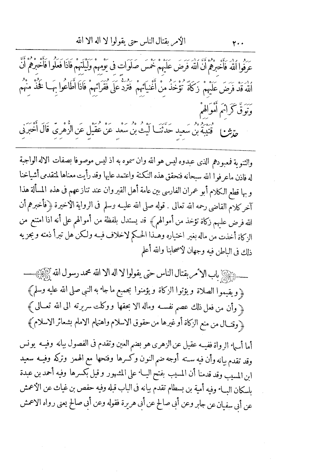 (باب الأمر بقتال النَّاسَ حَتَّى يَقُولُوا لَا إِلَهَ إِلَّا اللَّهُ مُحَمَّدٌ رَسُولُ اللَّهِ (ويقيموا الصلاة ويؤتوا الزكاة ويؤمنوا بجميع ما جاء به النبى صلى الله عليه وسلم) (وان من فعل ذلك عصم نفسه وماله الا بحقها ووكلت سريرته إلى الله تعالى) (وقتال من منع الزكاة أو غيرها من حقوق الاسلام واهتمام الامام بشعائر الاسلام) أَمَّا أَسْمَاءُ الرُّوَاةِ فَفِيهِ عُقَيْلٌ عَنِ الزُّهْرِيِّ هُوَ بِضَمِّ الْعَيْنِ وَتَقَدَّمَ فِي الْفُصُولِ بَيَانُهُ وَفِيهِ يُونُسُ وَقَدْ تَقَدَّمَ بَيَانُهُ وَأَنَّ فِيهِ سِتَّةَ أَوْجُهٍ ضَمُّ النُّونِ وَكَسْرِهَا وَفَتْحِهَا مَعَ الهمز وتركه وفيه سَعِيدُ بْنُ الْمُسَيَّبِ وَقَدْ قَدَّمْنَا أَنَّ الْمُسَيَّبَ بِفَتْحِ الْيَاءِ عَلَى الْمَشْهُورِ وَقِيلَ بِكَسْرِهَا وَفِيهِ أَحْمَدُ بْنُ عَبْدَةَ بِإِسْكَانِ الْبَاءِ وفِيهِ أُمَيَّةُ بْنُ بِسِطَامَ تَقَدَّمَ بَيَانُهُ فِي الْبَابِ قَبْلَهُ وفيه حَفْصُ بْنُ غِيَاثٍ عَنِ الْأَعْمَشِ عَنْ أَبِي سُفْيَانَ عَنْ جَابِرٍ وَعَنْ أَبِي صَالِحٍ عَنْ أبى هريرة فقوله وعن أَبِي صَالِحٍ يَعْنِي رَوَاهُ الْأَعْمَشُ)