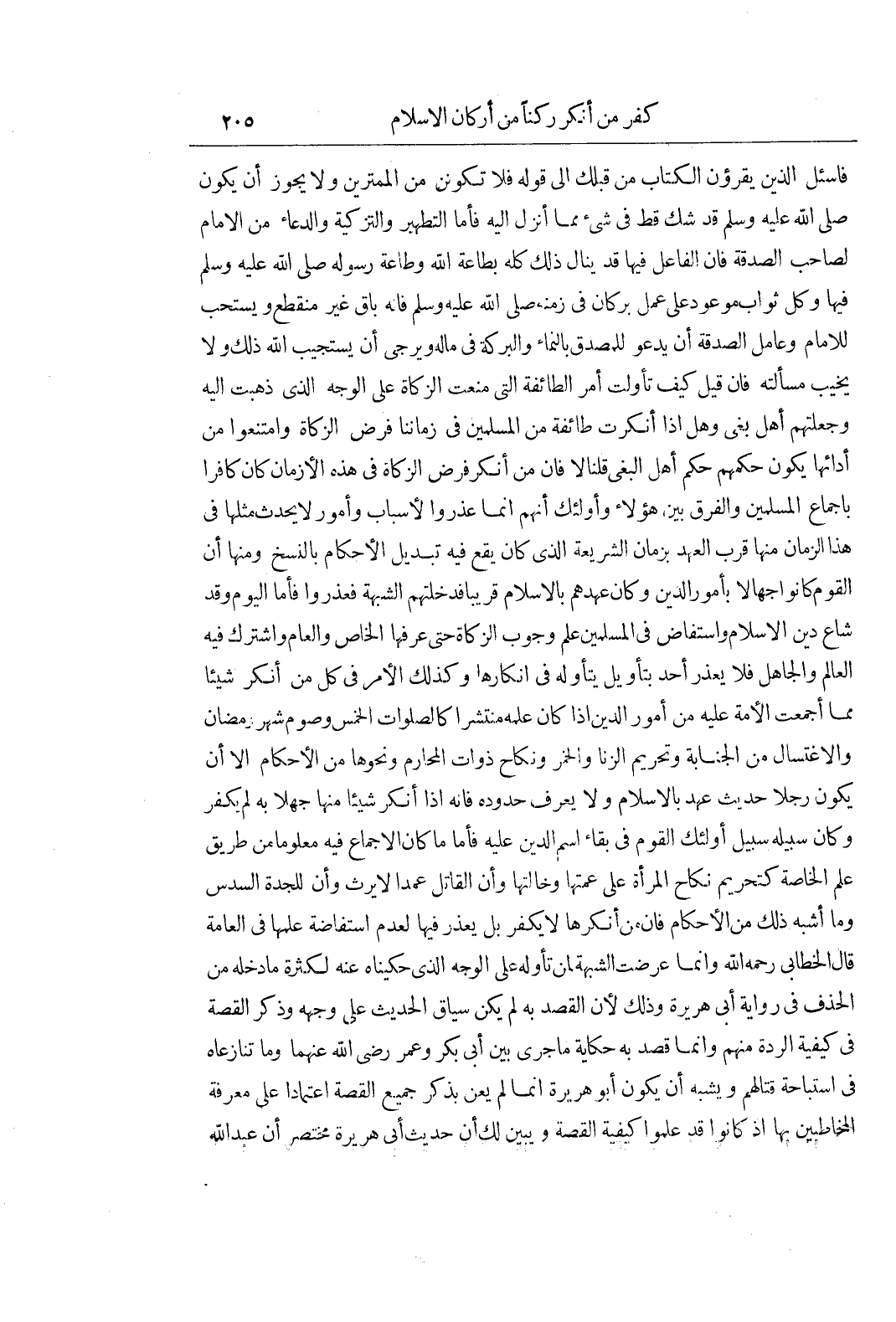 فاسئل الذين يقرؤن الكتاب من قبلك إلى قوله فلا تكونن من الممترين وَلَا يَجُوزُ أَنْ يَكُونَ صَلَّى اللَّهُ عَلَيْهِ وَسَلَّمَ قَدْ شَكَّ قَطُّ فِي شَيْءٍ مِمَّا أُنْزِلَ إِلَيْهِ فَأَمَّا التَّطْهِيرُ وَالتَّزْكِيَةُ وَالدُّعَاءُ مِنَ الْإِمَامِ لِصَاحِبِ الصَّدَقَةِ فَإِنَّ الْفَاعِلَ فِيهَا قَدْ يَنَالُ ذَلِكَ كُلَّهُ بِطَاعَةِ اللَّهِ وَطَاعَةِ رَسُولِهِ صَلَّى اللَّهُ عَلَيْهِ وَسَلَّمَ فِيهَا وَكُلُّ ثَوَابٍ موعود على عمل بر كَانَ فِي زَمَنِهِ صَلَّى اللَّهُ عَلَيْهِ وَسَلَّمَ فَإِنَّهُ بَاقٍ غَيْرُ مُنْقَطِعٍ وَيُسْتَحَبُّ لِلْإِمَامِ وَعَامِلِ الصَّدَقَةِ أَنْ يَدْعُوَ لِلْمُصَّدِّقِ بِالنَّمَاءِ وَالْبَرَكَةِ فِي مَالِهِ وَيُرْجَى أَنْ يَسْتَجِيبَ اللَّهُ ذَلِكَ وَلَا يُخَيِّبَ مَسْأَلَتَهُ فَإِنْ قِيلَ كَيْفَ تَأَوَّلْتَ أَمْرَ الطَّائِفَةِ الَّتِي مَنَعَتِ الزَّكَاةَ عَلَى الْوَجْهِ الَّذِي ذَهَبْتَ إِلَيْهِ وَجَعَلْتَهُمْ أَهْلَ بَغْيٍ وَهَلْ إِذَا أَنْكَرَتْ طَائِفَةٌ مِنَ الْمُسْلِمِينَ فِي زَمَانِنَا فَرْضَ الزَّكَاةِ وَامْتَنَعُوا مِنْ أَدَائِهَا يَكُونُ حُكْمُهُمْ حُكْمَ أَهْلِ الْبَغْيِ قُلْنَا لَا فَإِنَّ مَنْ أَنْكَرَ فَرْضَ الزَّكَاةِ فِي هَذِهِ الْأَزْمَانِ كَانَ كَافِرًا بِإِجْمَاعِ الْمُسْلِمِينَ وَالْفَرْقُ بَيْنَ هَؤُلَاءِ وَأُولَئِكَ أَنَّهُمْ إِنَّمَا عُذِرُوا لِأَسْبَابٍ وَأُمُورٍ لَا يَحْدُثُ مِثْلُهَا فِي هَذَا الزَّمَانِ مِنْهَا قُرْبُ الْعَهْدِ بِزَمَانِ الشَّرِيعَةِ الَّذِي كَانَ يَقَعُ فِيهِ تَبْدِيلُ الْأَحْكَامِ بِالنَّسْخِ وَمِنْهَا أَنَّ الْقَوْمَ كَانُوا جُهَّالًا بِأُمُورِ الدِّينِ وَكَانَ عَهْدُهُمْ بِالْإِسْلَامِ قَرِيبًا فَدَخَلَتْهُمُ الشُّبْهَةُ فَعُذِرُوا فَأَمَّا الْيَوْمَ وَقَدْ شَاعَ دِينُ الْإِسْلَامِ وَاسْتَفَاضَ فِي الْمُسْلِمِينَ عِلْمُ وُجُوبِ الزَّكَاةِ حَتَّى عَرَفَهَا الْخَاصُّ وَالْعَامُّ وَاشْتَرَكَ فِيهِ الْعَالِمُ وَالْجَاهِلُ فَلَا يُعْذَرُ أَحَدٌ بِتَأْوِيلٍ يَتَأَوَّلُهُ فِي إِنْكَارِهَا وَكَذَلِكَ الْأَمْرُ فِي كُلِّ مَنْ أَنْكَرَ شَيْئًا مِمَّا أَجْمَعَتِ الْأُمَّةُ عَلَيْهِ مِنْ أُمُورِ الدِّينِ إِذَا كَانَ عِلْمُهُ مُنْتَشِرًا كَالصَّلَوَاتِ الْخَمْسِ وَصَوْمِ شَهْرِ رمضان والاغتسال من الجنابة وتحريم الزنى وَالْخَمْرِ وَنِكَاحِ ذَوَاتِ الْمَحَارِمِ وَنَحْوِهَا مِنَ الْأَحْكَامِ إِلَّا أَنْ يَكُونَ رَجُلًا حَدِيثَ عَهْدٍ بِالْإِسْلَامِ وَلَا يَعْرِفُ حُدُودَهُ فَإِنَّهُ إِذَا أَنْكَرَ شَيْئًا مِنْهَا جَهْلًا بِهِ لَمْ يَكْفُرْ وَكَانَ سَبِيلُهُ سَبِيلَ أُولَئِكَ الْقَوْمِ فِي بَقَاءِ اسْمِ الدِّينِ عَلَيْهِ فَأَمَّا مَا كَانَ الْإِجْمَاعُ فِيهِ مَعْلُومًا مِنْ طَرِيقِ عِلْمِ الْخَاصَّةِ كَتَحْرِيمِ نِكَاحِ الْمَرْأَةِ عَلَى عَمَّتِهَا وَخَالَتِهَا وَأَنَّ الْقَاتِلَ عَمْدًا لَا يَرِثُ وَأَنَّ لِلْجَدَّةِ السُّدُسَ وَمَا أَشْبَهَ ذَلِكَ مِنَ الْأَحْكَامِ فَإِنَّ مَنْ أَنْكَرَهَا لَا يَكْفُرُ بَلْ يُعْذَرُ فِيهَا لِعَدَمِ اسْتِفَاضَةِ عِلْمِهَا فِي الْعَامَّةِ قَالَ الْخَطَّابِيُّ رَحِمَهُ اللَّهُ وَإِنَّمَا عَرَضَتِ الشُّبْهَةُ لِمَنْ تَأَوَّلَهُ عَلَى الْوَجْهِ الَّذِي حَكَيْنَاهُ عَنْهُ لِكَثْرَةِ مَا دَخَلَهُ مِنَ الْحَذْفِ فِي رِوَايَةِ أَبِي هُرَيْرَةَ وَذَلِكَ لِأَنَّ الْقَصْدَ بِهِ لَمْ يَكُنْ سِيَاقُ الْحَدِيثِ عَلَى وَجْهِهِ وَذَكَرَ الْقِصَّةَ فِي كَيْفِيَّةِ الرِّدَّةِ مِنْهُمْ وَإِنَّمَا قُصِدَ بِهِ حِكَايَةُ مَا جَرَى بَيْنَ أَبِي بَكْرٍ وَعُمَرَ رَضِيَ اللَّهُ عَنْهُمَا وَمَا تَنَازَعَاهُ فِي اسْتِبَاحَةِ قِتَالِهِمْ وَيُشْبِهُ أَنْ يَكُونَ أَبُو هُرَ