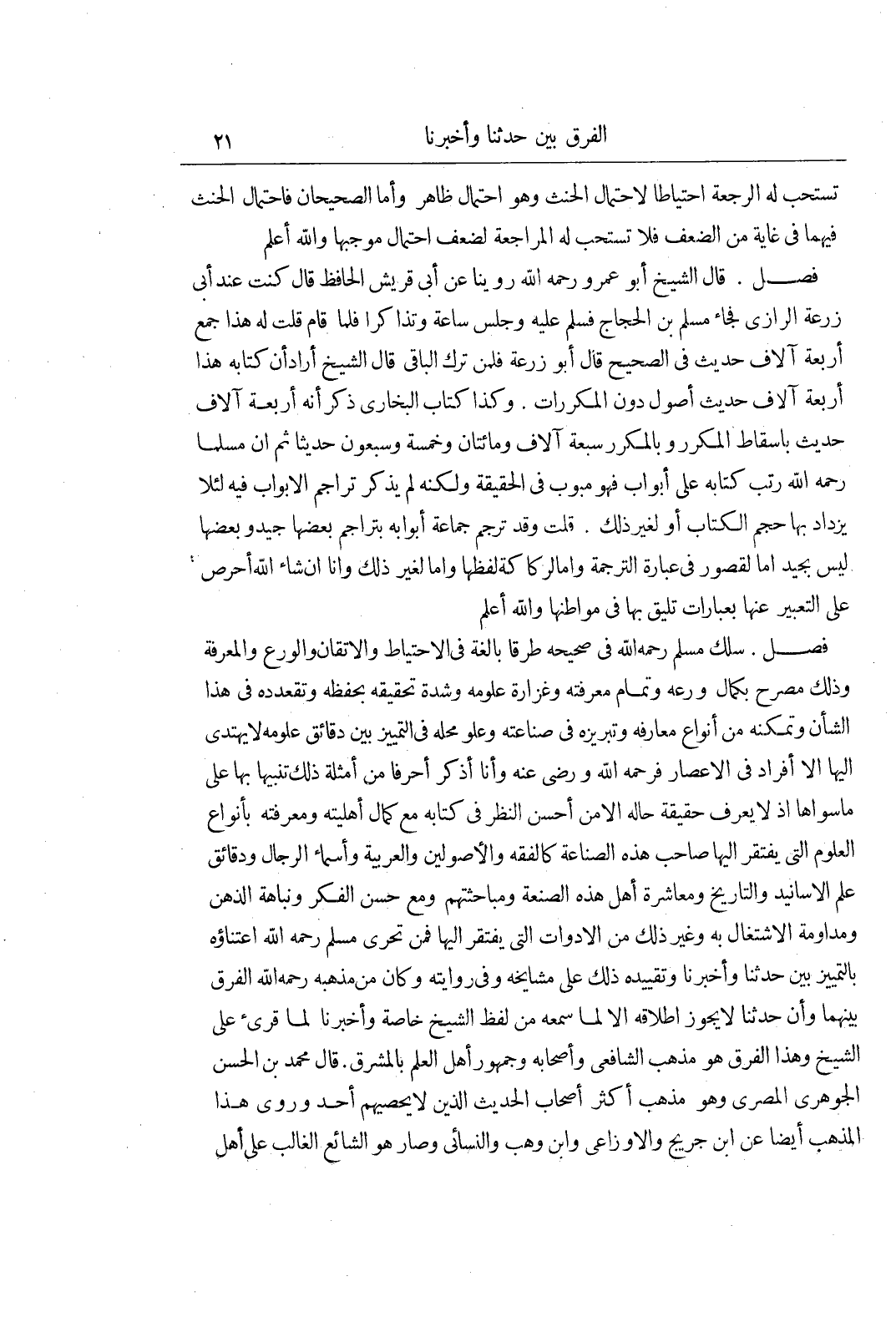 قال الشيخ أبو عمرو رحمه الله روينا عن أبي قريش الحافظ قال كنت عند أبي زرعة الرازي فجاء مسلم بن الحجاج فسلم عليه وجلس ساعة وتذاكرا فلما قام قلت له هذا جمع أربعة آلاف حديث في الصحيح قال أبو زرعة فلمن ترك الباقي قال الشيخ أراد أن كتابه هذا أربعة آلاف حديث أصول دون المكررات وكذا كتاب البخاري ذكر أنه أربعة آلاف حديث باسقاط المكرر وبالمكرر سبعة آلاف ومائتان وخمسة وسبعون حديثا ثم ان مسلما رحمه الله رتب كتابه على أبواب فهو مبوب في الحقيقة ولكنه لم يذكر تراجم الابواب فيه لئلا يزداد بها حجم الكتاب أو لغير ذلك قلت وقد ترجم جماعة أبوابه بتراجم بعضها جيد وبعضها ليس بجيد إما لقصور في عبارة الترجمة واما لركاكة لفظها واما لغير ذلك وانا ان شاء الله أحرص على التعبير عنها بعبارات تلييق بها في مواطنها والله أعلم فصل سلك مسلم رحمه الله في صحيحه طرقا بالغة في الاحتياط والاتقان والورع والمعرفة وذلك مصرح بكمال ورعة وتمام معرفته وغزارة علومه وشدة تحقيقه بحفظه وتقعدده في هذا الشأن وتمكنه من أنواع معارفه وتبريزه في صناعته وعلو محله في التمييز بين دقائق علومه لا يهتدي اليها الا أفراد في الاعصار فرحمه الله ورضى عنه وأنا أذكره أحرفا من أمثلة ذلك تنبيها بها على ماسواها اذ لا يعرف حقيقة حاله الا من أحسن النظر في كتابه مع كمال أهليته ومعرفته بأنواع العلوم التي يفتقر اليها صاحب هذه الصناعة كالفقه والأصولين والعربية وأسماء الرجال ودقائق علم الاسانيد والتاريخ ومعاشرة أهل هذه الصنعة ومباحثتهم ومع حسن الفكر ونباهة الذهن ومداومة الاشتغال به وغير ذلك من الادوات التي يفتقر اليها فمن تحري مسلم رحمه الله اعتناؤه بالتمييز بين حدثنا وأخبرنا وتقييده ذلك على مشايخه وفي روايته وكان من مذهبه رحمه الله الفرق بينهما وأن حدثنا لا يجوز اطلاقه الا لما سمعه من لفظ الشيخ خاصة وأخبرنا لما قرئ على الشيخ وهذا الفرق هو مذهب الشافعي وأصحابه وجمهور أهل العلم بالمشرق قال محمد بن الحسن الجوهري المصري وهو مذهب أكثر أصحاب الحديث الذين لا يحصيهم أحد وروى هذا المذهب أيضا عن بن جريج والاوزاعي وبن وهب والنسائي وصار هو الشائع الغالب على أهل