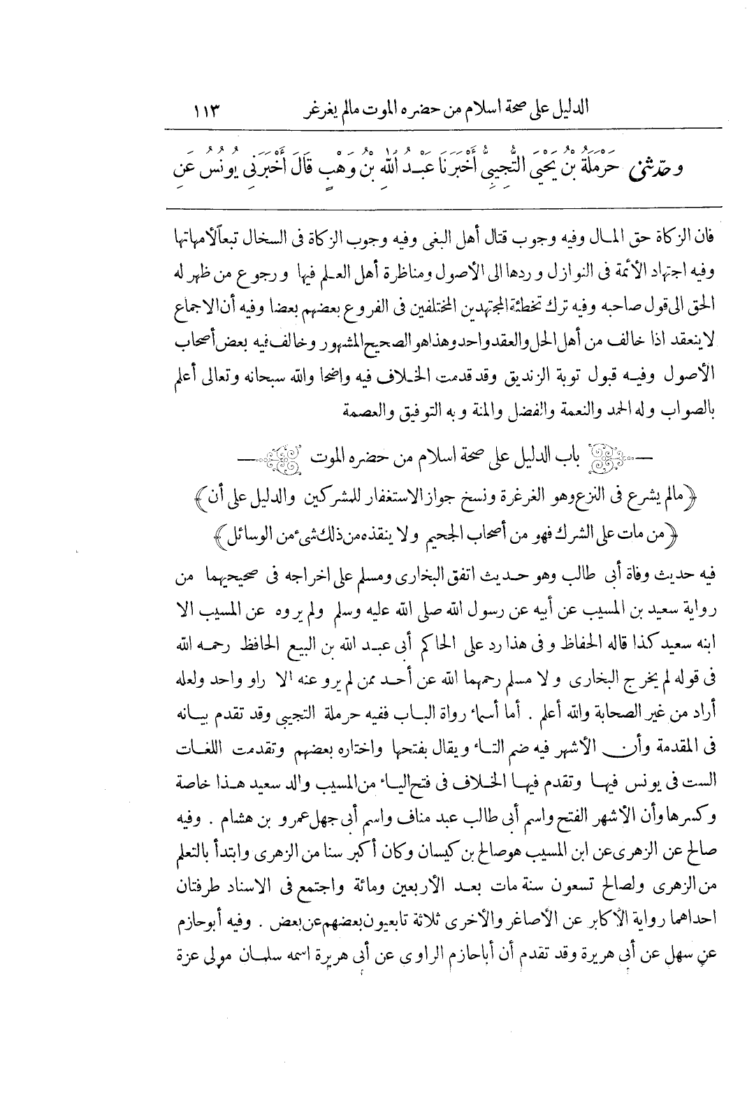 (باب الدَّلِيلِ عَلَى صِحَّةِ إِسْلَامِ مَنْ حَضَرَهُ الْمَوْتُ (ما لم يشرع فى النزع وهو الْغَرْغَرَةِ وَنَسْخِ جَوَازِ الِاسْتِغْفَارِ لِلْمُشْرِكِينَ وَالدَّلِيلِ عَلَى أَنَّ) (مَنْ مَاتَ عَلَى الشِّرْكِ فَهُوَ مِنْ أَصْحَابِ الْجَحِيمِ وَلَا يُنْقِذُهُ مِنْ ذَلِكَ شَيْءٌ مِنَ الْوَسَائِلِ) فِيهِ حَدِيثُ وَفَاةِ أَبِي طَالِبٍ وَهُوَ حَدِيثٌ اتَّفَقَ الْبُخَارِيُّ وَمُسْلِمٌ عَلَى إِخْرَاجِهِ فِي صَحِيحَيْهِمَا مِنْ رِوَايَةِ سَعِيدِ بْنِ الْمُسَيَّبِ عَنْ أَبِيهِ عَنْ رَسُولِ اللَّهِ صَلَّى اللَّهُ عَلَيْهِ وَسَلَّمَ وَلَمْ يَرْوِهِ عَنِ الْمُسَيَّبِ إِلَّا ابْنُهُ سَعِيدٌ كَذَا قَالَهُ الْحُفَّاظُ وَفِي هَذَا رَدٌّ عَلَى الْحَاكِمِ أَبِي عَبْدِ اللَّهِ بْنِ البيع الْحَافِظِ رَحِمَهُ اللَّهُ فِي قَوْلِهِ لَمْ يُخَرِّجِ الْبُخَارِيُّ وَلَا مُسْلِمٌ رَحِمَهُمَا اللَّهُ عَنْ أَحَدٍ مِمَّنْ لَمْ يَرْوِ عَنْهُ إِلَّا رَاوٍ وَاحِدٌ وَلَعَلَّهُ أَرَادَ مِنْ غَيْرِ الصَّحَابَةِ وَاللَّهُ أَعْلَمُ أَمَّا أَسْمَاءُ رُوَاةِ الْبَابِ فَفِيهِ حَرْمَلَةُ التُّجِيبِيُّ وَقَدْ تَقَدَّمَ بَيَانُهُ فِي الْمُقَدِّمَةِ وَأَنَّ الْأَشْهَرَ فِيهِ ضَمُّ التَّاءِ وَيُقَالُ بِفَتْحِهَا وَاخْتَارَهُ بَعْضُهُمْ وَتَقَدَّمَتِ اللُّغَاتُ السِّتُّ فِي يُونُسَ فِيهَا وَتَقَدَّمَ فِيهَا الْخِلَافُ فِي فَتْحِ الْيَاءِ مِنَ الْمُسَيَّبِ وَالِدِ سَعِيدٍ هَذَا خَاصَّةً وَكَسْرِهَا وَأَنَّ الْأَشْهَرَ الْفَتْحُ وَاسْمُ أَبِي طَالِبٍ عَبْدُ مَنَافٍ وَاسْمُ أَبِي جَهْلٍ عَمْرُو بْنُ هِشَامٍ وَفِيهِ صَالِحٌ عن الزهري عن بن الْمُسَيَّبِ هُوَ صَالِحُ بْنُ كَيْسَانَ وَكَانَ أَكْبَرَ سِنًّا مِنَ الزُّهْرِيِّ وَابْتَدَأَ بِالتَّعَلُّمِ مِنَ الزُّهْرِيِّ وَلِصَالِحٍ تِسْعُونَ سَنَةً مَاتَ بَعْدَ الْأَرْبَعِينَ وَمِائَةٍ وَاجْتَمَعَ فِي الْإِسْنَادِ طُرْفَتَانِ إِحْدَاهُمَا رِوَايَةُ الْأَكَابِرِ عَنِ الْأَصَاغِرِ وَالْأُخْرَى ثَلَاثَةٌ تَابِعِيُّونَ بَعْضُهُمْ عَنْ بَعْضٍ وَفِيهِ أَبُو حَازِمٍ عَنْ سَهْلٍ عَنْ أَبِي هُرَيْرَةَ وَقَدْ تَقَدَّمَ أَنَّ أَبَا حَازِمٍ الرَّاوِي عَنْ أَبِي هُرَيْرَةَ اسْمُهُ سَلْمَانُ مَوْلَى عزة)