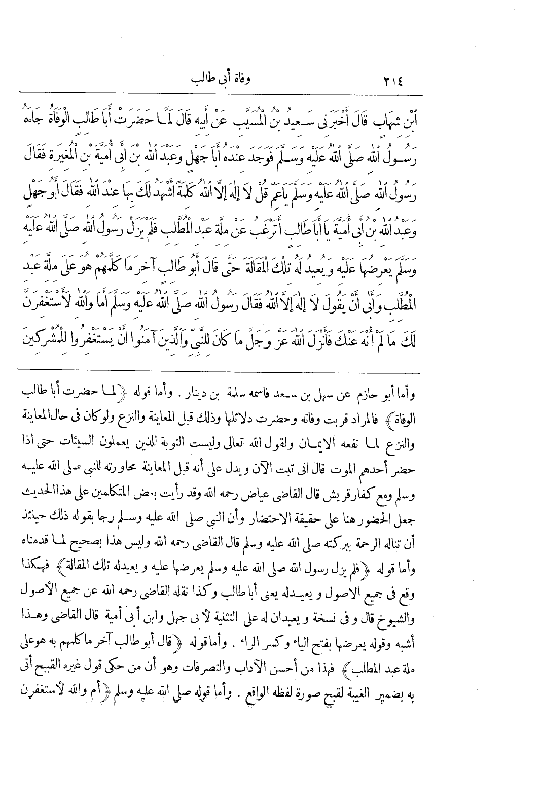 وَأَمَّا أَبُو حَازِمٍ عَنْ سَهْلِ بْنِ سَعْدٍ فَاسْمُهُ سَلَمَةُ بْنُ دِينَارٍ وَأَمَّا قَوْلُهُ (لَمَّا حَضَرَتْ أَبَا طَالِبٍ الْوَفَاةُ) فَالْمُرَادُ قَرُبَتْ وَفَاتُهُ وَحَضَرَتْ دَلَائِلُهَا وَذَلِكَ قَبْلَ الْمُعَايَنَةِ وَالنَّزْعِ وَلَوْ كَانَ فِي حَالِ الْمُعَايَنَةِ وَالنَّزْعِ لَمَا نَفَعَهُ الْإِيمَانُ وَلِقَوْلِ اللَّهِ تَعَالَى وَلَيْسَتِ التَّوْبَةُ لِلَّذِينَ يَعْمَلُونَ السَّيِّئَاتِ حَتَّى إِذَا حَضَرَ أَحَدَهُمُ الْمَوْتُ قال انى تبت الآن وَيَدُلُّ عَلَى أَنَّهُ قَبْلَ الْمُعَايَنَةِ مُحَاوَرَتُهُ لِلنَّبِيِّ صَلَّى اللَّهُ عَلَيْهِ وَسَلَّمَ وَمَعَ كُفَّارِ قُرَيْشٍ قَالَ الْقَاضِي عِيَاضٌ رَحِمَهُ اللَّهُ وَقَدْ رَأَيْتُ بَعْضَ الْمُتَكَلِّمِينَ عَلَى هَذَا الْحَدِيثِ جَعَلَ الْحُضُورَ هُنَا عَلَى حَقِيقَةِ الِاحْتِضَارِ وَأَنَّ النَّبِيَّ صَلَّى اللَّهُ عَلَيْهِ وَسَلَّمَ رَجَا بِقَوْلِهِ ذَلِكَ حِينَئِذٍ أَنْ تَنَالَهُ الرَّحْمَةُ بِبَرَكَتِهِ صَلَّى اللَّهُ عَلَيْهِ وَسَلَّمَ قَالَ الْقَاضِي رَحِمَهُ اللَّهُ وَلَيْسَ هَذَا بِصَحِيحٍ لِمَا قَدَّمْنَاهُ وَأَمَّا قَوْلُهُ (فَلَمْ يَزَلْ رَسُولُ اللَّهِ صَلَّى اللَّهُ عَلَيْهِ وَسَلَّمَ يَعْرِضُهَا عليه ويعيد له تلك المقالة) فَهَكَذَا وَقَعَ فِي جَمِيعِ الْأُصُولِ وَيُعِيدُ لَهُ يَعْنِي أَبَا طَالِبٍ وَكَذَا نَقَلَهُ الْقَاضِي رَحِمَهُ اللَّهُ عَنْ جَمِيعِ الْأُصُولِ وَالشُّيُوخِ قَالَ وَفِي نُسْخَةٍ وَيُعِيدَانِ لَهُ عَلَى التَّثْنِيَةِ لِأَبِي جَهْلٍ وبن أَبِي أُمَيَّةَ قَالَ الْقَاضِي وَهَذَا أَشْبَهُ وَقَوْلُهُ يَعْرِضُهَا بِفَتْحِ الْيَاءِ وَكَسْرِ الرَّاءِ وَأَمَّا قَوْلُهُ (قَالَ أَبُو طَالِبٍ آخِرَ مَا كَلَّمَهُمْ بِهِ هُوَ عَلَى مِلَّةِ عَبْدِ الْمُطَّلِبِ) فَهَذَا مِنْ أَحْسَنِ الْآدَابِ وَالتَّصَرُّفَاتِ وَهُوَ أَنَّ مَنْ حَكَى قَوْلَ غَيْرِهِ الْقَبِيحَ أَتَى بِهِ بِضَمِيرِ الْغَيْبَةِ لِقُبْحِ صُورَةِ لَفْظِهِ الْوَاقِعِ وَأَمَّا قَوْلُهُ صَلَّى اللَّهُ عَلَيْهِ وَسَلَّمَ (أَمْ وَاللَّهِ لَأَسْتَغْفِرَنَّ