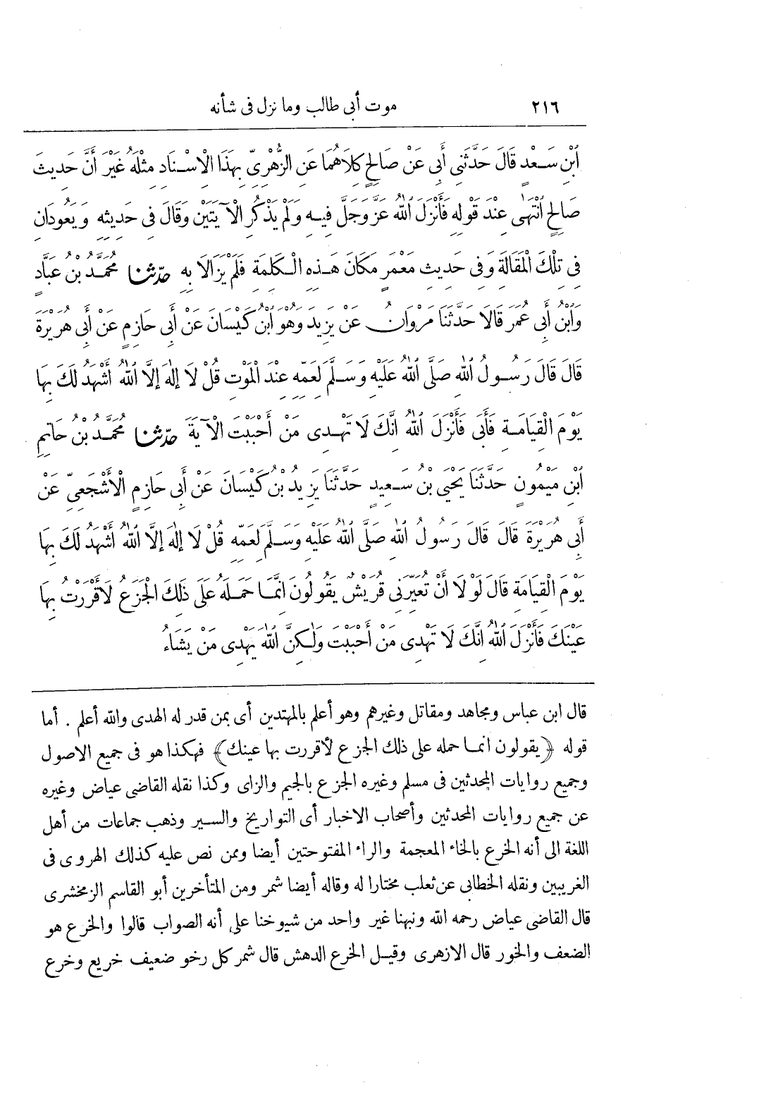 قال بن عَبَّاسٍ وَمُجَاهِدٌ وَمُقَاتِلٌ وَغَيْرُهُمْ وَهُوَ أَعْلَمُ بِالْمُهْتَدِينَ أَيْ بِمَنْ قُدِّرَ لَهُ الْهُدَى وَاللَّهُ أَعْلَمُ أَمَّا قَوْلُهُ (يَقُولُونَ إِنَّمَا حَمَلَهُ عَلَى ذَلِكَ الْجَزَعُ لَأَقْرَرْتُ بِهَا عَيْنَكَ) فَهَكَذَا هُوَ فِي جَمِيعِ الْأُصُولِ وَجَمِيعِ رِوَايَاتِ الْمُحَدِّثِينَ فِي مُسْلِمٍ وَغَيْرِهِ الْجَزَعُ بِالْجِيمِ وَالزَّايِ وَكَذَا نَقَلَهُ الْقَاضِي عِيَاضٌ وَغَيْرُهُ عَنْ جَمِيعِ رِوَايَاتِ الْمُحَدِّثِينَ وَأَصْحَابِ الْأَخْبَارِ أَيِ التَّوَارِيخِ وَالسِّيَرِ وَذَهَبَ جَمَاعَاتٌ مِنْ أَهْلِ اللُّغَةِ إِلَى أَنَّهُ الْخَرَعُ بِالْخَاءِ الْمُعْجَمَةِ وَالرَّاءِ الْمَفْتُوحَتَيْنِ أَيْضًا وَمِمَّنْ نَصَّ عَلَيْهِ كَذَلِكَ الْهَرَوِيُّ فِي الْغَرِيبَيْنِ وَنَقَلَهُ الْخَطَّابِيُّ عَنْ ثَعْلَبٍ مُخْتَارًا لَهُ وَقَالَهُ أَيْضًا شِمْرٌ وَمَنَ الْمُتَأَخِّرِينَ أَبُو الْقَاسِمِ الزَّمَخْشَرِيُّ قَالَ الْقَاضِي عِيَاضٌ رَحِمَهُ اللَّهُ وَنَبَّهَنَا غَيْرُ وَاحِدٍ مِنْ شُيُوخِنَا عَلَى أَنَّهُ الصَّوَابُ قَالُوا وَالْخَرَعُ هُوَ الضَّعْفُ وَالْخَوَرُ قَالَ الْأَزْهَرِيُّ وَقِيلَ الْخَرَعُ الدَّهَشُ قَالَ شِمْرٌ كُلُّ رَخْوٍ ضَعِيفٍ خَرِيعٌ وَخَرِعٌ