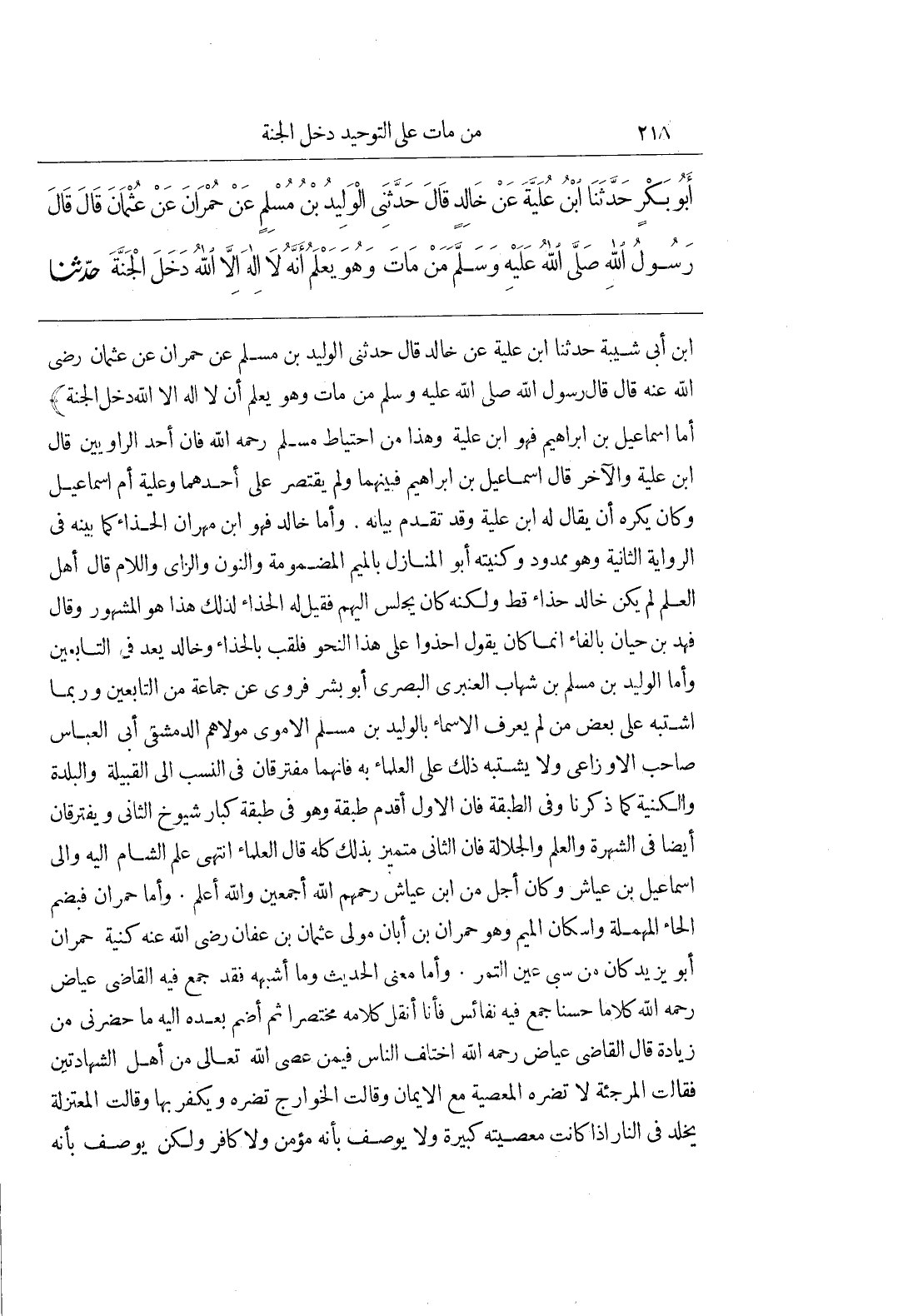 بن أبى شيبة حدثنا بن عُلَيَّةَ عَنْ خَالِدٍ قَالَ حَدَّثَنِي الْوَلِيدُ بْنُ مُسْلِمٍ عَنْ حُمْرَانَ عَنْ عُثْمَانَ رَضِيَ اللَّهُ عَنْهُ قَالَ قَالَ رَسُولُ اللَّهِ صَلَّى اللَّهُ عَلَيْهِ وَسَلَّمَ مَنْ مَاتَ وَهُوَ يَعْلَمُ أَنْ لَا إِلَهَ إِلَّا اللَّهُ دَخَلَ الْجَنَّةَ) أَمَّا إسماعيل بن ابراهيم فهو بن عُلَيَّةَ وَهَذَا مِنَ احْتِيَاطِ مُسْلِمٍ رَحِمَهُ اللَّهُ فان أحد الراويين قال بن عُلَيَّةَ وَالْآخَرَ قَالَ إِسْمَاعِيلُ بْنُ إِبْرَاهِيمَ فَبَيَّنَهُمَا ولم يقتصر على أحدهما وعلية أُمُّ إِسْمَاعِيلَ وَكَانَ يَكْرَهُ أَنْ يُقَالَ لَهُ بن عُلَيَّةَ وَقَدْ تَقَدَّمَ بَيَانُهُ وَأَمَّا خَالِدٌ فَهُوَ بن مِهْرَانَ الْحَذَّاءُ كَمَا بَيَّنَهُ فِي الرِّوَايَةِ الثَّانِيَةِ وَهُوَ مَمْدُودٌ وَكُنْيَتُهُ أَبُو الْمَنَازِلِ بِالْمِيمِ الْمَضْمُومَةِ وَالنُّونِ وَالزَّايِ وَاللَّامِ قَالَ أَهْلُ الْعِلْمِ لَمْ يَكُنْ خَالِدٌ حَذَّاءً قَطُّ وَلَكِنَّهُ كَانَ يَجْلِسُ إِلَيْهِمْ فَقِيلَ لَهُ الْحَذَّاءُ لِذَلِكَ هَذَا هُوَ الْمَشْهُورُ وَقَالَ فَهْدُ بْنُ حَيَّانَ بِالْفَاءِ إِنَّمَا كان يقول أحذوا على هذا النحو فلقب بِالْحَذَّاءِ وَخَالِدٌ يُعَدُّ فِي التَّابِعِينَ وَأَمَّا الْوَلِيدُ بْنُ مُسْلِمِ بْنِ شِهَابٍ الْعَنْبَرِيُّ الْبَصْرِيُّ أَبُو بِشْرٍ فَرَوَى عَنْ جَمَاعَةٍ مِنَ التَّابِعِينَ وَرُبَّمَا اشْتَبَهَ عَلَى بَعْضِ مَنْ لَمْ يَعْرِفِ الْأَسْمَاءَ بِالْوَلِيدِ بْنِ مُسْلِمٍ الْأُمَوِيِّ مَوْلَاهُمُ الدِّمَشْقِيِّ أَبِي الْعَبَّاسِ صَاحِبِ الْأَوْزَاعِيِّ وَلَا يَشْتَبِهُ ذَلِكَ عَلَى الْعُلَمَاءِ بِهِ فَإِنَّهُمَا مُفْتَرِقَانِ فِي النَّسَبِ إِلَى الْقَبِيلَةِ وَالْبَلْدَةِ وَالْكُنْيَةِ كَمَا ذَكَرْنَا وَفِي الطَّبَقَةِ فَإِنَّ الْأَوَّلَ أَقْدَمُ طَبَقَةً وَهُوَ فِي طَبَقَةِ كِبَارِ شُيُوخِ الثَّانِي وَيَفْتَرِقَانِ أَيْضًا فِي الشُّهْرَةِ والعلم والجلالة فان الثانى متميز بذلك كُلِّهِ قَالَ الْعُلَمَاءُ انْتَهَى عِلْمُ الشَّامِ إِلَيْهِ وَإِلَى إِسْمَاعِيلَ بْنِ عَيَّاشٍ وَكَانَ أَجَلَّ مِنِ بن عَيَّاشٍ رَحِمَهُمُ اللَّهُ أَجْمَعِينَ وَاللَّهُ أَعْلَمُ وَأَمَّا حُمْرَانُ فَبِضَمِّ الْحَاءِ الْمُهْمَلَةِ وَإِسْكَانِ الْمِيمِ وَهُوَ حُمْرَانُ بْنُ أَبَانٍ مَوْلَى عُثْمَانَ بْنِ عَفَّانٍ رضى الله عنه كنية حمران أبو يزيد كَانَ مِنْ سَبْيِ عَيْنِ التَّمْرِ وَأَمَّا مَعْنَى الْحَدِيثِ وَمَا أَشْبَهَهُ فَقَدْ جَمَعَ فِيهِ الْقَاضِي عِيَاضٌ رَحِمَهُ اللَّهُ كَلَامًا حَسَنًا جَمَعَ فِيهِ نَفَائِسَ فَأَنَا أَنْقُلُ كَلَامَهُ مُخْتَصَرًا ثُمَّ أَضُمُّ بَعْدَهُ إِلَيْهِ مَا حَضَرَنِي مِنْ زِيَادَةٍ قَالَ الْقَاضِي عِيَاضٌ رَحِمَهُ اللَّهُ اخْتَلَفَ النَّاسُ فِيمَنْ عَصَى اللَّهَ تَعَالَى مِنْ أَهْلِ الشَّهَادَتَيْنِ فَقَالَتِ الْمُرْجِئَةُ لَا تَضُرُّهُ الْمَعْصِيَةُ مَعَ الْإِيمَانِ وَقَالَتِ الْخَوَارِجُ تَضُرُّهُ وَيَكْفُرُ بِهَا وَقَالَتِ الْمُعْتَزِلَةُ يَخْلُدُ فِي النَّارِ إِذَا كَانَتْ مَعْصِيَتُهُ كَبِيرَةً وَلَا يُوصَفُ بِأَنَّهُ مُؤْمِنٌ وَلَا كَافِرٌ وَلَكِنْ يُوصَفُ بأنه