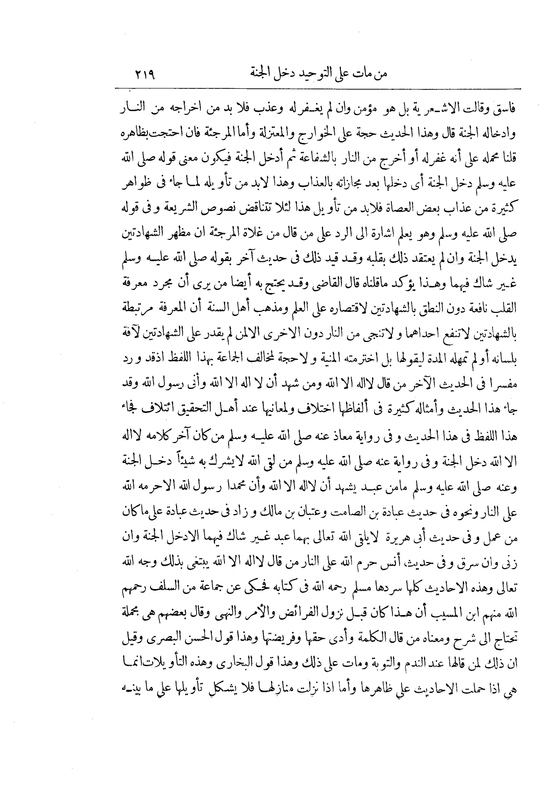 فَاسِقٌ وَقَالَتِ الْأَشْعَرِيَّةُ بَلْ هُوَ مُؤْمِنٌ وَإِنْ لَمْ يُغْفَرْ لَهُ وَعُذِّبَ فَلَا بُدَّ مِنْ إِخْرَاجِهِ مِنَ النَّارِ وَإِدْخَالِهِ الْجَنَّةَ قَالَ وَهَذَا الْحَدِيثُ حُجَّةٌ عَلَى الْخَوَارِجِ وَالْمُعْتَزِلَةِ وَأَمَّا الْمُرْجِئَةُ فَإِنِ احْتَجَّتْ بِظَاهِرِهِ قُلْنَا مَحْمَلُهُ عَلَى أَنَّهُ غُفِرَ لَهُ أَوْ أُخْرِجَ مِنَ النَّارِ بِالشَّفَاعَةِ ثُمَّ أُدْخِلَ الْجَنَّةَ فَيَكُونُ مَعْنَى قَوْلِهِ صَلَّى اللَّهُ عَلَيْهِ وَسَلَّمَ دَخَلَ الْجَنَّةَ أَيْ دَخَلَهَا بَعْدَ مُجَازَاتِهِ بِالْعَذَابِ وَهَذَا لَا بُدَّ مِنْ تَأْوِيلِهِ لِمَا جَاءَ فِي ظَوَاهِرَ كَثِيرَةٍ مِنْ عَذَابِ بَعْضِ الْعُصَاةِ فَلَا بُدَّ مِنْ تَأْوِيلِ هذا لئلا تتناقض نصوص الشريعة وفى قَوْلُهُ صَلَّى اللَّهُ عَلَيْهِ وَسَلَّمَ وَهُوَ يَعْلَمُ إِشَارَةً إِلَى الرَّدِّ عَلَى مَنْ قَالَ مِنْ غُلَاةِ الْمُرْجِئَةِ إِنَّ مُظْهِرَ الشَّهَادَتَيْنِ يَدْخُلُ الْجَنَّةَ وَإِنْ لَمْ يَعْتَقِدْ ذَلِكَ بِقَلْبِهِ وَقَدْ قَيَّدَ ذَلِكَ فِي حَدِيثِ آخَرَ بِقَوْلِهِ صَلَّى اللَّهُ عَلَيْهِ وَسَلَّمَ غَيْرَ شَاكٍّ فِيهِمَا وَهَذَا يُؤَكِّدُ مَا قُلْنَاهُ قَالَ الْقَاضِي وَقَدْ يَحْتَجُّ بِهِ أَيْضًا مَنْ يَرَى أَنَّ مُجَرَّدَ مَعْرِفَةِ الْقَلْبِ نَافِعَةٌ دُونَ النُّطْقِ بِالشَّهَادَتَيْنِ لِاقْتِصَارِهِ عَلَى الْعِلْمِ وَمَذْهَبُ أَهْلِ السُّنَّةِ أَنَّ الْمَعْرِفَةَ مُرْتَبِطَةٌ بِالشَّهَادَتَيْنِ لَا تَنْفَعُ إِحْدَاهُمَا وَلَا تُنَجِّي مِنَ النَّارِ دُونَ الْأُخْرَى إِلَّا لِمَنْ لَمْ يَقْدِرْ عَلَى الشَّهَادَتَيْنِ لِآفَةٍ بِلِسَانِهِ أَوْ لَمْ تُمْهِلْهُ الْمُدَّةَ لِيَقُولَهَا بَلِ اخْتَرَمَتْهُ الْمَنِيَّةُ وَلَا حُجَّةَ لِمُخَالِفِ الْجَمَاعَةِ بِهَذَا اللَّفْظِ إِذْ قَدْ وَرَدَ مُفَسَّرًا فِي الْحَدِيثِ الْآخَرِ مَنْ قَالَ لَا إِلَهَ إِلَّا اللَّهُ وَمَنْ شَهِدَ أَنْ لَا إِلَهَ إِلَّا اللَّهُ وَأَنِّي رَسُولُ اللَّهِ وَقَدْ جَاءَ هَذَا الْحَدِيثُ وَأَمْثَالُهُ كَثِيرَةٌ فِي أَلْفَاظِهَا اخْتِلَافٌ وَلِمَعَانِيهَا عِنْدَ أَهْلِ التَّحْقِيقِ ائْتِلَافٌ فَجَاءَ هَذَا اللَّفْظُ فِي هَذَا الْحَدِيثِ وَفِي رِوَايَةِ مُعَاذٍ عَنْهُ صَلَّى اللَّهُ عَلَيْهِ وَسَلَّمَ مَنْ كَانَ آخِرُ كَلَامِهِ لَا إِلَهَ إِلَّا الله دخل الْجَنَّةَ وَفِي رِوَايَةٍ عَنْهُ صَلَّى اللَّهُ عَلَيْهِ وسلم من لقى الله لايشرك بِهِ شَيْئًا دَخَلَ الْجَنَّةَ وَعَنْهُ صَلَّى اللَّهُ عَلَيْهِ وَسَلَّمَ مَا مِنْ عَبْدٍ يَشْهَدُ أَنْ لَا إِلَهَ إِلَّا اللَّهُ وَأَنَّ مُحَمَّدًا رَسُولُ اللَّهِ إِلَّا حَرَّمَهُ اللَّهُ عَلَى النَّارِ وَنَحْوُهُ فِي حَدِيثِ عُبَادَةَ بْنِ الصَّامِتِ وَعِتْبَانُ بْنُ مَالِكٍ وَزَادَ فِي حَدِيثِ عُبَادَةَ عَلَى مَا كَانَ مِنْ عَمَلٍ وَفِي حَدِيثِ أَبِي هُرَيْرَةَ لَا يَلْقَى اللَّهَ تَعَالَى بِهِمَا عَبْدٌ غَيْرُ شَاكٍّ فِيهِمَا إِلَّا دَخَلَ الْجَنَّةَ وَإِنْ زَنَى وَإِنْ سَرَقَ وَفِي حَدِيثِ أَنَسٍ حَرَّمَ اللَّهُ عَلَى النَّارِ مَنْ قَالَ لَا إِلَهَ إِلَّا الله يبتغى بذلك وجه الله تعالى وهذه الْأَحَادِيثُ كُلُّهَا سَرَدَهَا مُسْلِمٌ رَحِمَهُ اللَّهُ فِي كِتَابِهِ فَحَكَى عَنْ جَمَاعَةٍ مِنَ السَّلَفِ رَحِمَهُمُ الله منهم بن الْمُسَيَّبِ أَنَّ هَذَا كَانَ قَبْلَ نُزُولِ الْفَرَائِضِ وَالْأَمْرِ وَالنَّهْيِ وَقَالَ بَعْضُهُمْ هِيَ مُجْمَلَةٌ تَحْتَاجُ إِلَى شَرْحٍ وَمَعْنَاهُ مَنْ قَالَ الْكَلِمَةَ وَأَدَّى حَقَّهَا وَفَرِيضَتَهَا وَهَذَا قَوْلُ الْحَسَنِ الْبَصْرِيِّ وَقِيلَ إِنَّ ذَلِكَ لِمَنْ قَالَهَا عِنْدَ النَّدَمِ وَالتَّوْبَةِ وَمَاتَ عَلَى ذَلِكَ وَهَذَا ق