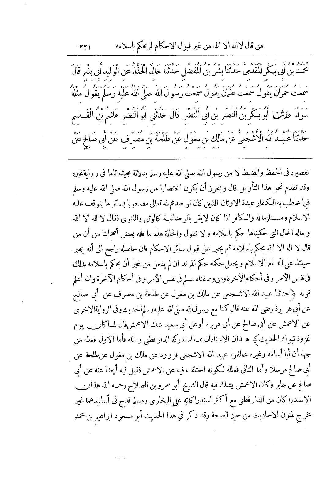 [27] (حَدَّثَنَا عُبَيْدُ اللَّهِ الْأَشْجَعِيُّ عَنْ مَالِكِ بْنِ مِغْوَلٍ عَنْ طَلْحَةَ بْنِ مُصَرِّفٍ عَنْ أَبِي صَالِحٍ عَنْ أَبِي هُرَيْرَةَ رَضِيَ اللَّهُ عَنْهُ قَالَ كُنَّا مَعَ رَسُولِ اللَّهِ صَلَّى اللَّهُ عَلَيْهِ وَسَلَّمَ الْحَدِيثَ وَفِي الرِّوَايَةِ الْأُخْرَى عَنِ الْأَعْمَشِ عَنْ أَبِي صَالِحٍ عَنْ أَبِي هريرة أوعن أَبِي سَعِيدٍ شَكَّ الْأَعْمَشُ قَالَ لَمَّا كَانَ يَوْمُ غَزْوَةِ تَبُوكَ الْحَدِيثَ) هَذَانِ الْإِسْنَادَانِ مِمَّا اسْتَدْرَكَهُ الدَّارَقُطْنِيُّ وَعَلَّلَهُ فَأَمَّا الْأَوَّلُ فَعَلَّلَهُ مِنْ جِهَةِ أَنَّ أَبَا أُسَامَةَ وَغَيْرَهُ خَالَفُوا عُبَيْدَ اللَّهِ الْأَشْجَعِيَّ فَرَوَوْهُ عَنْ مَالِكِ بْنِ مِغْوَلٍ عَنْ طَلْحَةَ عَنْ أَبِي صَالِحٍ مُرْسَلًا وَأَمَّا الثَّانِي فَعَلَّلَهُ لِكَوْنِهِ اخْتُلِفَ فِيهِ عَنِ الْأَعْمَشِ فَقِيلَ فِيهِ أَيْضًا عَنْهُ عَنْ أَبِي صَالِحٍ عَنْ جَابِرٍ وَكَانَ الْأَعْمَشُ يَشُكُّ فِيهِ قَالَ الشَّيْخُ أَبُو عَمْرِو بْنُ الصَّلَاحِ رَحِمَهُ اللَّهُ هَذَانِ الِاسْتِدْرَاكَانِ مِنَ الدَّارَقُطْنِيِّ مَعَ أَكْثَرِ اسْتِدْرَاكَاتِهِ عَلَى الْبُخَارِيِّ وَمُسْلِمٍ قَدْحٌ فِي أَسَانِيدِهِمَا غَيْرُ مُخْرِجٍ لِمُتُونِ الْأَحَادِيثِ مِنْ حَيِّزِ الصِّحَّةِ وَقَدْ ذَكَرَ فِي هَذَا الْحَدِيثِ أَبُو مَسْعُودٍ إِبْرَاهِيمَ بن محمد