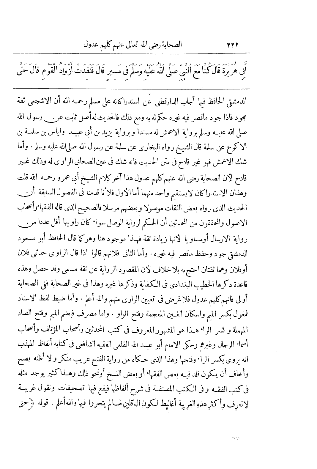 الدِّمَشْقِيُّ الْحَافِظُ فِيمَا أَجَابَ الدَّارَقُطْنِيَّ عَنِ اسْتِدْرَاكَاتِهِ عَلَى مُسْلِمٍ رَحِمَهُ اللَّهُ أَنَّ الْأَشْجَعِيَّ ثِقَةٌ مُجَوِّدٌ فَإِذَا جَوَّدَ مَا قَصَّرَ فِيهِ غَيْرُهُ حُكِمَ لَهُ بِهِ وَمَعَ ذَلِكَ فَالْحَدِيثُ لَهُ أَصْلٌ ثَابِتٌ عَنْ رَسُولِ اللَّهِ صَلَّى اللَّهُ عَلَيْهِ وَسَلَّمَ بِرِوَايَةِ الْأَعْمَشِ لَهُ مُسْنَدًا وَبِرِوَايَةِ يَزِيدَ بْنِ أَبِي عُبَيْدٍ وَإِيَاسِ بْنِ سَلَمَةَ بْنِ الْأَكْوَعِ عَنْ سَلَمَةَ قَالَ الشَّيْخُ رَوَاهُ الْبُخَارِيُّ عَنْ سَلَمَةَ عَنْ رَسُولِ اللَّهِ صَلَّى اللَّهُ عَلَيْهِ وَسَلَّمَ وَأَمَّا شَكُّ الْأَعْمَشِ فَهُوَ غَيْرُ قَادِحٍ فِي مَتْنِ الْحَدِيثِ فَإِنَّهُ شَكٌّ فِي عَيْنِ الصَّحَابِيِّ الرَّاوِي لَهُ وَذَلِكَ غَيْرُ قَادِحٍ لِأَنَّ الصَّحَابَةَ رَضِيَ اللَّهُ عَنْهُمْ كُلُّهُمْ عُدُولٌ هَذَا آخِرُ كَلَامِ الشَّيْخِ أَبِي عَمْرٍو رَحِمَهُ اللَّهُ قُلْتُ وَهَذَانِ الِاسْتِدْرَاكَانِ لَا يَسْتَقِيمُ وَاحِدٌ مِنْهُمَا أَمَّا الْأَوَّلُ فَلِأَنَّا قَدَّمْنَا فِي الْفُصُولِ السَّابِقَةِ أَنَّ الْحَدِيثَ الَّذِي رَوَاهُ بَعْضُ الثِّقَاتِ مَوْصُولًا وَبَعْضُهُمْ مُرْسَلًا فَالصَّحِيحُ الَّذِي قَالَهُ الْفُقَهَاءُ وَأَصْحَابُ الْأُصُولِ وَالْمُحَقِّقُونَ مِنَ الْمُحَدِّثِينَ أَنَّ الْحُكْمَ لِرِوَايَةِ الْوَصْلِ سَوَاءٌ كَانَ رَاوِيهَا أَقَلَّ عددا من رواية الارسال أو مساويا لِأَنَّهَا زِيَادَةُ ثِقَةٍ فَهَذَا مَوْجُودٌ هُنَا وَهُوَ كَمَا قَالَ الْحَافِظُ أَبُو مَسْعُودٍ الدِّمَشْقِيُّ جَوَّدَ وحفظ ماقصر فِيهِ غَيْرُهُ وَأَمَّا الثَّانِي فَلِأَنَّهُمْ قَالُوا إِذَا قَالَ الرَّاوِي حَدَّثَنِي فُلَانٌ أَوْ فُلَانٌ وَهُمَا ثِقَتَانِ احْتُجَّ بِهِ بِلَا خِلَافٍ لِأَنَّ الْمَقْصُودَ الرِّوَايَةُ عَنْ ثِقَةٍ مُسَمًّى وَقَدْ حَصَلَ وَهَذِهِ قَاعِدَةٌ ذَكَرَهَا الْخَطِيبُ الْبَغْدَادِيُّ فِي الْكِفَايَةِ وَذَكَرَهَا غَيْرُهُ وَهَذَا فِي غَيْرِ الصَّحَابَةِ فَفِي الصَّحَابَةِ أَوْلَى فَإِنَّهُمْ كُلُّهُمْ عُدُولٌ فَلَا غَرَضَ فِي تَعْيِينِ الرَّاوِي مِنْهُمْ وَاللَّهُ أَعْلَمُ وَأَمَّا ضَبْطُ لَفْظِ الْإِسْنَادِ فَمِغْوَلٌ بِكَسْرِ الْمِيمِ وَإِسْكَانِ الْغَيْنِ الْمُعْجَمَةِ وَفَتْحِ الْوَاوِ وَأَمَّا مُصَرِّفٌ فَبِضَمِّ الْمِيمِ وَفَتْحِ الصَّادِ الْمُهْمَلَةِ وَكَسْرِ الرَّاءِ هَذَا هُوَ الْمَشْهُورُ الْمَعْرُوفُ فِي كُتُبِ الْمُحَدِّثِينَ وَأَصْحَابِ الْمُؤْتَلِفِ وَأَصْحَابِ أَسْمَاءِ الرِّجَالِ وَغَيْرِهِمْ وَحَكَى الْإِمَامُ أَبُو عَبْدِ اللَّهِ الْقَلَعِيُّ الْفَقِيهُ الشَّافِعِيُّ فِي كِتَابِهِ أَلْفَاظُ الْمُهَذَّبِ أَنَّهُ يُرْوَى بِكَسْرِ الرَّاءِ وَفَتْحِهَا وَهَذَا الَّذِي حَكَاهُ مِنْ رِوَايَةِ الْفَتْحِ غَرِيبٌ مُنْكَرٌ وَلَا أَظُنُّهُ يَصِحُّ وَأَخَافُ أَنْ يَكُونَ قَلَّدَ فِيهِ بَعْضَ الْفُقَهَاءِ أَوْ بَعْضَ النُّسَخِ أَوْ نَحْوَ ذَلِكَ وَهَذَا كَثِيرٌ يُوجَدُ مِثْلُهُ فِي كُتُبِ الْفِقْهِ وَفِي الْكُتُبِ الْمُصَنَّفَةِ فِي شَرْحِ أَلْفَاظِهَا فَيَقَعُ فِيهَا تَصْحِيفَاتٌ وَنُقُولٌ غَرِيبَةٌ لا تعرف وأكثر هذه الغريبة أَغَالِيطُ لِكَوْنِ النَّاقِلِينَ لَهَا لَمْ يَتَحَرَّوْا فِيهَا وَاللَّهُ أَعْلَمُ قَوْلُهُ (حَتَّى