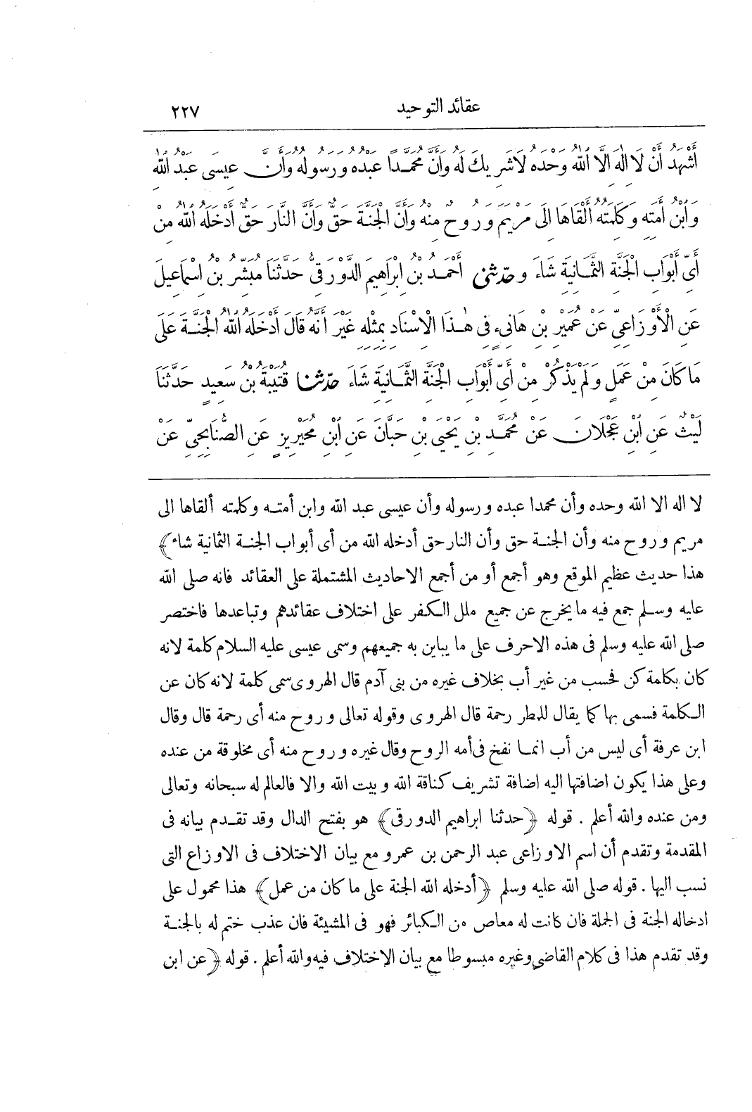 لَا إِلَهَ إِلَّا اللَّهُ وَحْدَهُ وَأَنَّ مُحَمَّدًا عبده ورسوله وأن عيسى عبد الله وبن أَمَتِهِ وَكَلِمَتُهُ أَلْقَاهَا إِلَى مَرْيَمَ وَرُوحٌ مِنْهُ وَأَنَّ الْجَنَّةَ حَقٌّ وَأَنَّ النَّارَ حَقٌّ أَدْخَلَهُ اللَّهُ مِنْ أَيِّ أَبْوَابِ الْجَنَّةِ الثَّمَانِيَةِ شَاءَ) هَذَا حَدِيثٌ عَظِيمُ الْمَوْقِعِ وَهُوَ أَجْمَعُ أَوْ مِنْ أَجْمَعِ الْأَحَادِيثِ الْمُشْتَمِلَةِ عَلَى الْعَقَائِدِ فَإِنَّهُ صَلَّى اللَّهُ عَلَيْهِ وَسَلَّمَ جَمَعَ فِيهِ مَا يُخْرِجُ عَنْ جَمِيعِ مِلَلِ الْكُفْرِ عَلَى اخْتِلَافِ عَقَائِدِهِمْ وَتَبَاعُدِهِمْ فَاخْتَصَرَ صَلَّى اللَّهُ عَلَيْهِ وَسَلَّمَ فِي هَذِهِ الْأَحْرُفِ عَلَى مَا يُبَايِنُ بِهِ جَمِيعَهُمْ وَسَمَّى عِيسَى عَلَيْهِ السَّلَامَ كَلِمَةً لِأَنَّهُ كَانَ بِكَلِمَةِ كُنْ فَحَسْبُ مِنْ غَيْرِ أَبٍ بِخِلَافِ غَيْرِهِ مِنْ بَنِي آدَمَ قَالَ الْهَرَوِيُّ سُمِّيَ كَلِمَةً لِأَنَّهُ كَانَ عَنِ الْكَلِمَةِ فَسُمِّيَ بِهَا كَمَا يُقَالُ لِلْمَطَرِ رَحْمَةٌ قَالَ الْهَرَوِيُّ وَقَوْلُهُ تَعَالَى وَرُوحٌ مِنْهُ أَيْ رَحْمَةٌ قَالَ وقال بن عَرَفَةَ أَيْ لَيْسَ مِنْ أَبٍ إِنَّمَا نَفَخَ فِي أُمِّهِ الرُّوحَ وَقَالَ غَيْرُهُ وَرُوحٌ مِنْهُ أَيْ مَخْلُوقَةٌ مِنْ عِنْدِهِ وَعَلَى هَذَا يَكُونُ إِضَافَتُهَا إِلَيْهِ إِضَافَةَ تَشْرِيفٍ كَنَاقَةِ اللَّهِ وَبَيْتِ اللَّهِ وَإِلَّا فَالْعَالَمُ لَهُ سُبْحَانَهُ وَتَعَالَى وَمِنْ عِنْدِهِ وَاللَّهُ أَعْلَمُ قَوْلُهُ (حَدَّثَنَا إِبْرَاهِيمُ الدَّوْرَقِيُّ) هُوَ بِفَتْحِ الدَّالِ وَقَدْ تَقَدَّمَ بَيَانُهُ فِي الْمُقَدِّمَةِ وَتَقَدَّمَ أَنَّ اسْمَ الْأَوْزَاعِيِّ عَبْدُ الرَّحْمَنِ بْنُ عَمْرٍو مَعَ بَيَانِ الِاخْتِلَافِ فِي الْأَوْزَاعِ الَّتِي نُسِبَ إِلَيْهَا قَوْلُهُ صَلَّى اللَّهُ عَلَيْهِ وَسَلَّمَ (أَدْخَلَهُ اللَّهُ الْجَنَّةَ عَلَى مَا كَانَ مِنْ عَمَلٍ) هَذَا مَحْمُولٌ عَلَى إِدْخَالِهِ الْجَنَّةَ فِي الْجُمْلَةِ فَإِنْ كَانَتْ لَهُ مَعَاصٍ مِنَ الْكَبَائِرِ فَهُوَ فِي الْمَشِيئَةِ فَإِنْ عُذِّبَ خُتِمَ لَهُ بِالْجَنَّةِ وَقَدْ تَقَدَّمَ هَذَا فِي كَلَامِ الْقَاضِي وَغَيْرِهِ مَبْسُوطًا مَعَ بَيَانِ الِاخْتِلَافِ فِيهِ والله أعلم
