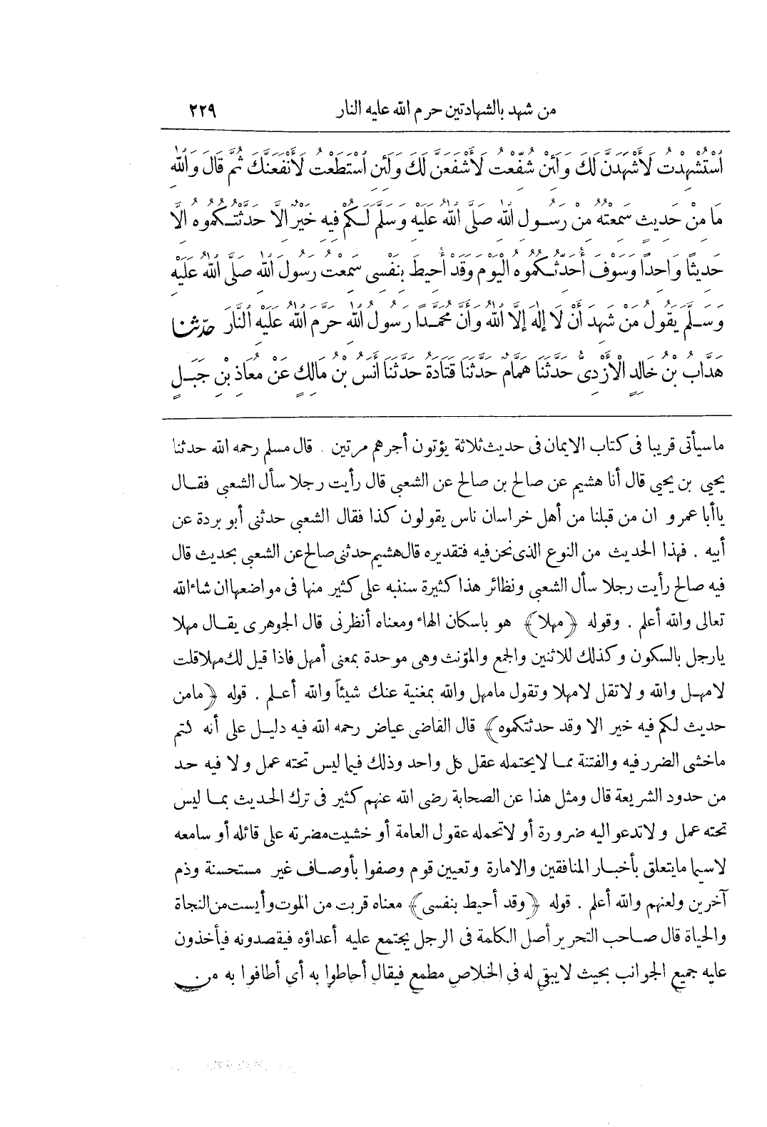 مَا سَيَأْتِي قَرِيبًا فِي كِتَابِ الْإِيمَانِ فِي حديث ثلاثة يُؤْتَوْنَ أَجْرَهُمْ مَرَّتَيْنِ قَالَ مُسْلِمٌ رَحِمَهُ اللَّهُ حَدَّثَنَا يَحْيَى بْنُ يَحْيَى قَالَ أَنَا هُشَيْمٌ عَنْ صَالِحِ بْنِ صَالِحٍ عَنِ الشَّعْبِيِّ قَالَ رَأَيْتُ رَجُلًا سَأَلَ الشَّعْبِيَّ فَقَالَ يَا أَبَا عَمْرٍو إِنَّ مِنْ قِبَلِنَا مِنْ أَهْلِ خُرَاسَانَ نَاسٌ يَقُولُونَ كَذَا فَقَالَ الشَّعْبِيُّ حَدَّثَنِي أَبُو بُرْدَةَ عَنْ أَبِيهِ فَهَذَا الْحَدِيثُ مِنَ النَّوْعِ الَّذِي نَحْنُ فِيهِ فَتَقْدِيرُهُ قَالَ هُشَيْمٌ حَدَّثَنِي صَالِحٌ عَنِ الشَّعْبِيِّ بِحَدِيثٍ قَالَ فِيهِ صَالِحٌ رَأَيْتُ رَجُلًا سَأَلَ الشَّعْبِيَّ وَنَظَائِرُ هَذَا كَثِيرَةٌ سَنُنَبِّهُ عَلَى كَثِيرٍ مِنْهَا فِي مَوَاضِعِهَا إِنْ شَاءَ اللَّهُ تَعَالَى وَاللَّهُ أَعْلَمُ وَقَوْلُهُ (مَهْلًا) هُوَ بِإِسْكَانِ الْهَاءِ وَمَعْنَاهُ أَنْظِرْنِي قَالَ الْجَوْهَرِيُّ يُقَالُ مَهْلًا يَا رَجُلُ بِالسُّكُونِ وَكَذَلِكَ لِلِاثْنَيْنِ وَالْجَمْعِ وَالْمُؤَنَّثِ وَهِيَ مُوَحَّدَةٌ بِمَعْنَى أَمْهِلْ فَإِذَا قِيلَ لَكَ مَهْلًا قُلْتَ لَا مَهْلَ وَاللَّهِ وَلَا تَقُلْ لَا مَهْلًا وَتَقُولُ مَا مَهْلُ وَاللَّهِ بِمُغْنِيَةٍ عَنْكَ شَيْئًا وَاللَّهُ أَعْلَمُ قَوْلُهُ (مَا مِنْ حَدِيثٍ لَكُمْ فِيهِ خَيْرٌ إِلَّا وَقَدْ حَدَّثْتُكُمُوهُ) قَالَ الْقَاضِي عِيَاضٌ رَحِمَهُ اللَّهُ فِيهِ دَلِيلٌ عَلَى أَنَّهُ كَتَمَ مَا خَشِيَ الضَّرَرَ فِيهِ وَالْفِتْنَةَ مِمَّا لَا يَحْتَمِلُهُ عَقْلُ كُلِّ وَاحِدٍ وَذَلِكَ فِيمَا لَيْسَ تَحْتَهُ عَمَلٌ وَلَا فِيهِ حَدٌّ مِنْ حُدُودِ الشَّرِيعَةِ قَالَ وَمِثْلُ هَذَا عَنِ الصَّحَابَةِ رَضِيَ اللَّهُ عَنْهُمْ كَثِيرٌ فِي تَرْكِ الْحَدِيثِ بِمَا لَيْسَ تَحْتَهُ عَمَلٌ وَلَا تَدْعُو إِلَيْهِ ضَرُورَةٌ أَوْ لَا تَحْمِلُهُ عُقُولُ الْعَامَّةِ أَوْ خُشِيَتْ مَضَرَّتُهُ عَلَى قَائِلِهِ أَوْ سَامِعِهِ لَا سِيَّمَا مَا يَتَعَلَّقُ بِأَخْبَارِ الْمُنَافِقِينَ وَالْإِمَارَةِ وَتَعْيِينِ قَوْمٍ وُصِفُوا بِأَوْصَافٍ غَيْرِ مُسْتَحْسَنَةٍ وَذَمِّ آخَرِينَ وَلَعْنِهِمْ وَاللَّهُ أَعْلَمُ قَوْلُهُ (وَقَدْ أُحِيطَ بِنَفْسِي) مَعْنَاهُ قَرُبْتُ مِنَ الْمَوْتِ وَأَيِسْتُ مِنَ النَّجَاةِ وَالْحَيَاةِ قَالَ صَاحِبُ التَّحْرِيرِ أَصْلُ الْكَلِمَةِ فِي الرَّجُلِ يَجْتَمِعُ عَلَيْهِ أَعْدَاؤُهُ فَيَقْصِدُونَهُ فَيَأْخُذُونَ عَلَيْهِ جَمِيعَ الْجَوَانِبِ بِحَيْثُ لَا يَبْقَى لَهُ فِي الْخَلَاصِ مَطْمَعٌ فَيُقَالُ أَحَاطُوا بِهِ أَيْ أَطَافُوا بِهِ مِنْ