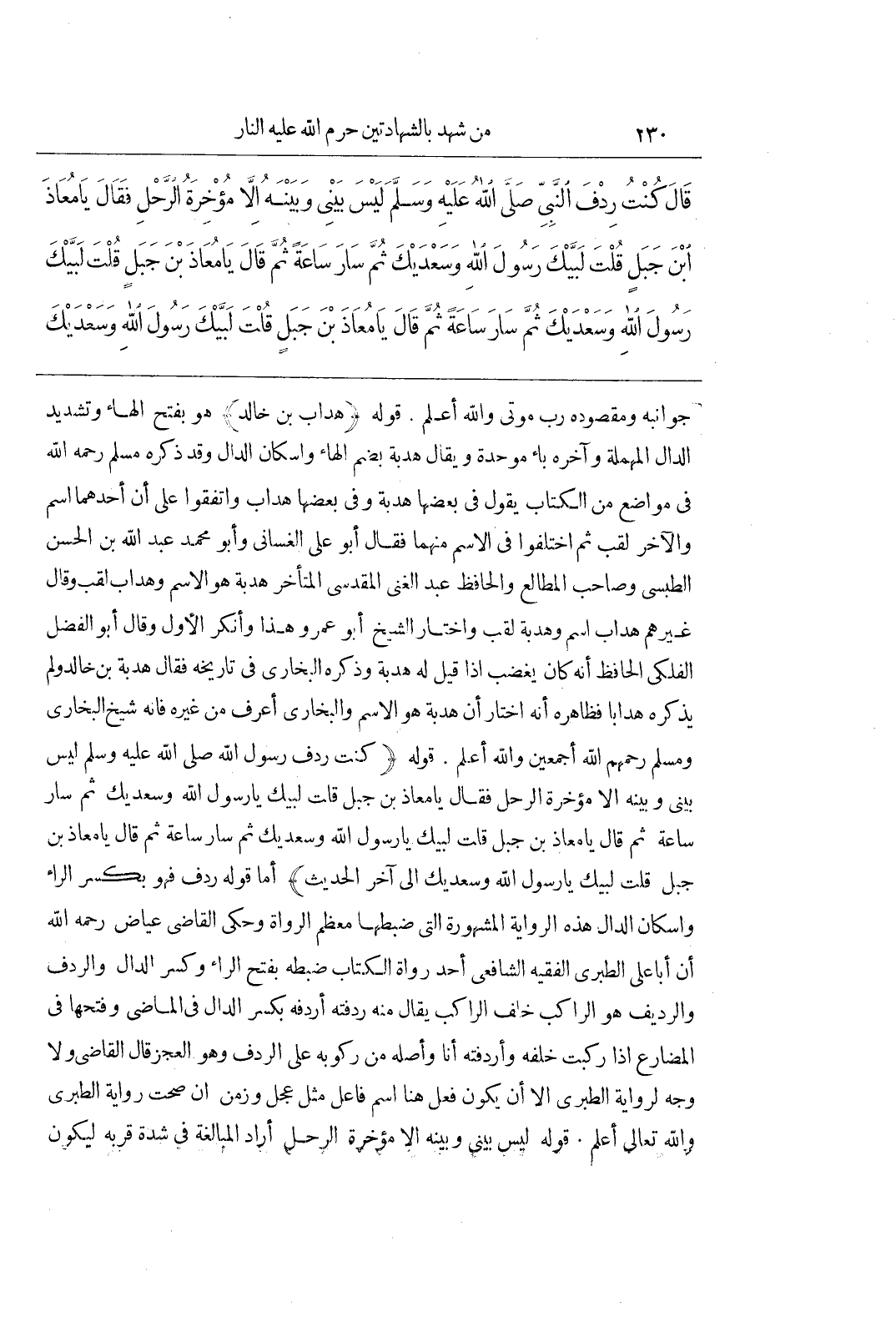 جوانبه ومقصوده رب مَوْتِي وَاللَّهُ أَعْلَمُ قَوْلُهُ (هَدَّابُ بْنُ خَالِدٍ) هُوَ بِفَتْحِ الْهَاءِ وَتَشْدِيدِ الدَّالِ الْمُهْمَلَةِ وَآخِرُهُ بَاءٌ مُوَحَّدَةٌ وَيُقَالُ هُدْبَةُ بِضَمِّ الْهَاءِ وَإِسْكَانِ الدَّالِ وَقَدْ ذَكَرَهُ مُسْلِمٌ رَحِمَهُ اللَّهُ فِي مَوَاضِعَ مِنَ الْكِتَابِ يَقُولُ فِي بَعْضِهَا هُدْبَةُ وَفِي بَعْضِهَا هَدَّابٌ وَاتَّفَقُوا عَلَى أَنَّ أَحَدَهُمَا اسْمٌ وَالْآخَرُ لَقَبٌ ثُمَّ اخْتَلَفُوا فِي الِاسْمِ مِنْهُمَا فَقَالَ أَبُو عَلِيٍّ الْغَسَّانِيُّ وَأَبُو مُحَمَّدٍ عَبْدُ اللَّهِ بْنُ الْحَسَنِ الطَّبَسِيُّ وَصَاحِبُ الْمَطَالِعِ وَالْحَافِظُ عَبْدِ الْغَنِيِّ الْمَقْدِسِيُّ الْمُتَأَخِّرُ هُدْبَةُ هُوَ الِاسْمُ وَهَدَّابٌ لَقَبٌ وَقَالَ غَيْرُهُمْ هَدَّابٌ اسْمٌ وهدبة لقب واختار الشيح أَبُو عَمْرٍو هَذَا وَأَنْكَرَ الْأَوَّلَ وَقَالَ أَبُو الْفَضْلِ الْفَلَكِيُّ الْحَافِظُ إِنَّهُ كَانَ يَغْضَبُ إِذَا قِيلَ لَهُ هُدْبَةُ وَذَكَرَهُ الْبُخَارِيُّ فِي تَارِيخِهِ فَقَالَ هُدْبَةُ بْنُ خَالِدٍ وَلَمْ يَذْكُرْهُ هَدَّابًا فَظَاهِرُهُ أَنَّهُ اخْتَارَ أَنَّ هُدْبَةَ هُوَ الِاسْمُ وَالْبُخَارِيُّ أَعْرَفُ مِنْ غَيْرِهِ فَإِنَّهُ شَيْخُ الْبُخَارِيِّ وَمُسْلِمٍ رَحِمَهُمُ اللَّهُ أَجْمَعِينَ وَاللَّهُ أَعْلَمُ قَوْلُهُ (كُنْتُ رِدْفَ رَسُولِ اللَّهِ صَلَّى اللَّهُ عَلَيْهِ وَسَلَّمَ لَيْسَ بَيْنِي وَبَيْنَهُ إِلَّا مُؤْخِرَةُ الرَّحْلِ فَقَالَ يَا مُعَاذُ بْنَ جَبَلٍ قُلْتُ لَبَّيْكَ يَا رَسُولَ اللَّهِ وَسَعْدَيْكَ ثُمَّ سَارَ سَاعَةً ثُمَّ قَالَ يَا مُعَاذُ بْنَ جَبَلٍ قُلْتُ لَبَّيْكَ يَا رَسُولَ اللَّهِ وَسَعْدَيْكَ ثُمَّ سَارَ سَاعَةً ثُمَّ قَالَ يَا مُعَاذُ بْنَ جَبَلٍ قُلْتُ لَبَّيْكَ يَا رَسُولَ اللَّهِ وَسَعْدَيْكَ إِلَى آخِرِ الْحَدِيثِ) أَمَّا قَوْلُهُ رِدْفَ فَهُوَ بِكَسْرِ الرَّاءِ وَإِسْكَانِ الدَّالِ هَذِهِ الرِّوَايَةُ الْمَشْهُورَةُ الَّتِي ضَبَطَهَا مُعْظَمُ الرُّوَاةِ وَحَكَى الْقَاضِي عِيَاضٌ رَحِمَهُ اللَّهُ أَنَّ أَبَا عَلِيٍّ الطَّبَرِيَّ الْفَقِيهَ الشَّافِعِيَّ أَحَدَ رُوَاةِ الْكِتَابِ ضَبَطَهُ بِفَتْحِ الرَّاءِ وَكَسْرِ الدَّالِ وَالرِّدْفُ وَالرَّدِيفُ هُوَ الرَّاكِبُ خَلْفَ الرَّاكِبِ يُقَالُ مِنْهُ رَدِفْتُهُ أَرْدَفُهُ بِكَسْرِ الدَّالِ فِي الْمَاضِي وَفَتْحِهَا فِي الْمُضَارِعِ إِذَا رَكِبْتُ خَلْفَهُ وَأَرْدَفْتُهُ أَنَا وَأَصْلُهُ مِنْ رُكُوبِهِ عَلَى الرِّدْفِ وَهُوَ الْعَجُزُ قَالَ الْقَاضِي وَلَا وَجْهَ لِرِوَايَةِ الطَّبَرِيِّ إِلَّا أَنْ يَكُونَ فَعِلَ هُنَا اسْمُ فَاعِلٍ مِثْلَ عَجِلَ وَزَمِنَ إِنْ صَحَّتْ رِوَايَةُ الطَّبَرِيِّ وَاللَّهُ تَعَالَى أَعْلَمُ قَوْلُهُ لَيْسَ بَيْنِي وَبَيْنَهُ إِلَّا مُؤْخِرَةُ الرَّحْلِ أَرَادَ الْمُبَالَغَةَ فِي شِدَّةِ قُرْبِهِ لِيَكُونَ