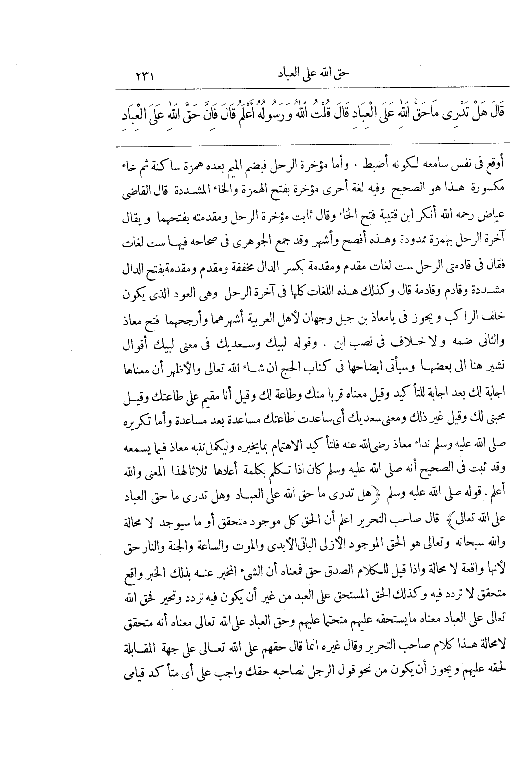 أَوْقَعَ فِي نَفْسِ سَامِعِهِ لِكَوْنِهِ أَضْبَطَ وَأَمَّا مُؤْخِرَةُ الرَّحْلِ فَبِضَمِّ الْمِيمِ بَعْدَهُ هَمْزَةٌ سَاكِنَةٌ ثُمَّ خَاءٌ مَكْسُورَةٌ هَذَا هُوَ الصَّحِيحُ وَفِيهِ لغة أخرى مؤخرة بفتح الْهَمْزَةِ وَالْخَاءِ الْمُشَدَّدَةِ قَالَ الْقَاضِي عِيَاضٌ رَحِمَهُ الله أنكر بن قُتَيْبَةَ فَتْحَ الْخَاءِ وَقَالَ ثَابِتٌ مُؤَخَّرَةُ الرَّحْلِ وَمُقَدَّمَتُهُ بِفَتْحِهِمَا وَيُقَالُ آخِرَةُ الرَّحْلِ بِهَمْزَةٍ مَمْدُودَةٍ وَهَذِهِ أَفْصَحُ وَأَشْهَرُ وَقَدْ جَمَعَ الْجَوْهَرِيُّ فِي صِحَاحِهِ فِيهَا سِتَّ لُغَاتٍ فَقَالَ فِي قَادِمَتَيِ الرَّحْلِ سِتُّ لُغَاتٍ مُقْدِمٌ وَمُقْدِمَةٌ بِكَسْرِ الدَّالِ مُخَفَّفَةٌ وَمُقَدَّمٌ وَمُقَدَّمَةٌ بِفَتْحِ الدَّالِ مُشَدَّدَةً وَقَادِمٌ وَقَادِمَةٌ قَالَ وَكَذَلِكَ هَذِهِ اللُّغَاتُ كُلُّهَا فِي آخِرَةِ الرَّحْلِ وَهِيَ الْعُودُ الَّذِي يَكُونُ خَلْفِ الرَّاكِبِ وَيَجُوزُ فِي يَا مُعَاذَ بْنَ جَبَلٍ وَجْهَانِ لِأَهْلِ الْعَرَبِيَّةِ أَشْهُرُهُمَا وَأَرْجَحُهُمَا فَتْحُ مُعَاذَ والثانى ضمه ولا خلاف فى نصب بن وَقَوْلُهُ لَبَّيْكَ وَسَعْدَيْكَ فِي مَعْنَى لَبَّيْكَ أَقْوَالٌ نُشِيرُ هُنَا إِلَى بَعْضِهَا وَسَيَأْتِي إِيضَاحُهَا فِي كِتَابِ الْحَجِّ إِنْ شَاءَ اللَّهُ تَعَالَى وَالْأَظْهَرُ أَنَّ مَعْنَاهَا إِجَابَةً لَكَ بَعْدَ إِجَابَةٍ لِلتَّأْكِيدِ وَقِيلَ مَعْنَاهُ قُرْبًا مِنْكَ وَطَاعَةً لَكَ وَقِيلَ أَنَا مُقِيمٌ عَلَى طَاعَتِكَ وَقِيلَ مَحَبَّتِي لَكَ وَقِيلَ غَيْرُ ذَلِكَ وَمَعْنَى سَعْدَيْكَ أَيْ سَاعَدْتُ طَاعَتَكَ مُسَاعَدَةً بَعْدَ مُسَاعَدَةٍ وَأَمَّا تَكْرِيرُهُ صَلَّى اللَّهُ عَلَيْهِ وَسَلَّمَ نِدَاءَ مُعَاذٍ رَضِيَ اللَّهُ عَنْهُ فَلِتَأْكِيدِ الِاهْتِمَامِ بِمَا يُخْبِرُهُ وَلِيَكْمُلَ تَنَبُّهُ مُعَاذٍ فِيمَا يَسْمَعُهُ وَقَدْ ثَبَتَ فِي الصَّحِيحِ أَنَّهُ صَلَّى اللَّهُ عَلَيْهِ وَسَلَّمَ كَانَ إِذَا تَكَلَّمَ بِكَلِمَةٍ أَعَادَهَا ثَلَاثًا لِهَذَا الْمَعْنَى وَاللَّهُ أَعْلَمُ قَوْلُهُ صَلَّى اللَّهُ عَلَيْهِ وَسَلَّمَ (هَلْ تَدْرِي مَا حَقُّ اللَّهِ عَلَى الْعِبَادِ وَهَلْ تَدْرِي مَا حَقُّ الْعِبَادِ عَلَى اللَّهِ تَعَالَى) قَالَ صَاحِبُ التَّحْرِيرِ اعْلَمْ أَنَّ الْحَقَّ كُلُّ مَوْجُودٍ مُتَحَقِّقٌ أَوْ مَا سَيُوجَدُ لَا مَحَالَةَ وَاللَّهُ سُبْحَانَهُ وَتَعَالَى هُوَ الْحَقُّ الْمَوْجُودُ الْأَزَلِيُّ الْبَاقِي الْأَبَدِيُّ وَالْمَوْتُ وَالسَّاعَةُ وَالْجَنَّةُ وَالنَّارُ حَقٌّ لِأَنَّهَا وَاقِعَةٌ لَا مَحَالَةَ وَإِذَا قِيلَ لِلْكَلَامِ الصِّدْقُ حَقٌّ فَمَعْنَاهُ أَنَّ الشَّيْءَ الْمُخْبَرُ عَنْهُ بذلك الخبر واقع متحقق لاتردد فِيهِ وَكَذَلِكَ الْحَقُّ الْمُسْتَحَقُّ عَلَى الْعَبْدِ مِنْ غَيْرِ أَنْ يَكُونَ فِيهِ تَرَدُّدٌ وَتَحَيُّرٌ فَحَقُّ اللَّهِ تَعَالَى عَلَى الْعِبَادِ مَعْنَاهُ مَا يَسْتَحِقُّهُ عَلَيْهِمْ مُتَحَتِّمًا عَلَيْهِمْ وَحَقُّ الْعِبَادِ عَلَى اللَّهِ تَعَالَى مَعْنَاهُ أَنَّهُ مُتَحَقِّقٌ لَا مَحَالَةَ هَذَا كَلَامُ صَاحِبِ التَّحْرِيرِ وَقَالَ غَيْرُهُ إِنَّمَا قَالَ حَقُّهُمْ عَلَى اللَّهِ تَعَالَى عَلَى جِهَةِ الْمُقَابَلَةِ لِحَقِّهِ عَلَيْهِمْ وَيَجُوزُ أَنْ يَكُونَ مِنْ نَحْوِ قَوْلِ الرَّجُلِ لِصَاحِبِهِ حَقُّكَ وَاجِبٌ عَلَيَّ أَيْ مُتَأَكِّدٌ قيامى