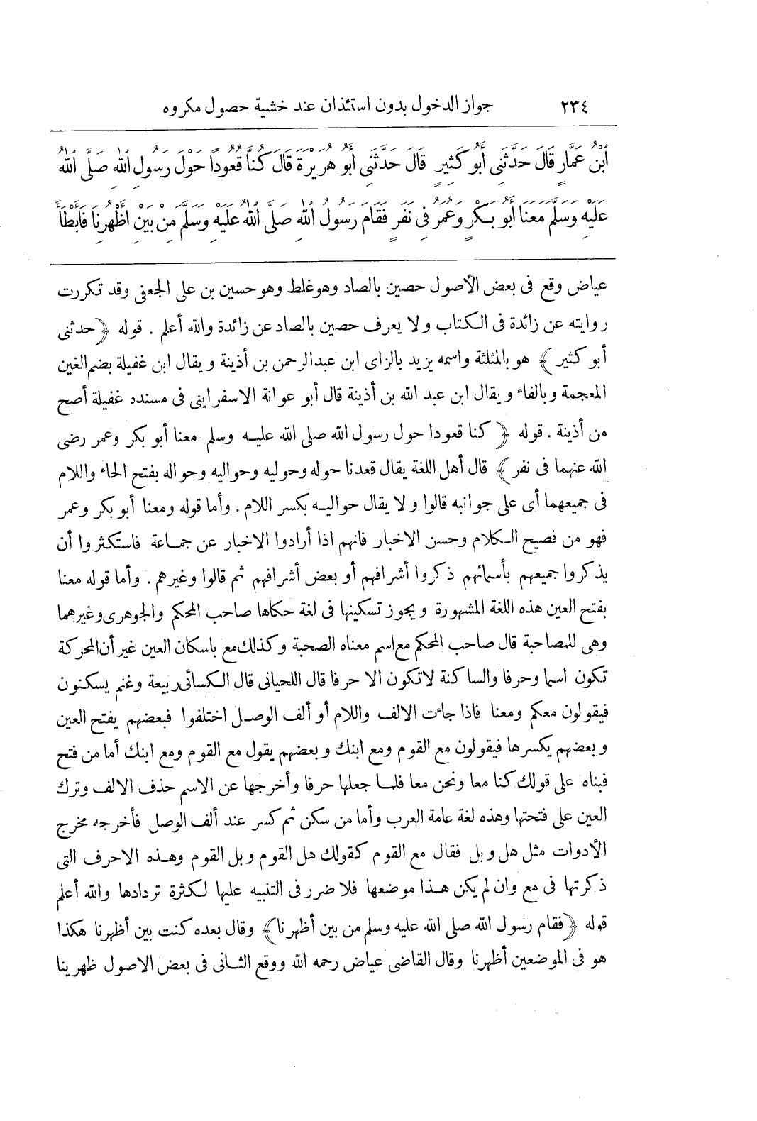 عِيَاضٌ وَقَعَ فِي بَعْضِ الْأُصُولِ حَصِينٌ بِالصَّادِ وَهُوَ غَلَطٌ وَهُوَ حُسَيْنُ بْنُ عَلِيٍّ الْجُعْفِيُّ وَقَدْ تَكَرَّرَتْ رِوَايَتُهُ عَنْ زَائِدَةَ فِي الْكِتَابِ وَلَا يُعْرَفُ حَصِينٌ بِالصَّادِ عَنْ زَائِدَةَ وَاللَّهُ أَعْلَمُ قَوْلُهُ (حَدَّثَنِي أَبُو كَثِيرٍ) هُوَ بِالْمُثَلَّثَةِ واسمه يزيد بالزاى بن عبد الرحمن بن أذينة ويقال بن غفيلة بضم الغين المعجمة وبالفاء ويقال بن عَبْدِ اللَّهِ بْنِ أُذَيْنَةَ قَالَ أَبُو عَوَانَةَ الاسفراينى فِي مُسْنَدِهِ غُفَيْلَةُ أَصَحُّ مِنْ أُذَيْنَةَ قَوْلُهُ (كُنَّا قُعُودًا حَوْلَ رَسُولِ اللَّهِ صَلَّى اللَّهُ عَلَيْهِ وَسَلَّمَ مَعَنَا أَبُو بَكْرٍ وَعُمَرُ رَضِيَ اللَّهُ عَنْهُمَا فِي نَفَرٍ) قَالَ أَهْلُ اللُّغَةِ يُقَالُ قَعَدْنَا حَوْلَهُ وَحَوْلَيْهِ وَحَوَالَيْهِ وَحَوَالَهُ بِفَتْحِ الْحَاءِ وَاللَّامِ فِي جَمِيعِهِمَا أَيْ عَلَى جَوَانِبِهِ قَالُوا وَلَا يُقَالُ حَوَالِيهِ بِكَسْرِ اللَّامِ وَأَمَّا قَوْلُهُ وَمَعَنَا أَبُو بَكْرٍ وَعُمَرُ فَهُوَ مِنْ فَصِيحِ الْكَلَامِ وَحُسْنِ الْإِخْبَارِ فَإِنَّهُمْ إِذَا أَرَادُوا الْإِخْبَارَ عَنْ جَمَاعَةٍ فَاسْتَكْثَرُوا أَنْ يَذْكُرُوا جَمِيعَهُمْ بِأَسْمَائِهِمْ ذَكَرُوا أَشْرَافَهُمْ أَوْ بَعْضَ أَشْرَافِهِمْ ثُمَّ قَالُوا وَغَيْرُهُمْ وَأَمَّا قَوْلُهُ مَعَنَا بِفَتْحِ الْعَيْنِ هَذِهِ اللُّغَةُ الْمَشْهُورَةُ وَيَجُوزُ تَسْكِينُهَا فِي لُغَةٍ حَكَاهَا صَاحِبُ الْمُحْكَمِ وَالْجَوْهَرِيُّ وَغَيْرُهُمَا وَهِيَ لِلْمُصَاحَبَةِ قَالَ صَاحِبُ الْمُحْكَمِ مَعَ اسْمٌ مَعْنَاهُ الصُّحْبَةُ وَكَذَلِكَ مَعْ بِإِسْكَانِ الْعَيْنِ غَيْرَ أَنَّ الْمُحَرَّكَةَ تَكُونُ اسْمًا وَحَرْفًا وَالسَّاكِنَةُ لَا تَكُونُ إِلَّا حَرْفًا قَالَ اللِّحْيَانِيُّ قَالَ الْكِسَائِيُّ رَبِيعَةُ وَغَنْمٌ يُسَكِّنُونَ فَيَقُولُونَ مَعْكُمْ وَمَعْنَا فَإِذَا جَاءَتِ الْأَلِفُ وَاللَّامُ أَوْ أَلِفُ الْوَصْلِ اخْتَلَفُوا فَبَعْضُهُمْ يَفْتَحُ الْعَيْنِ وَبَعْضُهُمْ يَكْسِرُهَا فَيَقُولُونَ مَعَ الْقَوْمِ وَمَعَ ابْنِكِ وَبَعْضُهُمْ يَقُولُ مَعِ الْقَوْمِ وَمَعِ ابْنِكَ أَمَّا مَنْ فَتَحَ فَبَنَاهُ عَلَى قَوْلِكَ كُنَّا مَعًا وَنَحْنُ مَعًا فَلَمَّا جَعَلَهَا حَرْفًا وَأَخْرَجَهَا عَنْ الِاسْمِ حَذَفَ الْأَلِفَ وَتَرَكَ الْعَيْنَ عَلَى فَتْحَتِهَا وَهَذِهِ لُغَةُ عَامَّةِ الْعَرَبِ وَأَمَّا مَنْ سَكَّنَ ثُمَّ كَسَرَ عِنْدَ أَلِفِ الْوَصْلِ فَأَخْرَجَهُ مخرج الأدوات مثل هل وبل فَقَالَ مَعِ الْقَوْمِ كَقَوْلِكَ هَلِ الْقَوْمُ وَبَلِ الْقَوْمُ وَهَذِهِ الْأَحْرُفُ الَّتِي ذَكَرْتُهَا فِي مَعَ وَإِنْ لَمْ يَكُنْ هَذَا مَوْضِعَهَا فَلَا ضَرَرَ فِي التَّنْبِيهِ عَلَيْهَا لِكَثْرَةِ تَرْدَادِهَا وَاللَّهُ أَعْلَمُ قَوْلُهُ (فَقَامَ رَسُولُ اللَّهِ صَلَّى اللَّهُ عَلَيْهِ وَسَلَّمَ مِنْ بَيْنِ أَظْهُرِنَا) وَقَالَ بَعْدَهُ كُنْتَ بَيْنَ أَظْهُرِنَا هَكَذَا هُوَ فِي الْمَوْضِعَيْنِ أَظْهُرِنَا وَقَالَ الْقَاضِي عِيَاضٌ رَحِمَهُ اللَّهُ وَوَقَعَ الثَّانِي فِي بَعْضِ الْأُصُولِ ظَهْرَيْنَا