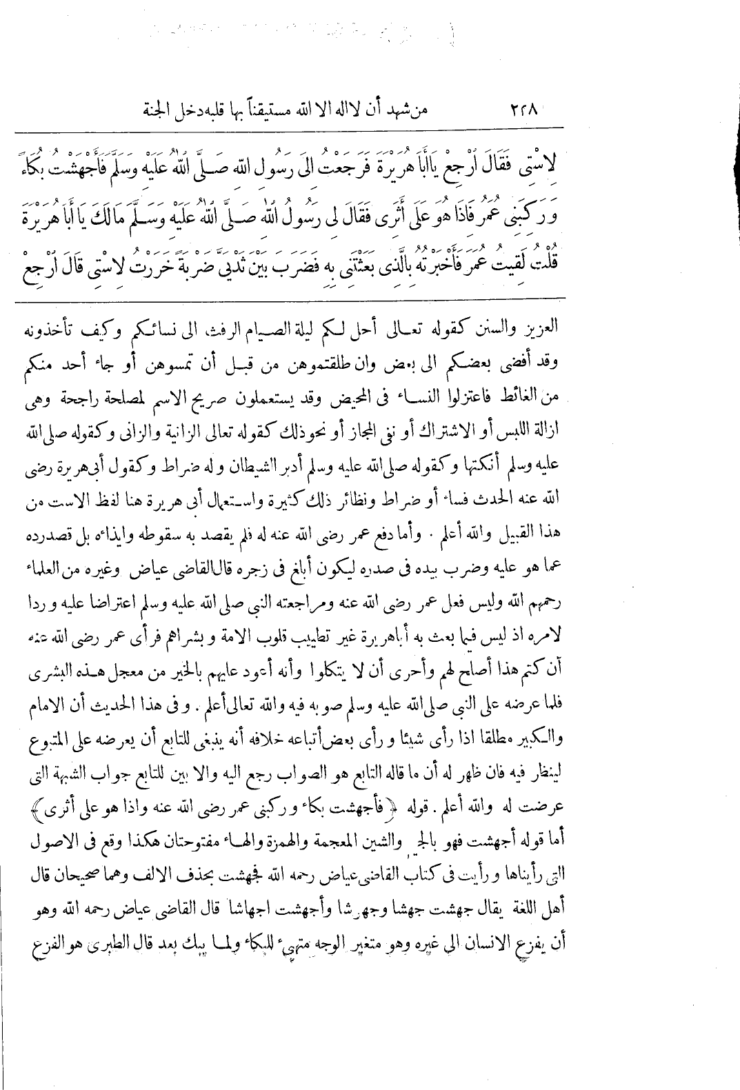الْعَزِيزُ وَالسُّنَنُ كَقَوْلِهِ تَعَالَى أُحِلَّ لَكُمْ لَيْلَةَ الصِّيَامِ الرَّفَثُ إِلَى نِسَائِكُمْ وَكَيْفَ تَأْخُذُونَهُ وَقَدْ أَفْضَى بَعْضُكُمْ إِلَى بَعْضٍ وَإِنْ طَلَّقْتُمُوهُنَّ مِنْ قَبْلِ أَنْ تَمَسُّوهُنَّ أَوْ جَاءَ أَحَدٌ مِنْكُمْ من الغائط فاعتزلوا النساء فى المحيض وَقَدْ يَسْتَعْمِلُونَ صَرِيحَ الِاسْمِ لِمَصْلَحَةٍ رَاجِحَةٍ وَهِيَ إِزَالَةُ اللَّبْسِ أَوِ الِاشْتِرَاكُ أَوْ نَفْيِ الْمَجَازِ أَوْ نَحْوِ ذَلِكَ كَقَوْلِهِ تَعَالَى الزَّانِيَةُ وَالزَّانِي وَكَقَوْلِهِ صَلَّى اللَّهُ عَلَيْهِ وَسَلَّمَ أَنِكْتَهَا وَكَقَوْلِهِ صَلَّى اللَّهُ عَلَيْهِ وَسَلَّمَ أَدْبَرَ الشَّيْطَانُ وَلَهُ ضُرَاطٌ وَكَقَوْلِ أَبِي هُرَيْرَةَ رَضِيَ اللَّهُ عَنْهُ الْحَدَثُ فُسَاءٌ أَوْ ضُرَاطٌ وَنَظَائِرُ ذَلِكَ كَثِيرَةٌ وَاسْتِعْمَالُ أَبِي هُرَيْرَةَ هُنَا لَفْظُ الِاسْتِ مِنْ هَذَا الْقَبِيلِ وَاللَّهُ أَعْلَمُ وَأَمَّا دَفْعُ عُمَرَ رَضِيَ اللَّهُ عَنْهُ لَهُ فَلَمْ يَقْصِدْ بِهِ سُقُوطَهُ وَإِيذَاءَهُ بَلْ قَصَدَ رَدَّهُ عَمَّا هُوَ عَلَيْهِ وَضَرَبَ بِيَدِهِ فِي صَدْرِهِ لِيَكُونَ أَبْلَغَ فِي زَجْرِهِ قَالَ الْقَاضِي عِيَاضٌ وَغَيْرُهُ مِنَ الْعُلَمَاءِ رَحِمَهُمُ اللَّهُ وَلَيْسَ فِعْلُ عُمَرَ رَضِيَ اللَّهُ عَنْهُ وَمُرَاجَعَتُهُ النَّبِيَّ صَلَّى اللَّهُ عَلَيْهِ وَسَلَّمَ اعْتِرَاضًا عَلَيْهِ وَرَدًّا لِأَمْرِهِ إِذْ لَيْسَ فيما بعث به أبا هريرة غير تطيب قُلُوبِ الْأُمَّةِ وَبُشْرَاهُمْ فَرَأَى عُمَرُ رَضِيَ اللَّهُ عَنْهُ أَنَّ كَتْمَ هَذَا أَصْلَحُ لَهُمْ وَأَحْرَى أَنْ لَا يَتَّكِلُوا وَأَنَّهُ أَعْوَدُ عَلَيْهِمْ بِالْخَيْرِ مِنْ مُعَجَّلِ هَذِهِ الْبُشْرَى فَلَمَّا عَرَضَهُ عَلَى النَّبِيِّ صَلَّى اللَّهُ عَلَيْهِ وَسَلَّمَ صَوَّبَهُ فِيهِ وَاللَّهُ تَعَالَى أَعْلَمُ وَفِي هَذَا الْحَدِيثِ أَنَّ الْإِمَامَ وَالْكَبِيرَ مُطْلَقًا إِذَا رَأَى شَيْئًا وَرَأَى بَعْضُ أَتْبَاعِهِ خِلَافَهُ أَنَّهُ يَنْبَغِي لِلتَّابِعِ أَنْ يَعْرِضَهُ عَلَى الْمَتْبُوعِ لِيَنْظُرَ فِيهِ فَإِنْ ظَهَرَ لَهُ أَنَّ مَا قَالَهُ التَّابِعُ هُوَ الصَّوَابُ رَجَعَ إِلَيْهِ وَإِلَّا بَيَّنَ لِلتَّابِعِ جَوَابَ الشُّبْهَةِ الَّتِي عَرَضَتْ لَهُ وَاللَّهُ أَعْلَمُ قَوْلُهُ (فَأَجْهَشْتُ بُكَاءً وَرَكِبَنِي عُمَرُ رَضِيَ اللَّهُ عَنْهُ وَإِذَا هُوَ عَلَى أَثَرِي) أَمَّا قَوْلُهُ أَجْهَشْتُ فَهُوَ بِالْجِيمِ وَالشِّينِ الْمُعْجَمَةِ وَالْهَمْزَةِ وَالْهَاءِ مَفْتُوحَتَانِ هَكَذَا وَقَعَ فِي الْأُصُولِ الَّتِي رَأَيْنَاهَا وَرَأَيْتُ فِي كِتَابِ الْقَاضِي عِيَاضٍ رَحِمَهُ اللَّهُ فَجَهَشْتُ بِحَذْفِ الْأَلِفِ وَهُمَا صَحِيحَانِ قَالَ أَهْلُ اللُّغَةِ يُقَالُ جهشت جهشا وجهرشا وَأَجْهَشْتُ إِجْهَاشًا قَالَ الْقَاضِي عِيَاضٌ رَحِمَهُ اللَّهُ وَهُوَ أَنْ يَفْزَعَ الْإِنْسَانُ إِلَى غَيْرِهِ وَهُوَ متغير الوجه متهىء لِلْبُكَاءِ وَلَمَّا يَبْكِ بَعْدُ قَالَ الطَّبَرِيُّ هُوَ الفزع
