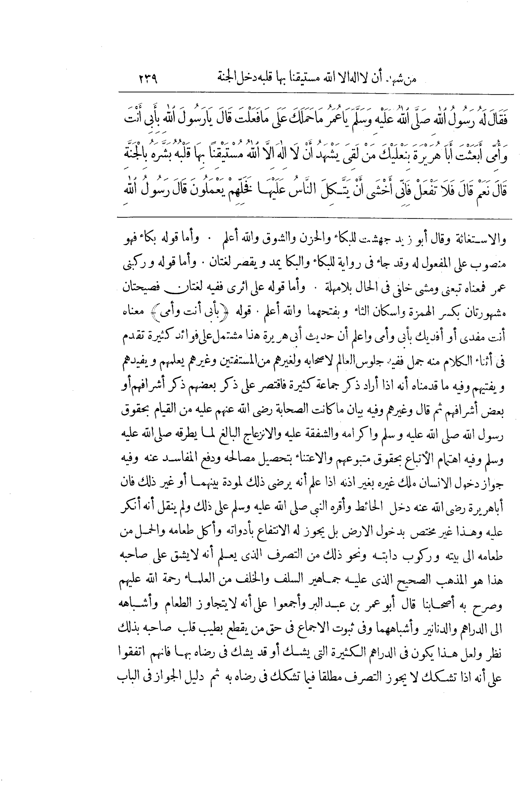 وَالِاسْتِغَاثَةُ وَقَالَ أَبُو زَيْدٍ جَهَشْتُ لِلْبُكَاءِ وَالْحُزْنِ وَالشَّوْقِ وَاللَّهُ أَعْلَمُ وَأَمَّا قَوْلُهُ بُكَاءً فَهُوَ مَنْصُوبٌ عَلَى الْمَفْعُولِ لَهُ وَقَدْ جَاءَ فِي رواية للبكاء والبكا يُمَدُّ وَيُقْصَرُ لُغَتَانِ وَأَمَّا قَوْلُهُ وَرَكِبَنِي عُمَرُ فَمَعْنَاهُ تَبِعَنِي وَمَشَى خَلْفِي فِي الْحَالِ بِلَا مُهْلَةٍ وَأَمَّا قَوْلُهُ عَلَى أَثَرِي فَفِيهِ لُغَتَانِ فَصِيحَتَانِ مَشْهُورَتَانِ بِكَسْرِ الْهَمْزَةِ وَإِسْكَانِ الثَّاءِ وَبِفَتْحِهِمَا وَاللَّهُ أَعْلَمُ قَوْلُهُ (بِأَبِي أَنْتَ وَأُمِّي) مَعْنَاهُ أَنْتَ مُفَدًّى أَوْ أَفْدِيكَ بِأَبِي وَأُمِّي وَاعْلَمْ أَنَّ حَدِيثَ أَبِي هُرَيْرَةَ هَذَا مُشْتَمِلٌ عَلَى فَوَائِدَ كَثِيرَةٍ تَقَدَّمَ فِي أَثْنَاءِ الْكَلَامِ مِنْهُ جُمَلٌ فَفِيهِ جُلُوسُ الْعَالِمِ لِأَصْحَابِهِ وَلِغَيْرِهِمْ مِنَ الْمُسْتَفْتِينَ وَغَيْرِهِمْ يُعَلِّمهُمْ وَيُفِيدُهُمْ وَيُفْتِيهِمْ وَفِيهِ مَا قَدَّمْنَاهُ أَنَّهُ إِذَا أَرَادَ ذِكْرَ جَمَاعَةٍ كَثِيرَةٍ فَاقْتَصَرَ عَلَى ذِكْرِ بَعْضِهِمْ ذَكَرَ أَشْرَافَهُمْ أَوْ بَعْضَ أَشْرَافِهِمْ ثُمَّ قَالَ وَغَيْرَهُمْ وَفِيهِ بَيَانُ مَا كَانَتِ الصَّحَابَةُ رَضِيَ اللَّهُ عَنْهُمْ عَلَيْهِ مِنَ الْقِيَامِ بِحُقُوقِ رَسُولِ اللَّهِ صَلَّى اللَّهُ عَلَيْهِ وَسَلَّمَ وَإِكْرَامِهِ وَالشَّفَقَةِ عَلَيْهِ وَالِانْزِعَاجِ الْبَالِغِ لِمَا يُطْرِقُهُ صَلَّى اللَّهُ عَلَيْهِ وَسَلَّمَ وَفِيهِ اهْتِمَامُ الْأَتْبَاعِ بِحُقُوقِ مَتْبُوعِهِمْ وَالِاعْتِنَاءِ بِتَحْصِيلِ مَصَالِحِهِ وَدَفْعِ الْمَفَاسِدِ عَنْهُ وَفِيهِ جَوَازُ دُخُولِ الْإِنْسَانِ ملك غيره بغير اذنه اذا علم أنه يرضى ذَلِكَ لِمَوَدَّةٍ بَيْنَهُمَا أَوْ غَيْرَ ذَلِكَ فَإِنَّ أَبَا هُرَيْرَةَ رَضِيَ اللَّهُ عَنْهُ دَخَلَ الْحَائِطَ وَأَقَرَّهُ النَّبِيُّ صَلَّى اللَّهُ عَلَيْهِ وَسَلَّمَ عَلَى ذَلِكَ وَلَمْ يُنْقَلْ أَنَّهُ أَنْكَرَ عَلَيْهِ وَهَذَا غَيْرُ مُخْتَصٍّ بِدُخُولِ الْأَرْضِ بَلْ يَجُوزُ لَهُ الِانْتِفَاعُ بِأَدَوَاتِهِ وَأَكْلِ طَعَامِهِ وَالْحَمْلِ مِنْ طَعَامِهِ إِلَى بَيْتِهِ وَرُكُوبِ دَابَّتِهِ وَنَحْوِ ذَلِكَ مِنَ التَّصَرُّفِ الَّذِي يُعْلَمَ أَنَّهُ لَا يَشُقُّ عَلَى صَاحِبِهِ هَذَا هُوَ الْمَذْهَبُ الصَّحِيحُ الَّذِي عَلَيْهِ جَمَاهِيرُ السَّلَفِ وَالْخَلَفِ مِنَ الْعُلَمَاءِ رَحْمَةُ اللَّهِ عَلَيْهِمْ وَصَرَّحَ بِهِ أَصْحَابُنَا قَالَ أَبُو عُمَرَ بْنُ عَبْدِ الْبَرِّ وَأَجْمَعُوا عَلَى أَنَّهُ لَا يَتَجَاوَزُ الطَّعَامَ وَأَشْبَاهَهُ إِلَى الدَّرَاهِمِ وَالدَّنَانِيرِ وَأَشْبَاهِهِمَا وَفِي ثُبُوتِ الْإِجْمَاعِ فِي حَقِّ مَنْ يَقْطَعُ بِطِيبِ قَلْبِ صَاحِبهِ بِذَلِكَ نَظَرٌ وَلَعَلَّ هَذَا يَكُونُ فِي الدَّرَاهِمِ الْكَثِيرَةِ الَّتِي يُشَكُّ أَوْ قَدْ يُشَكُّ فِي رِضَاهُ بِهَا فَإِنَّهُمُ اتَّفَقُوا عَلَى أَنَّهُ إِذَا تَشَكَّكَ لَا يَجُوزُ التَّصَرُّفُ مُطْلَقًا فِيمَا تَشَكَّكَ فِي رِضَاهُ بِهِ ثُمَّ دَلِيلُ الْجَوَازِ فِي الْبَابِ