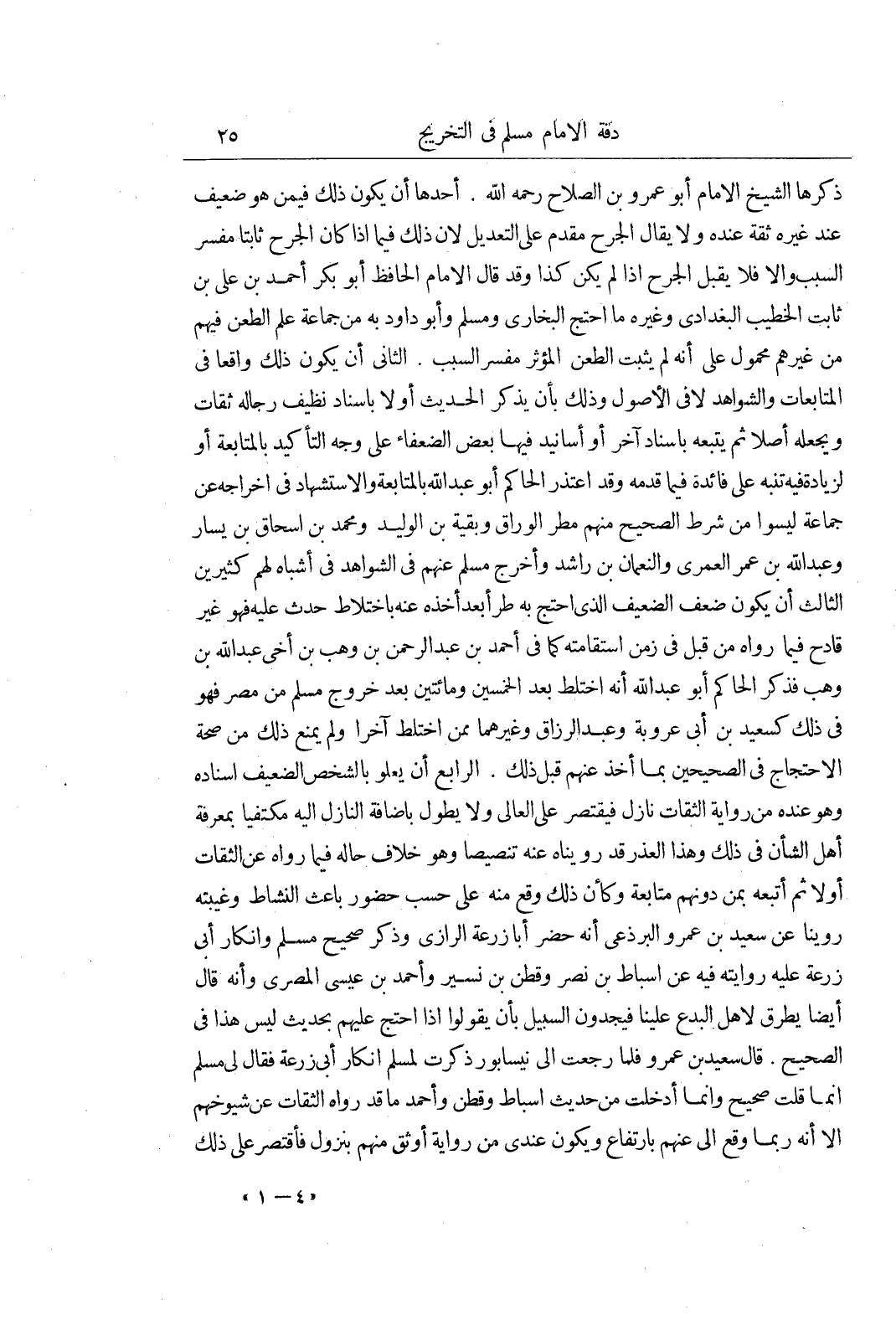 ذكرها الشَّيْخُ الْإِمَامُ أَبُو عَمْرِو بْنُ الصَّلَاحِ رَحِمَهُ الله أحدها أن يكون ذلك فيمن هو ضعيف عند غيره ثقة عنده ولا يقال الجرح مقدم على التعديل لان ذلك فيما اذا كان الجرح ثابتا مفسر السبب والا فلا يقبل الجرح اذا لم يكن كذا وقد قال الامام الحافظ أبو بكر أحمد بن علي بن ثابت الخطيب البغدادي وغيره ما احتج البخارى ومسلم وأبو داود به من جماعة علم الطعن فيهم من غيرهم محمول على أنه لم يثبت الطعن المؤثر مفسر السبب الثاني أن يكون ذلك واقعا في المتابعات والشواهد لافي الأصول وذلك بأن يذكر الحديث أولا باسناد نظيف رجاله ثقات ويجعله أصلا ثم يتبعه باسناد آخر أو أسانيد فيها بعض الضعفاء على وجه التأكيد بالمتابعة أو لزيادة فيه تنبه على فائدة فيما قدمه وقد اعتذر الحاكم أبو عبد الله بالمتابعة والاستشهاد في اخراجه عن جماعة ليسوا من شرط الصحيح منهم مطر الوراق وبقية بن الوليد ومحمد بن إسحاق بن يسار وعبد الله بن عمر العمرى والنعمان بن راشد وأخرج مسلم عنهم في الشواهد في أشباه لهم كثيرين الثالث أن يكون ضعف الضعيف الذى احتج به طرأ بعد أخذه عنه باختلاط حدث عليه فهو غير قادح فيما رواه من قبل في زمن استقامته كما في أحمد بن عبد الرحمن بن وهب بن أخي عبد الله بن وهب فذكر الحاكم أبو عبد الله أنه اختلط بعد الخمسين ومائتين بعد خروج مسلم من مصر فهو في ذلك كسعيد بن أبي عروبة وعبد الرازق وغيرهما ممن اختلط آخرا ولم يمنع ذلك من صحة الاحتجاج في الصحيحين بما أخذ عنهم قبل ذلك الرابع أن يعلو بالشخص الضعيف اسناده وهو عنده من رواية الثقات نازل فيقتصر على العالى ولا يطول باضافة النازل إليه مكتفيا بمعرفه أهل الشأن في ذلك وهذا العذر قد رويناه عنه تنصيصا وهو خلاف حاله فيما رواه عن الثقات أولا ثم أتبعه بمن دونهم متابعة وكأن ذلك وقع منه على حسب حضور باعث النشاط وغيبته روينا عن سعيد بن عمرو البرذعى أنه حضر أبا زرعة الرازي وذكر صحيح مسلم وانكار أبي زرعة عليه روايته فيه عن اسباط بن نصر وقطن بن نسير وأحمد بن عيسى المصرى وأنه قال أيضا يطرق لاهل البدع علينا فيجدون السبيل بأن يقولوا اذا احتج عليهم بحديث ليس هذا في الصحيح قال سعيد بن عمرو فلما رجعت إلى نيسابور ذكرت لمسلم انكار أبي زرعة فقال لي مسلم انما قلت صحيح وانما أدخلت من حديث اسباط وقطن وأحمد ما قد رواه الثقات عن شيوخهم الا أنه ربما وقع إلى عنهم بارتفاع ويكون عندي من رواية أوثق منهم بنزول فأقتصر على ذلك