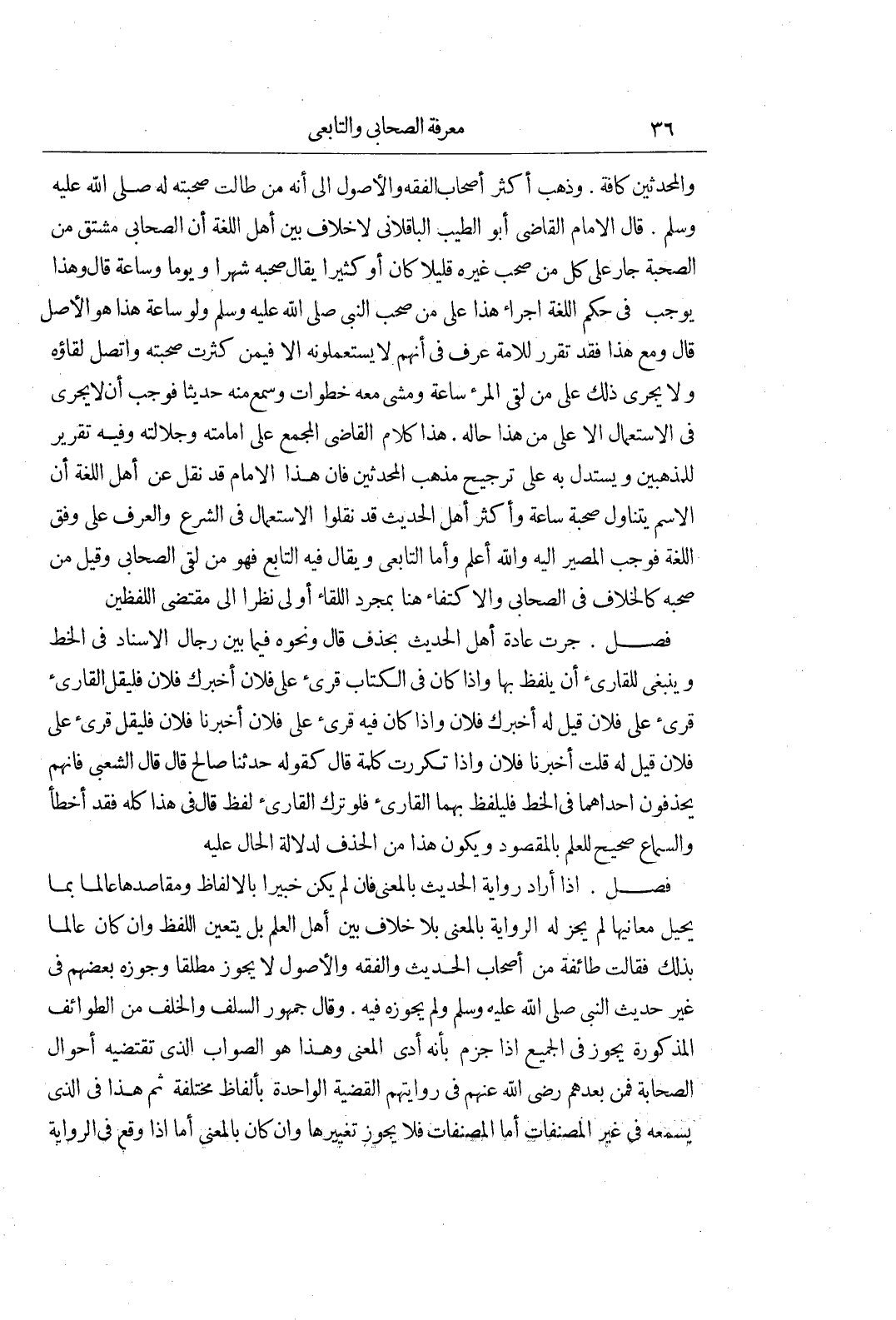 والمحدثين كافة وذهب أكثر أصحاب الفقه والأصول إلى أنه من طالت صحبته له صلى الله عليه وسلم قال الامام القاضي أبو الطيب الباقلانى لاخلاف بين أهل اللغة أن الصحابى مشتق من الصحبة جار على كل من صحب غيره قليلا كان او كثيرا يقال صحبه شهرا ويوما وساعة قال وهذا يوجب فى حكم اللغة اجراء هذا على مَنْ صَحِبَ النَّبِيَّ صَلَّى اللَّهُ عَلَيْهِ وَسَلَّمَ وَلَوْ سَاعَةً هذا هو الأصل قال ومع هذا فقد تقرر للامة عرف فى أنهم لايستعملونه الا فيمن كثرت صحبته واتصل لقاؤه ولا يجرى ذلك على من لقى المرء ساعة ومشى معه خطوات وسمع منه حديثا فوجب أن لايجرى فى الاستعمال الا على من هذا حاله هذا كلام القاضي المجمع على امانته وجلالته وفيه تقرير للمذهبين ويستدل به على ترجيح مذهب المحدثين فان هذا الامام قد نقل عن أهل اللغة أن الاسم يتناول صحبة ساعة وأكثر أهل الحديث قد نقلوا الاستعمال فى الشرع والعرف على وفق اللغة فوجب المصير والله أعلم وأما التابعى ويقال فيه التابع فهو من لقى الصحابى وقيل من صحبه كالخلاف فى الصحابى والاكتفاء هنا بمجرد اللقاء أولى نظرا إلى مقتضى اللفظين