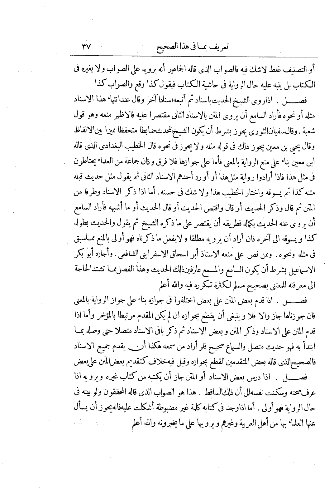اذا قدم بعض المتن على بعض اختلفوا فى جوازه على جواز الرواية بالمعنى فان جوزناها جاز والا فلا وينبغى أن يقطع بجوازه ان لم يكن المقدم مرتبطا بالمؤخر وأما اذا قدم المتن على الاسناد وذكر المتن وبعض الاسناد ثم ذكر باقى الاسناد متصلا حتى وصله بما ابتدأ به فهو حديث متصل والسماع صحيح فلو أراد من سمعه هكذا أن يقدم جميع الاسناد فالصحيح الذى قاله بعض المتقدمين القطع بجوازه وقيل فيه خلاف كتقديم بعض المتن على بعض فصل اذا درس بعض الاسناد أو المتن جاز أن يكتبه من كتاب غيره ويرويه اذا عرف صحته وسكنت نفسه إلى أن ذلك الساقط هذا هو الصواب الذى قاله المحققون ولو بينه فى حال الرواية فهو أولى أما اذا وجد فى كتابه كلمة غير مضبوطة أشكلت عليه فانه يجوز أن يسأل عنها العلماء بها من أهل العربية وغيرهم ويرويها على ما يخبرونه والله أعلم