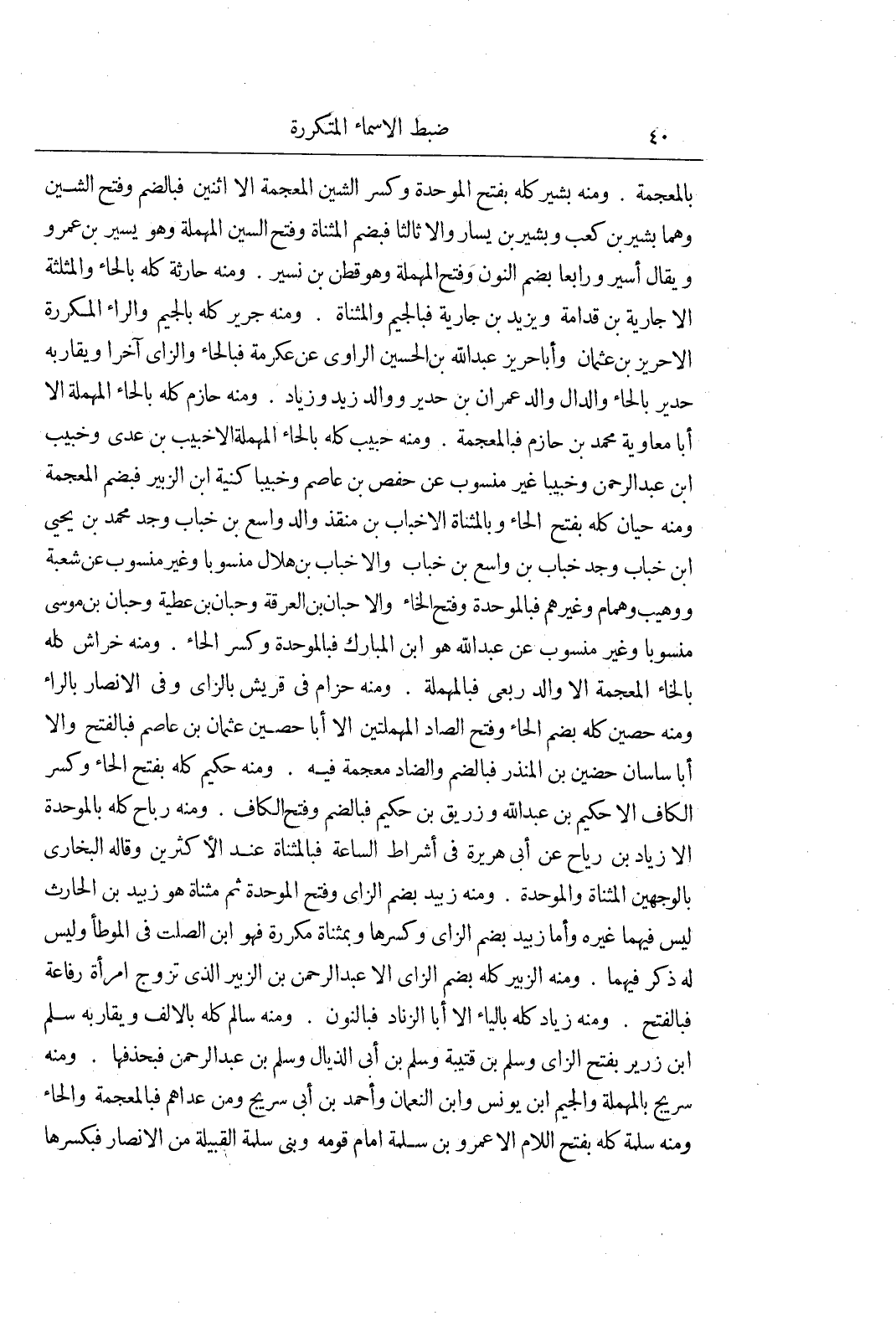 بالمعجمة ومنه بشير كله بفتح الموحدة وكسر الشين المعجمة الا اثنين فبالضم وفتح الشين وهما بشير بن كعب وبشير بن يسار والا ثالثا فبضم المثناة وفتح السين المهملة وهو يسير بن عمرو ويقال أسير ورابعا بضم النون وفتح المهملة وهو قطن بن نسير ومنه حارثة كله بالحاء والمثلثة الا جارية بن قدامة ويزيد بن جارية فبالجيم والمثناة ومنه جرير كله بالجيم والراء المكررة الا حريز بن عثمان وأبا حريز عبد الله بن الحسين الراوى عن عكرمة فبالحاء والزى آخرا ويقاربه حدير بالحاء والدال والد عمران بن حدير ووالد زيد وزياد ومنه حازم كله بالحاء المهملة الا أبا معاوية محمد بن حازم فبالمعجمة ومنه حبيب كله بالحاء المهملة الا خبيب بن عدى وخبيب بن عبد الرحمن وخبيبا غير منسوب عن حفص بن عاصم وخبيبا كنية بن الزبير فبضم المعجمة ومنه حيان كله بفتح الحاء وبالمثناة الا خباب بن منقذ والد واسع بن خباب وجد محمد بن يحيى بن خباب وجد خباب بن واسع بن خباب والا خباب بن هلال منسوبا وغير منسوب عن شعبة ووهيب وهمام وغيرهم فبالموحدة وفتح الخاء والا حبان بن العرقة وحبان بن عطية وحبان بن موسى منسوبا وغير منسوب عن عبد الله هو بن المبارك فبالموحدة وكسر الحاء ومنه خراش كله بالخاء المعجمة الا والد ربعى فبالمهملة ومنه حزام فى قريش بالزى وفى الانصار بالراء ومنه حصين كله بضم الحاء وفتح الصاد المهملتين الا أبا حصين عثمان بن عاصم فبالفتح والا أبا ساسان حضين بن المنذر فبالضم والضاد معجمة فيه ومنه حكيم كله بفتح الحاء وكسر الكاف الا حكيم بن عبد الله وزريق بن حكيم فبالضم وفتح الكاف ومنه رباح كله بالموحدة الا زياد بن رياح عَنْ أَبِي هُرَيْرَةَ فِي أَشْرَاطِ السَّاعَةِ فَبِالْمُثَنَّاةِ عند الأكثرين وقاله البخارى بالوجهين المثناة والموحدة ومنه زبيد بضم الزاى وفتح الموحدة ثم مثناة هو زبيد بن الحارث ليس فيهما غيره وأما زبيد بضم الزاى وكسرها وبمثناة مكررة فهو بن الصلت فى الموطأ وليس له ذكر فيهما ومنه الزبير كله بضم الزاى الا عبد الرحمن بن الزبير الذى تزوج امرأة رفاعة فبالفتح ومنه زياد كله بالياء الا أبا الزناد فبالنون ومنه سالم كله بالالف ويقاربه سلم بن زرير بفتح الزاى وسلم قتيبة وسلم بن أبى الذيال وسلم بن عبد الرحمن فبحذفها ومنه سريح بالمهملة والجيم بن يونس وبن النعمان وأحمد بن أبى سريج ومن عداهم فبالمعجمة والحاء ومنه سلمة كله بفتح اللام الا عمرو بن سلمة امام قومه وبنى سلمة القبيلة من الانصار فبكسرها