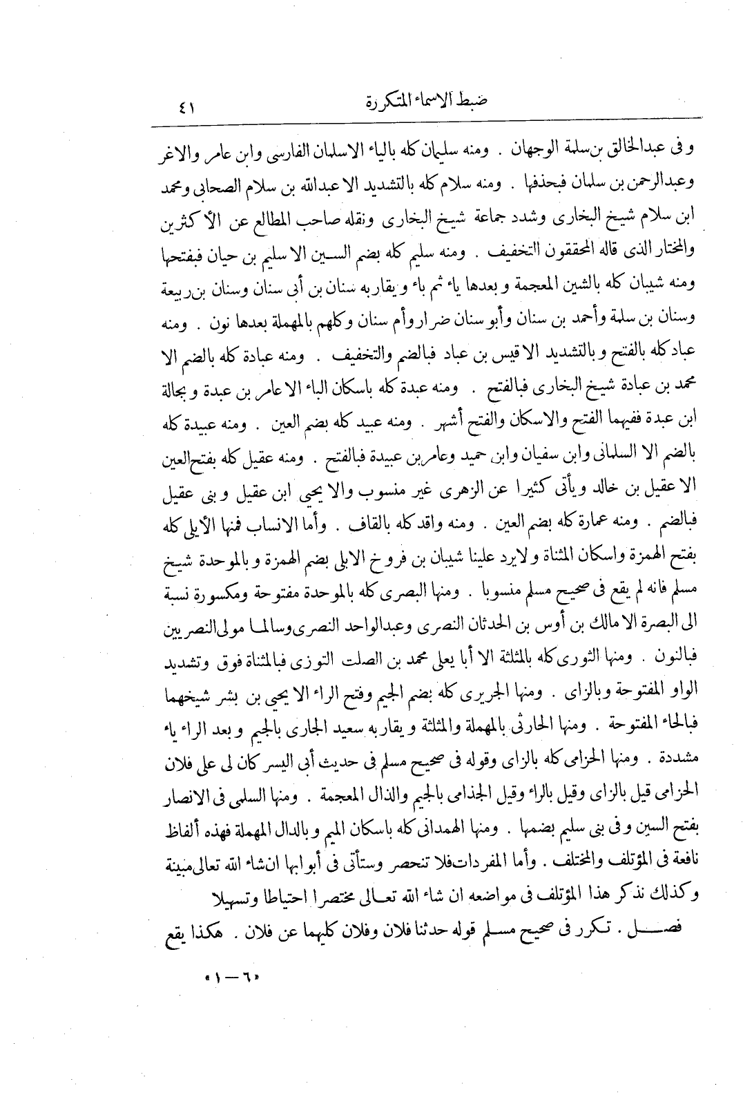 وفى عبد الخالق بن سلمة الوجهان ومنه سليمان كله بالياء الا سلمان الفارسى وبن عامر والاغر وعبد الرحمن بن سلمان فبحذفها ومنه سلام كله بالتشديد الا عبد الله بن سلام الصحابى ومحمد بن سلام شيخ البخارى وشدد جماعة شيخ البخارى ونقله صاحب المطالع عن الأكثرين والمختار الذى قاله المحققون التخفيف ومنه سليم كله بضم السين الا سليم بن حيان فبفتحها ومنه شيبان كله بالشين المعجمة وبعدها ياء ثم باء ويقاربه سنان بن أبى سنان وسنان بن ربيعة وسنان بن سلمة وأحمد بن سنان وأبو سنان ضرار وأم سنان وكلهم بالمهملة بعدها نون ومنه عباد كله بالفتح وبالتشديد الا قيس بن عباد فبالضم والتخفيف ومنه عبادة كله بالضم الا محمد بن عبادة شيخ البخارى فبالفتح ومنه عبدة كله باسكان الباء الا عامر بن عبدة وبجالة بن عبدة ففيهما الفتح والاسكان وافتح أشهر ومنه عبيد كله بضم العين ومنه عبيدة كله بالضم الا السلمانى وبن سفيان وبن حميد وعامر بن عبيدة فبالفتح ومنه عقيل كله بفتح العين الا عقيل بن خالد ويأتى كثيرا عن الزهري غير منسوب والا يحيى بن عقيل وبنى عقيل فبالضم ومنه عمارة كله بضم العين ومنه واقد كله بالقاف وأما الانساب فمنها الأيلى كله بفتح الهمزة واسكان المثناة ولا يرد علينا شيبان بن فروخ الابلى بضم الهمزة وبالموحدة شيخ مسلم فانه لم يقع فى صحيح مسلم منسوبا ومنها البصرى كله بالموحدة مفتوحة ومكسورة نسبة إلى البصرة الا مالك بن أوس بن الحدثان النصرى وعبد الواحد النصرى وسالما مولى النصريين فبالنون ومنها الثورى كله بالمثلثة الا أبا يعلى محمد بن الصلت التوزى فبالمثناة فوق وتشديد الواو المفتوحة وبالزاى ومنها الجريرى كله بضم الجيم وفتح الراء الا يحيى بن بشر شيخهما فالبحاء المفتوحة ومنها الحارثى بالمهملة والمثلثة ويقاربه سعيد الجارى بالجيم وبعد الراء ياء مشددة ومنها الحزامى كله بالزاى وقوله فى صحيح مسلم فى حديث أبى اليسر كان لى على فلان الحازمى قيل بالزاى وقيل بالراء وقيل الجذامى بالجيم والذال المعجمة ومنها السلمى فى الانصار بفتح السين وفى بنى سليم بضمها ومنها الهمدانى كله باسكان الميم وبالدال المهملة فهذه ألفاظ نافعة فى المؤتلف والمختلف وأما المفردات فلا تنحصر وستأتى فى أبوابها ان شاء الله تعالى مبينة وكذلك نذكر هذا المؤتلف فى مواضعه ان شاء الله تعالى مختصرا احتياطا وتسهيلا