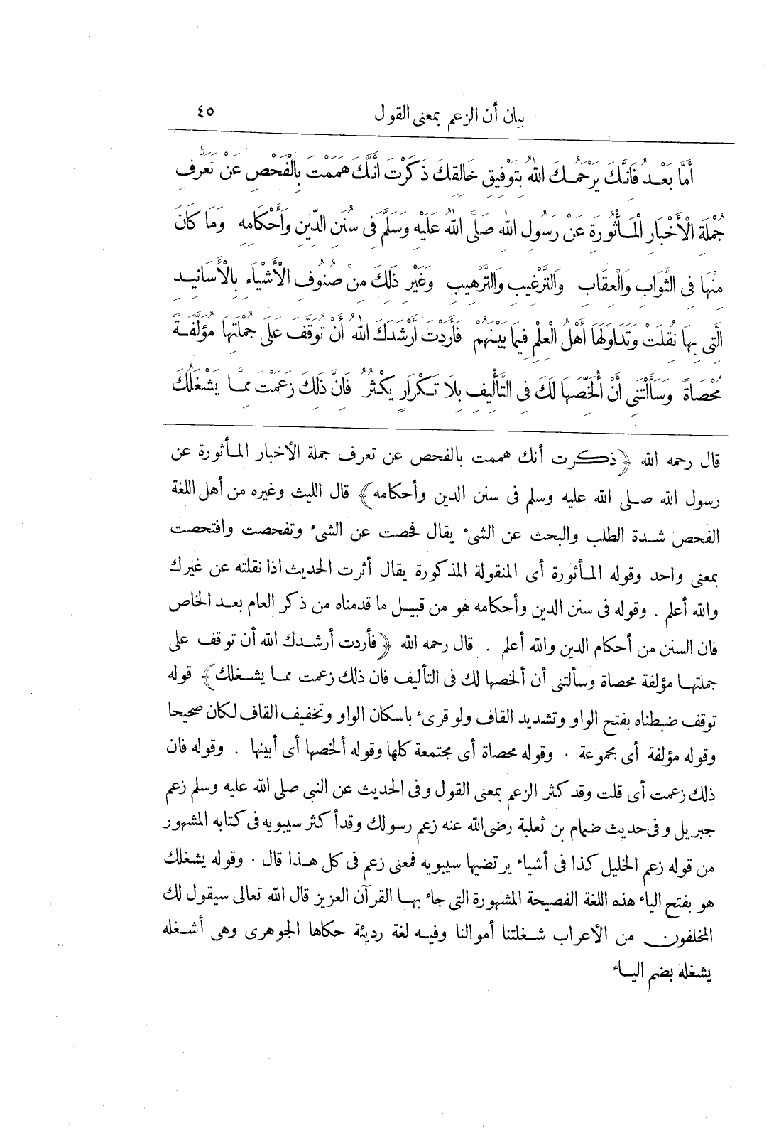 قال رحمه الله (ذكرت أنك هممت بالفحص عن تعرف جملة الأخبار المأثورة عَنْ رَسُولِ اللَّهِ صَلَّى اللَّهُ عَلَيْهِ وَسَلَّمَ في سنن الدين وأحكامه) قال الليث وغيره من أهل اللغة الفحص شدة الطلب والبحث عن الشيء يقال فحصت عن الشيء وتفحصت وافتحصت بمعنى واحد وقوله المأثورة أى المنقولة المذكورة يقال أثرت الحديث اذا نقلته عن غيرك والله أعلم وقوله في سنن الدين وأحكامه هو من قبيل ما قدمناه من ذكر العام بعد الخاص فان السنن من أحكام الدين والله أعلم قال رحمه الله (فأردت أرشدك الله أن توقف على جملتها مؤلفة محصاة وسألتنى أن ألخصها لك في التأليف فان ذلك زعمت مما يشغلك) قوله توقف ضبطناه بفتح الواو وتشديد القاف ولو قرئ باسكان الواو وتخفيف القاف لكان صحيحا وقوله مؤلفة أى مجموعة وقوله محصاة أى مجتمعة كلها وقوله ألخصها أى أبينها وقوله فان ذلك زعمت أى قلت وقد كثر الزعم بمعنى القول وفي الْحَدِيثِ عَنِ النَّبِيِّ صَلَّى اللَّهُ عَلَيْهِ وَسَلَّمَ زعم جبريل وفي حديث ضمام بن ثعلبة رضى الله عنه زعم رسولك وقد أكثر سيبويه في كتابه المشهور من قوله زعم الخليل كذا في أشياء يرتضيها سيبويه فمعنى زعم في كل هذا قال وقوله يشغلك هو بفتح الياء هذه اللغة الفصيحة المشهورة التي جاء بها القرآن العزيز قال الله تعالى سيقول لك المخلفون من الأعراب شغلتنا أموالنا وفيه لغة رديئة حكاها الجوهرى وهي أشغله يشغله بضم الياء