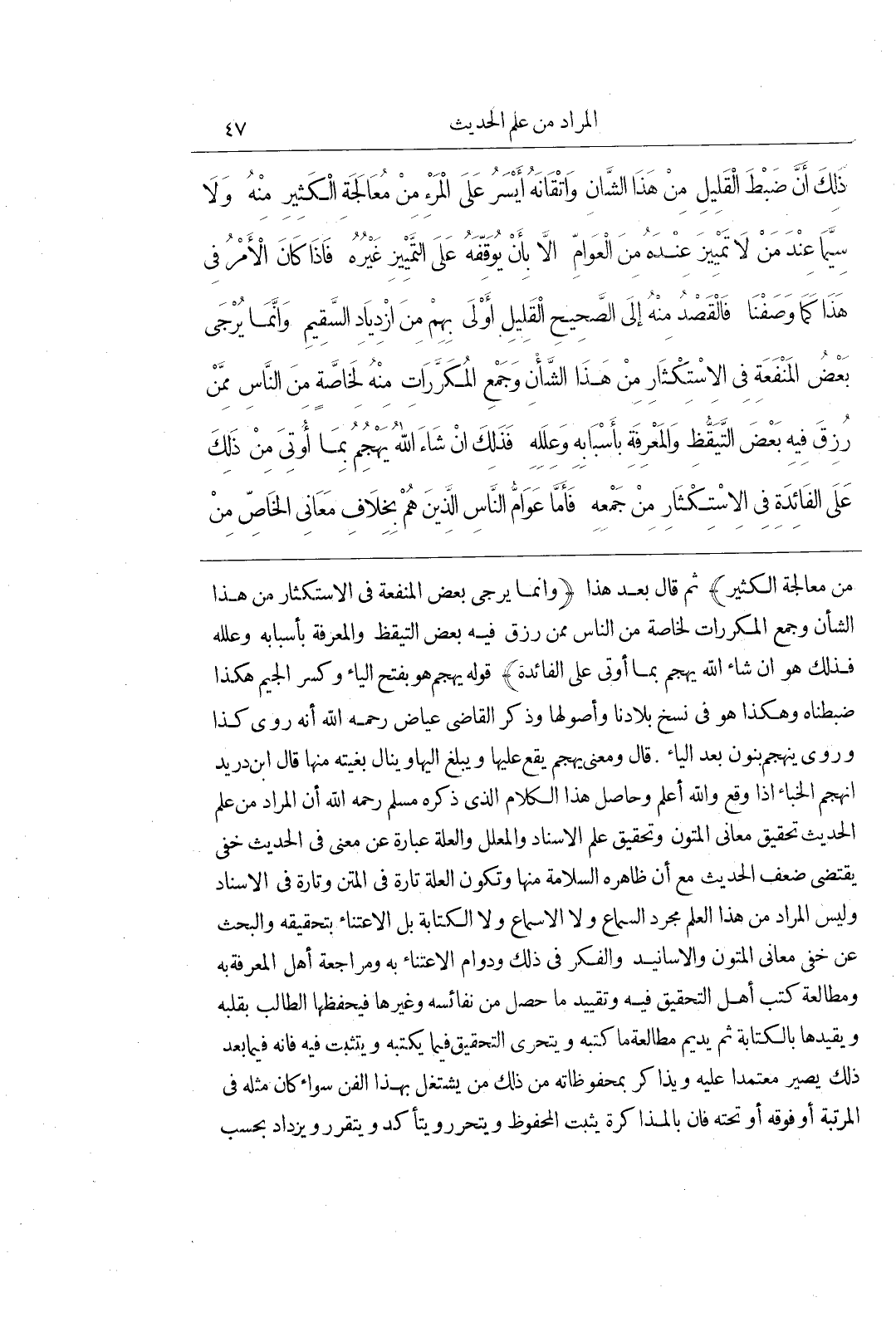 من معالجة الكثير) ثم قال بعد هذا (وانما يرجى بعض المنفعة في الاستكثار من هذا الشأن وجمع المكررات لخاصة من الناس ممن رزق فيه بعض التيقظ والمعرفة بأسبابه وعلله فذلك هو ان شاء الله يهجم بما أوتى على الفائدة) قوله يهجم هو بفتح الياء وكسر الجيم هكذا ضبطناه وهكذا هو في نسخ بلادنا وأصولها وذكر القاضي عياض رحمه الله أنه روى كذا وروى يهجم بنون بعد الياء قاله ومعنى يهجم يقع عليها ويبلغ اليها وينال بغيته منها قال بن دريد انهجم الخباء اذا وقع والله أعلم وحاصل هذا الكلام الذى ذكره مسلم رحمه الله أن المراد من علم الحديث تحقيق معانى المتون وتحقيق علم الاسناد والمعلل والعلة عبارة عن معنى في الحديث خفى يقتضى ضعف الحديث مع أن ظاهرة السلامة منها وتكون العلة تارة في المتن وتارة في الاسناد وليس المراد من هذا العلم مجرد السماع ولا الاسماع ولا الكتابة بل الاعتناء بتحقيقه والبحث عن خفى معانى المتون والاسانيد والفكر في ذلك ودوام الاعتناء به ومراجعة أهل المعرفة به ومطالعة كتب أهل التحقيق فيه وتقييد ما حصل من نفائسه وغيرها فيحفظها الطالب بقلبه ويقيدها بالكتابة ثم يديم مطالعة ما كتبه ويتحرى التحقيق فيما يكتبه ويتثبت فيه فانه فيما بعد ذلك يصير معتمدا عليه ويذاكر بمحفوظاته من ذلك من يشتغل بهذا الفن سواء كان مثله في المرتبة أو فوقه أو تحته فان بالمذاكرة يثبت المحفوظ ويتحرر ويتأكد ويتقرر ويزداد بحسب