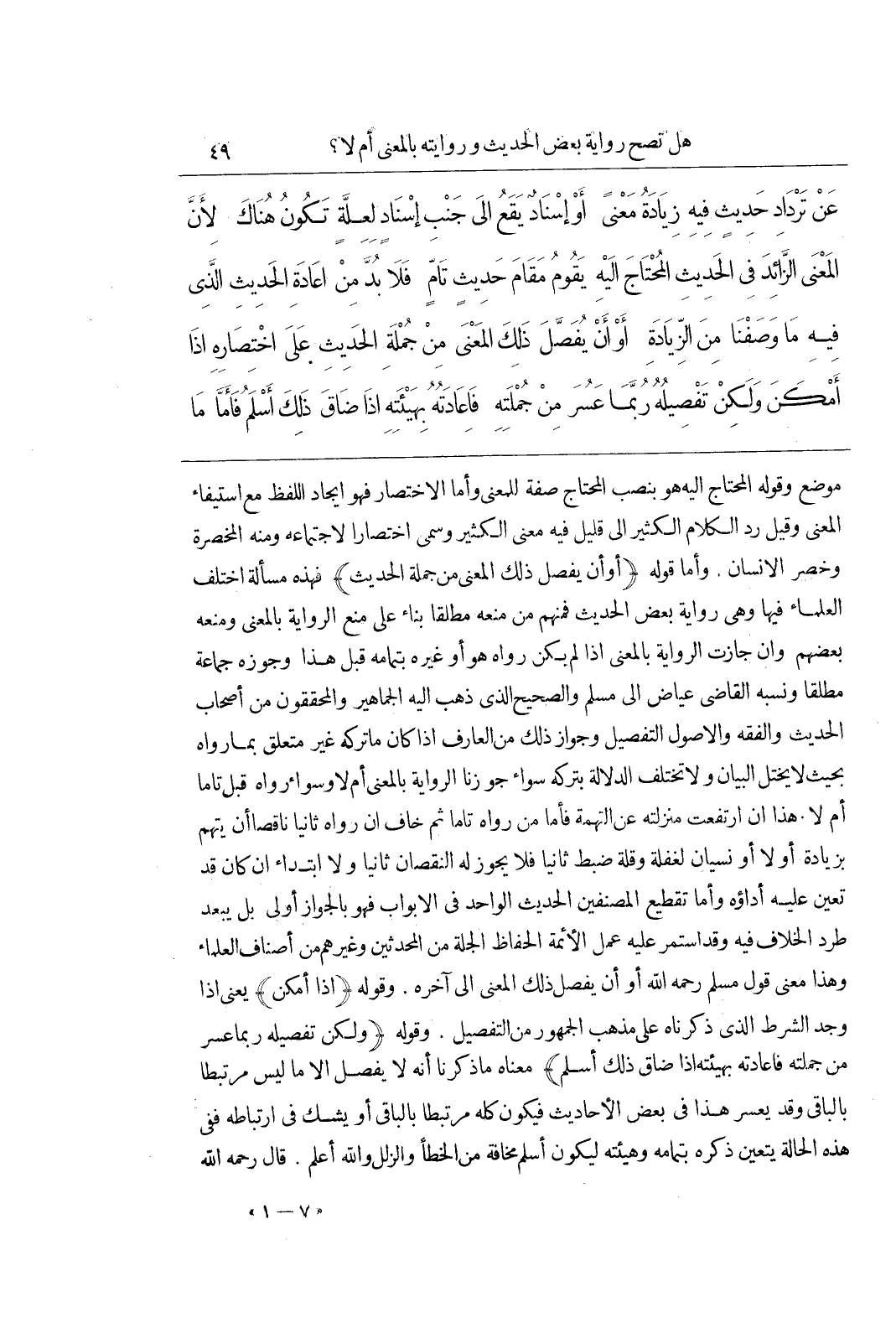 موضع وقوله المحتاج إليه وهو بنصب المحتاج صفة للمعنى وأما الاختصار فهو ايجاد اللفظ مع استيفاء المعنى وقيل رد الكلام الكثير إلى قليل فيه معنى الكثير وسمى اختصارا لاجتماعه ومنه المخصرة وخصر الانسان واما قوله (أو أن يفصل ذلك المعنى من جملة الحديث) فهذه مسألة اختلف العلماء فيها وهي رواية بعض الحديث فمنهم من منعه مطلقا بناء على منع الرواية بالمعنى ومنعه بعضهم وان جازت الرواية بالمعنى اذا لم يكن رواه هو او غيره بتمامه قبل هذا وجوزه جماعة مطلقا ونسبة القاضي عياض إلى مسلم والصحيح الذي ذهب إليه الجماهير والمحققون من أصحاب الحديث والفقه والاصول التفصيل وجواز ذلك من العارف اذا كان ما تركه غير متعلق بما رواه بحيث لا يختل البيان ولا تختلف الدلالة بتركه سواء جوزنا الرواية بالمعنى أم لا وسواء رواه قبل تاما أم لا هذا ان ارتفعت منزلته عن التهمة فأما من رواه تاما ثم خاف ان رواه ثانيا ناقصا أن يتهم بزيادة أولا أو نسيان لغفلة وقلة ضبط ثانيا فلا يجوز له النقصان ثانيا ولا ابتداء ان كان قد تعين عليه اداؤه وأما تقطيع المصنفين الحديث الواحد في الابواب فهو بالجواز أولى بل يبعد طرد الخلاف فيه وقد استمر عليه عمل الأئمة الحفاظ الجلة من المحدثين وغيرهم من أصناف العلماء وهذا معنى قول مسلم رحمه الله أو أن يفصل ذلك المعنى إلى آخره وقوله (اذا أمكن) يعنى اذا وجد الشرط الذي ذكرناه على مذهب الجمهور من التفصيل وقوله (ولكن تفصيله ربما عسر من جملته فاعادته بهيئة اذا ضاق ذلك أسلم) معناه ما ذكرنا أنه لا يفصل الا ما ليس مرتبطا بالباقى وقد يعسر هذا بعض الأحاديث فيكون كله مرتبطا بالباقى او يشك في ارتباطه ففي هذه الحالة يتعين ذكره بتمامه وهيئته ليكون أسلم مخافة من الخطأ والزلل والله أعلم قال رحمه الله