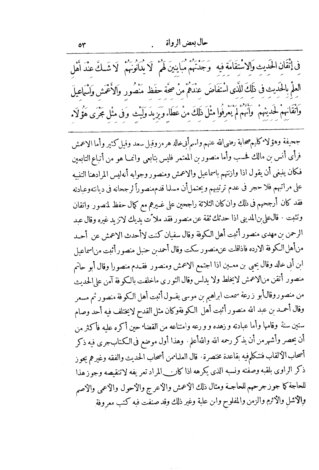 جحيفة وهؤلاء كلهم صحابة رضى الله عنهم واسم أبى خالد هرمز وقيل سعد وقيل كثير وأما الاعمش فرأى أنس بن مالك فحسب وأما منصور بن المعتمر فليس بتابعى وانما هو من أتباع التابعين فكان ينبغى أن يقول اذا وازنتهم باسماعيل والاعمش ومنصور وجوابه أنه ليس المراد هنا التنبيه على مراتبهم فلا حجر فى عدم ترتيبهم ويحتمل أن مسلما قدم منصورا لرجحانه فى ديانته وعبادته فقد كان أرجحهم فى ذلك وان كان الثلاثة راجحين على غيرهم مع كمال حفظ لمنصور واتقان وتثبت قال على بن المديني اذا حدثك ثقة عن منصور فقد ملأت يديك لا تزيد غيره وقال عبد الرحمن بن المهدى منصور أثبت أهل الكوفة وقال سفيان كنت لا أحدث الاعمش عن أحد من أهل الكوفة الا رده فاذا قلت عن منصور سكت وقال أحمد بن حنبل منصور أثبت من إسماعيل بن أبى خالد وقال يحيى بن معين اذا اجتمع الاعمش ومنصور فقدم منصورا وقال أبو حاتم منصور أتقن من الاعمش لا يختلط ولا يدلس وقال الثورى ما خلفت بالكوفة آمن على الحديث من منصور وقال أبو زرعة سمعت ابراهيم بن موسى يقول أثبت أهل الكوفة منصور ثم مسعر وقال أحمد بن عبد الله منصور أثبت أهل الكوفة وكان مثل القدح لا يختلف فيه أحد وصام ستين سنة وقامها وأما عبادته وزهده وورعه وامتناعه من القضاء حين أكره عليه فأكثر من أن يحصر وأشهر من أن يذكر رحمه الله والله أعلم وهذا أول موضوع فى الكتاب جرى فيه ذكر أصحاب الألقاب فنتكلم فيه بقاعدة مختصرة قال العلماء من أصحاب الحديث والفقه وغيرهم يجوز ذكر الراوى بلقبه وصفته ونسبه الذى يكرههه اذا كان المراد تعريفه لا تنقيصه وجوز هذا للحاجة كما جوز جرحهم للحاجة مثال ذلك الاعمش والأعرج والأحول والأعمى والأصم والأشل والأثرم والزمن والمفلوح وبن علية وغير ذلك وقد صنفت فيه كتب معروفة