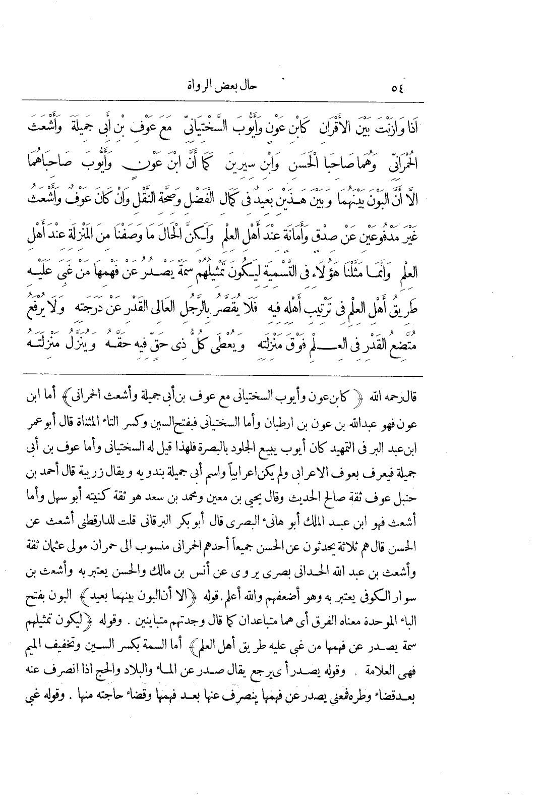 قال رحمه الله (كابن عون وأيوب السختيانى مع عوف بن أبى جميلة وأشعث الحمرانى) أما بن عون فهو عبد الله بن عون بن ارطبان وأما السختيانى فبفتح السين وكسر التاء المثناة قَالَ أَبُو عُمَرَ بْنُ عَبْدِ الْبَرِّ فِي التَّمْهِيدِ كان أيوب يبيع الجلود بالبصرة فلهذا قيل له السختيانى وأما عوف بن أبى جميلة فيعرف بعوف الاعرابى ولم يكن اعرابيا واسم أبى جميلة بندويه ويقال زريبة قال أحمد بن حنبل عوف ثقة صالح الحديث وقال يحيى بن معين ومحمد بن سعد هو ثقة كنيته أبو سهل وأما أشعث فهو بن عبد الملك أبو هانئ البصرى قال أبو بكر البرقانى قلت للدارقطنى أشعث عن الحسن قال هم ثلاثة يحدثون عن الحسن جميعا أحدهم الحمرانى منسوب إلى حمران مولى عثمان ثقة وأشعث بن عبد الله الحدانى بصرى يروى عن أنس بن مالك والحسن يعتبر به وأشعث بن سوار الكوفى يعتبر به وهو أضعفهم والله أعلم قوله (الا أن البون بينهما بعيد) البون بفتح الباء الموحدة معناه الفرق أى هما متباعدان كما قال وجدتهم متباينين وقوله (ليكون تمثيلهم سمة يصدر عن فهمها من غبى عليه طريق أهل العلم) أما السمة بكسر السين وتخفيف الميم فهي العلامة وقوله يصدر أى يرجع يقال صدر عن الماء والبلاد والحج اذا انصرف عنه بعد قضاء وطره فمعنى يصدر عن فهمها ينصرف عنها بعد فهمها وقضاء حاجته منها وقوله غبى