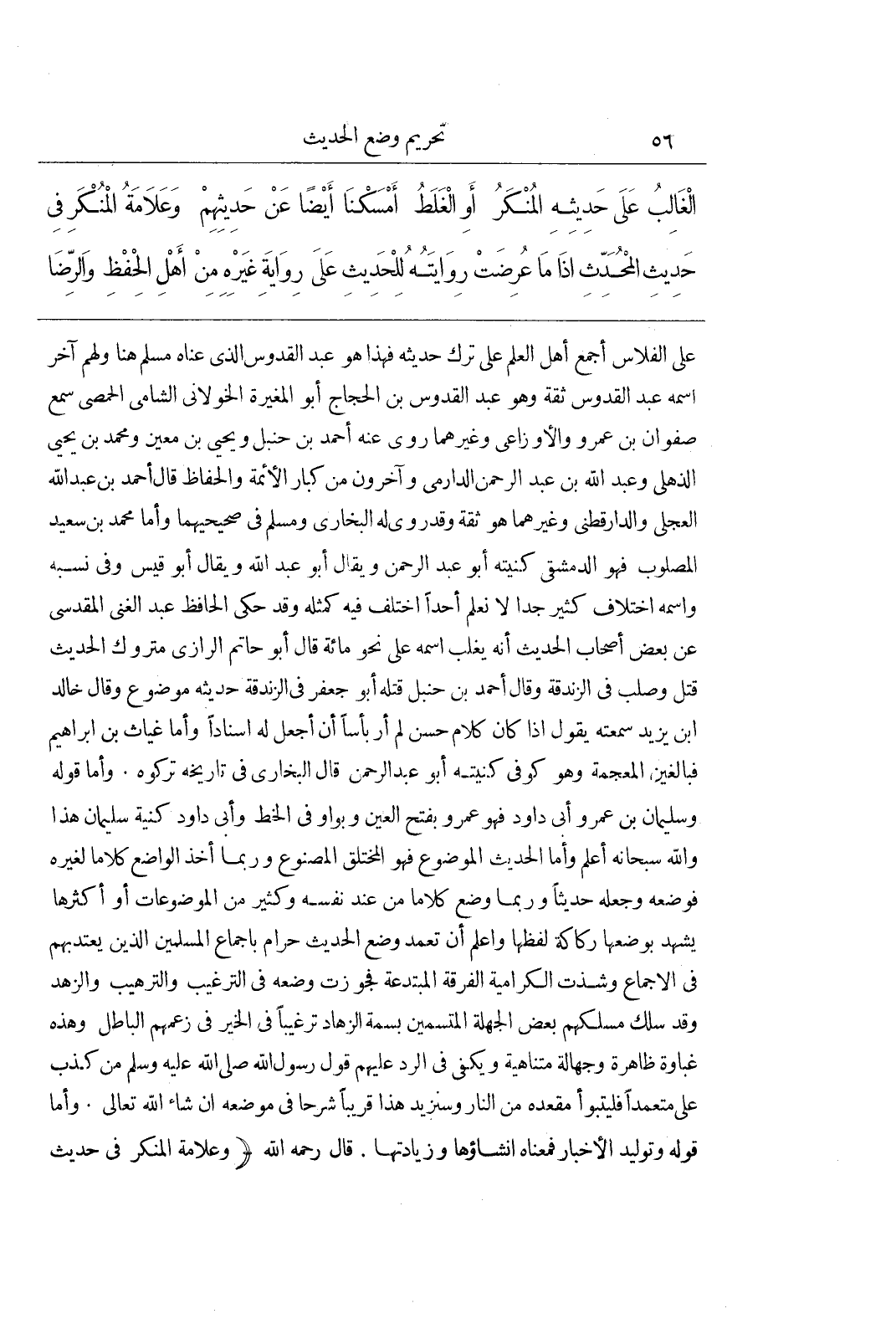 على الفلاس أجمع أهل العلم على ترك حديثه فهذا هو عبد القدوس الذى عناه مسلم هنا ولهم آخر اسمه عبد القدوس ثقة وهو عبد القدوس بن الحجاج أبو المغيرة الخولانى الشامى الحمصى سمع صفوان بن عمرو والأوزاعى وغيرهما روى أحمد بن حنبل ويحيى بن معين ومحمد بن يحيى الذهلى وعبد الله بن عبد الرحمن الدارمى وآخرون من كبار الأئمة والحفاظ قال أحمد بن عبد الله العجلى والدارقطنى وغيرهما هو ثقة وقد روى له البخارى ومسلم فى صحيحهما وأما محمد بن سعيد المصلوب فهو الدمشقى كنيته أبو عبد الرحمن ويقال أبو عبد الله ويقال أبو قيس وفى نسبه واسمه اختلاف كثير جدا لانعلم أحدا اختلف فيه كمثله وقد حكى الحافظ عبد الغنى المقدسى عن بعض أصحاب الحديث أنه يغلب اسمه على نحو مائة قال أبو حاتم الرازى متروك الحديث قتل وصلب فى الزندقة وقال أحمد بن حنبل قتله أبو جعفر فى الزندقة حديثه موضوع وقال خالد بن يزيد سمعته يقول اذا كان كلام حسن لم أر بأسا أن أجعل له اسنادا وأما غياث بن ابراهيم فبالغين المعجمة وهو كوفى كنيته أبو عبد الرحمن قال البخارى فى تاريخه تركوه وأما قوله وسليمان بن عمرو أبى داود فهو عمرو بفتح العين وبواو فى الخط وأبى دواد كنية سليمان هذا والله سبحانه أعلم وأما الحديث الموضوع فهو المختلق المصنوع وربما أخذ الواضع كلاما لغيره فوضعه وجعله حديثا وربما وضع كلاما من عند نفسه وكثير من الموضوعات أو أكثرها يشهد بوضعها ركاكة لفظها واعلم أن تعمد وضع الحديث حرام بِإِجْمَاعِ الْمُسْلِمِينَ الَّذِينَ يُعْتَدُّ بِهِمْ فِي الْإِجْمَاعِ وشذت الكرامية الفرقة المبتدعة فجوزت وضعه فى الترغيب والترهيب والزهد وقد سلك مسلكهم بعض الجهلة المتسمين بسمة الزهاد ترغيبا فى الخير فى زعمهم الباطل وهذه غباوة ظاهرة وجهالة متناهية ويكفى فى الرد عليهم قَوْلُ رَسُولِ اللَّهِ صَلَّى اللَّهُ عَلَيْهِ وَسَلَّمَ من كَذَبَ عَلَيَّ مُتَعَمِّدًا فَلْيَتَبَوَّأْ مَقْعَدَهُ مِنَ النَّارِ وسنزيد هذا قريبا شرحا فِي مَوْضِعِهِ إِنْ شَاءَ اللَّهُ تَعَالَى وَأَمَّا قوله وتوليد الأخبار فمعناه انشاؤها وزيادتها قال رحمه الله (وعلامة المنكر فى الحديث