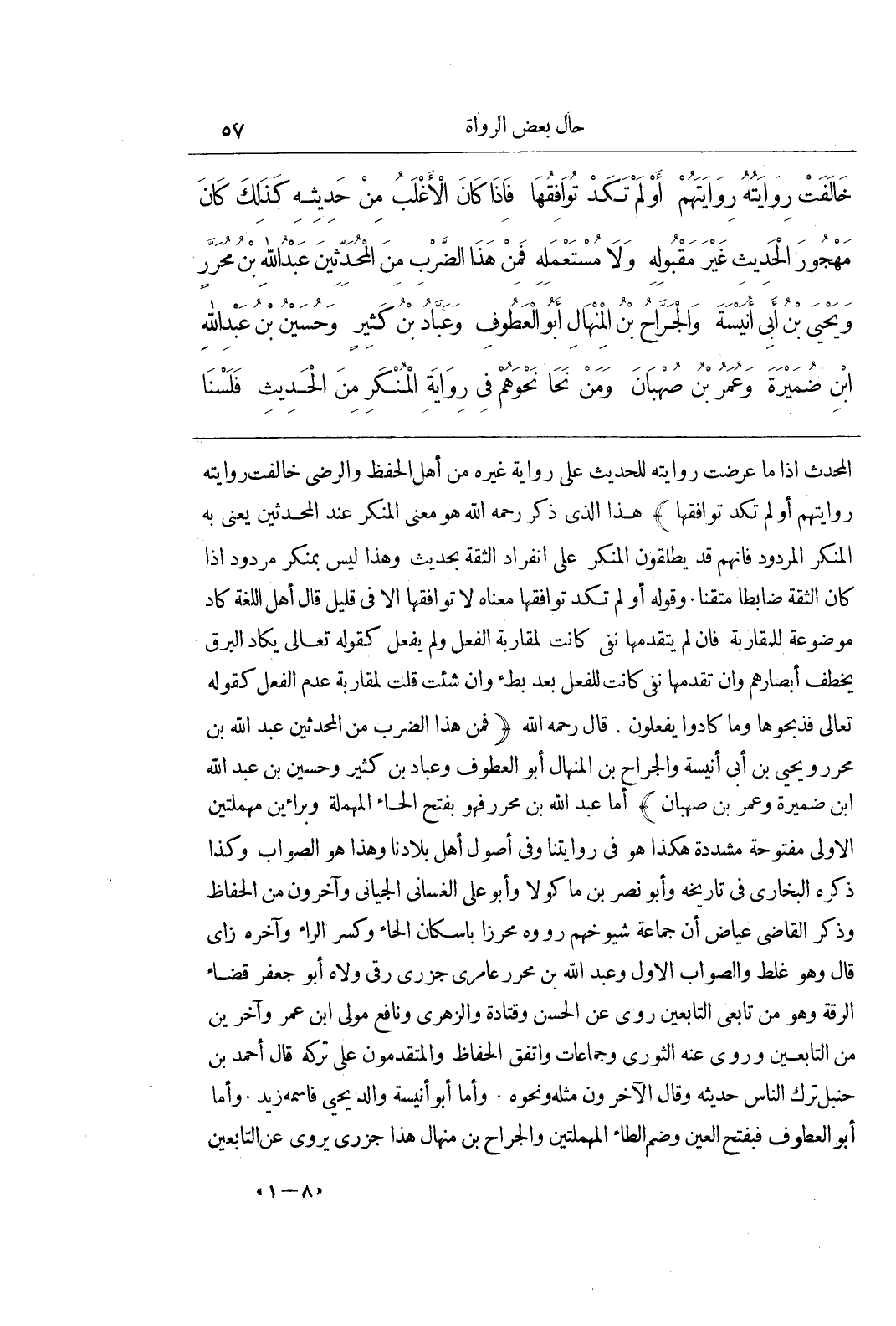 المحدث اذا ما عرضت روايته للحديث على رواية غيره من أهل الحفظ والرضى خالفت روايته روايتهم أو لم تكد توافقها) هذا الذى ذكر رحمه الله هو المعنى المنكر عند المحدثين يعنى به المنكر المردود فانهم قد يطلقون المنكر على انفراد الثقة بحديث وهذا ليس بمنكر مردود اذا كان الثقة ضابطا متقنا وقوله أو لم تكد توافقها معناه لا توافقها الا فى قليل قال أهل اللغة كاد موضوعة للمقاربة فان لم يتقدمها نفى كانت لمقاربة الفعل ولم يفعل كقوله تعالى يكاد البرق يخطف أبصارهم وان تقدمها نفى كانت للفعل بعد بطء وان شئت قلت لمقاربة عدم الفعل كقوله تعالى فذبحوها وما كادوا يفعلون قال رحمه الله (فمن هذا الضرب من المحدثين عبد الله بن محرر ويحيى بن ابى أنيسة والجراح بن المنهال أبو العطوف وعباد بن كثير وحسين بن عبد الله بن ضميرة وعمر بن صهبان) أما عبد الله بن محرر فهو بفتح الحاء المهملة وبرائين مهملتين الاولى مفتوحة مشددة هكذا هو وفى روايتنا وف أصول أهل بلادنا وهذا هو الصواب وكذا ذكره البخارى فى تاريخه وأبو نصر بن ماكولا وأبو على الغسانى الجيانى وآخرون من الحفاظ وذكر القاضي عياض أن جماعة شيوخهم رووه محرزا باسكان الحاء وكسر الراء وآخره زاى قال وهو غلط والصواب الاول وعبد الله بن محرر عامرى جزرى رقى ولاه أبو جعفر قضاء الرقة وهو من تابعى التابعين روى عن الحسن وقتادة والزهرى ونافع مولى بن عمر وآخرين من التابعين وروى عنه الثورى وجماعات واتفق الحفاظ والمتقدمون على تركه قال أحمد بن حنبل ترك الناس حديثه وقال الآخرون مثله ونحوه وأما أبو أنيسة والد يحيى فاسمه زيد وأما أبو العطوف فبفتح العين وضم الطاء المهملتين والجراح بن منهال هذا جزرى يروى عن التابعين