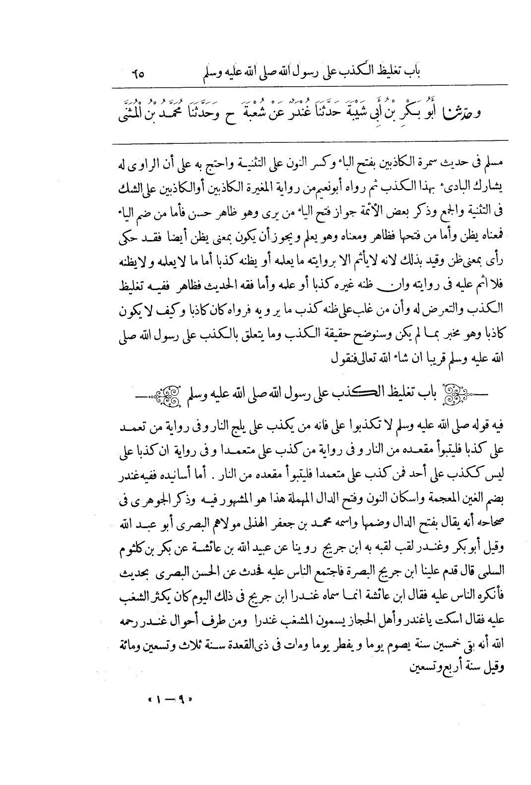 [1] فِيهِ قَوْلُهُ صَلَّى اللَّهُ عَلَيْهِ وَسَلَّمَ لَا تَكْذِبُوا عَلَيَّ فَإِنَّهُ مَنْ يَكْذِبْ عَلَيَّ يَلِجِ النَّارَ وَفِي رِوَايَةٍ مَنْ تَعَمَّدَ عَلَيَّ كَذِبًا فَلْيَتَبَوَّأْ مَقْعَدَهُ مِنِ النَّارِ وَفِي رِوَايَةٍ مَنْ كَذَبَ عَلَيَّ مُتَعَمِّدًا وَفِي رِوَايَةٍ إِنَّ كَذِبًا عَلَيَّ لَيْسَ كَكَذِبٍ عَلَى أَحَدٍ فَمَنْ كَذَبَ عَلَيَّ مُتَعَمِّدًا فَلْيَتَبَوَّأْ مَقْعَدَهُ مِنَ النَّارِ أَمَّا أَسَانِيدُهُ فَفِيهِ غُنْدَرٌ بِضَمِّ الْغَيْنِ الْمُعْجَمَةِ وَإِسْكَانِ النُّونِ وَفَتْحِ الدَّالِ الْمُهْمَلَةِ هَذَا هُوَ الْمَشْهُورُ فِيهِ وَذَكَرَ الْجَوْهَرِيُّ فِي صِحَاحِهِ أَنَّهُ يُقَالُ بِفَتْحِ الدَّالِ وَضَمِّهَا وَاسْمُهُ مُحَمَّدُ بْنُ جَعْفَرٍ الْهُذَلِيُّ مَوْلَاهُمُ الْبَصْرِيُّ أَبُو عَبْدِ اللَّهِ وَقِيلَ أَبُو بَكْرٍ وَغُنْدَرٌ لَقَبٌ لقبه به بن جُرَيْجٍ رُوِّينَا عَنْ عُبَيْدِ اللَّهِ بْنِ عَائِشَةَ عَنْ بَكْرِ بْنِ كُلْثُومٍ السُّلَمِيِّ قَالَ قَدِمَ علينا بن جُرَيْجٍ الْبَصْرَةَ فَاجْتَمَعَ النَّاسُ عَلَيْهِ فَحَدَّثَ عَنِ الْحَسَنِ الْبَصْرِيِّ بِحَدِيثٍ فَأَنْكَرَهُ النَّاسُ عَلَيْهِ فَقَالَ بن عائشة انما سماه غندرا بن جُرَيْجٍ فِي ذَلِكَ الْيَوْمِ كَانَ يُكْثِرُ الشَّغْبُ عَلَيْهِ فَقَالَ اسْكُتْ يَا غُنْدَرُ وَأَهْلُ الْحِجَازِ يُسَمُّونَ الْمُشْغِبَ غُنْدَرًا وَمِنْ طُرَفِ أَحْوَالِ غُنْدَرٍ رَحِمَهُ اللَّهُ أَنَّهُ بَقِيَ خَمْسِينَ سَنَةً يَصُومُ يَوْمًا وَيُفْطِرُ يَوْمًا وَمَاتَ فِي ذِي الْقَعْدَةِ سَنَةَ ثَلَاثٍ وَتِسْعِينَ وَمِائَةٍ وَقِيلَ سَنَةَ أَرْبَعٍ وتسعين