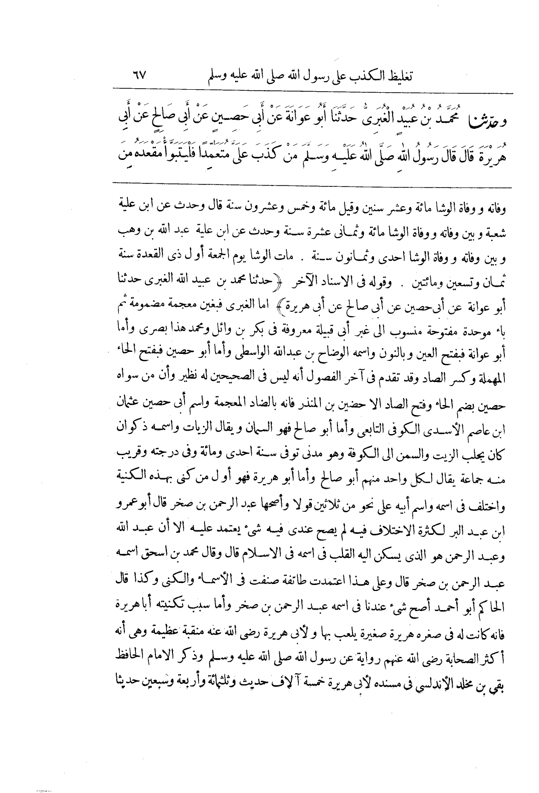 [3] (حَدَّثَنَا مُحَمَّدُ بْنُ عُبَيْدِ اللَّهِ الْغُبَرِيُّ حَدَّثَنَا أَبُو عَوَانَةَ عَنْ أَبِي حُصَيْنٍ عَنْ أَبِي صَالِحٍ عَنْ أَبِي هُرَيْرَةَ) أَمَّا الْغُبَرِيُّ فَبِغَيْنٍ مُعْجَمَةٍ مَضْمُومَةٍ ثُمَّ بَاءٍ مُوَحَّدَةٍ مَفْتُوحَةٍ مَنْسُوبٌ إِلَى غُبَرَ أَبِي قَبِيلَةٍ مَعْرُوفَةٍ فِي بَكْرِ بْنِ وَائِلٍ وَمُحَمَّدٌ هَذَا بَصْرِيٌّ وَأَمَّا أَبُو عَوَانَةَ فَبِفَتْحِ الْعَيْنِ وَبِالنُّونِ وَاسْمُهُ الْوَضَّاحُ بْنُ عَبْدِ اللَّهِ الْوَاسِطِيُّ وَأَمَّا أَبُو حُصَيْنٍ فَبِفَتْحِ الْحَاءِ الْمُهْمَلَةِ وَكَسْرِ الصَّادِ وَقَدْ تَقَدَّمَ فِي آخِرِ الْفُصُولِ أَنَّهُ لَيْسَ فِي الصَّحِيحَيْنِ لَهُ نَظِيرٌ وَأَنَّ مَنْ سِوَاهُ حُصَيْنٌ بِضَمِّ الْحَاءِ وَفَتْحِ الصَّادِ إِلَّا حُضَيْنَ بْنَ الْمُنْذِرِ فَإِنَّهُ بِالضَّادِ الْمُعْجَمَةِ وَاسْمُ أَبِي حُصَيْنٍ عُثْمَانُ بْنُ عَاصِمٍ الْأَسَدِيُّ الْكُوفِيُّ التَّابِعِيُّ وَأَمَّا أَبُو صَالِحٍ فَهُوَ السَّمَّانُ وَيُقَالُ الزَّيَّاتُ وَاسْمُهُ ذَكْوَانُ كَانَ يَجْلِبُ الزَّيْتَ وَالسَّمْنَ إِلَى الْكُوفَةِ وَهُوَ مَدَنِيٌّ تُوُفِّيَ سَنَةَ إِحْدَى وَمِائَةٍ وَفِي دَرَجَتِهِ وَقَرِيبٌ مِنْهُ جَمَاعَةٌ يُقَالُ لِكُلِّ وَاحِدٍ مِنْهُمْ أَبُو صَالِحٍ وَأَمَّا أَبُو هُرَيْرَةَ فَهُوَ أَوَّلُ مَنْ كُنِّيَ بِهَذِهِ الْكُنْيَةِ وَاخْتُلِفَ فِي اسْمِهِ وَاسْمِ أَبِيهِ عَلَى نَحْوٍ مِنْ ثَلَاثِينَ قَوْلًا وَأَصَحُّهَا عَبْدُ الرَّحْمَنِ بْنُ صَخْرٍ قَالَ أَبُو عَمْرِو بْنُ عَبْدِ الْبَرِّ لِكَثْرَةِ الِاخْتِلَافِ فِيهِ لَمْ يَصِحَّ عِنْدِي فِيهِ شَيْءٌ يُعْتَمَدُ عَلَيْهِ إِلَّا أَنَّ عَبْدَ اللَّهِ وَعَبْدَ الرَّحْمَنِ هُوَ الَّذِي يَسْكُنُ إِلَيْهِ الْقَلْبُ فِي اسْمِهِ فِي الْإِسْلَامِ قَالَ وَقَالَ مُحَمَّدُ بْنُ إِسْحَاقَ اسْمُهُ عَبْدُ الرَّحْمَنِ بْنُ صَخْرٍ قَالَ وَعَلَى هَذَا اعْتَمَدَتْ طَائِفَةٌ صَنَّفَتْ فِي الْأَسْمَاءِ وَالْكُنَى وَكَذَا قَالَ الْحَاكِمُ أَبُو أَحْمَدَ أَصَحُّ شَيْءٍ عِنْدنَا فِي اسْمِهِ عَبْدُ الرَّحْمَنِ بْنُ صَخْرٍ وَأَمَّا سَبَبُ تَكْنِيَتِهِ أَبَا هُرَيْرَةَ فَإِنَّهُ كَانَتْ لَهُ فِي صِغَرِهِ هُرَيْرَةٌ صَغِيرَةٌ يَلْعَبُ بِهَا وَلِأَبِي هُرَيْرَةَ رَضِيَ اللَّهُ عَنْهُ مَنْقَبَةٌ عَظِيمَةٌ وَهِيَ أَنَّهُ أَكْثَرُ الصَّحَابَةِ رَضِيَ اللَّهُ عَنْهُمْ رِوَايَةً عَنْ رَسُولِ اللَّهِ صَلَّى اللَّهُ عَلَيْهِ وَسَلَّمَ وَذَكَرَ الْإِمَامُ الْحَافِظُ بَقِيُّ بْنُ مَخْلَدٍ الْأَنْدَلُسِيُّ فِي مُسْنَدِهِ لِأَبِي هُرَيْرَةَ خَمْسَةَ آلَافِ حَدِيثٍ وَثَلَاثَمِائَةٍ وَأَرْبَعَةً وسبعين حديثا