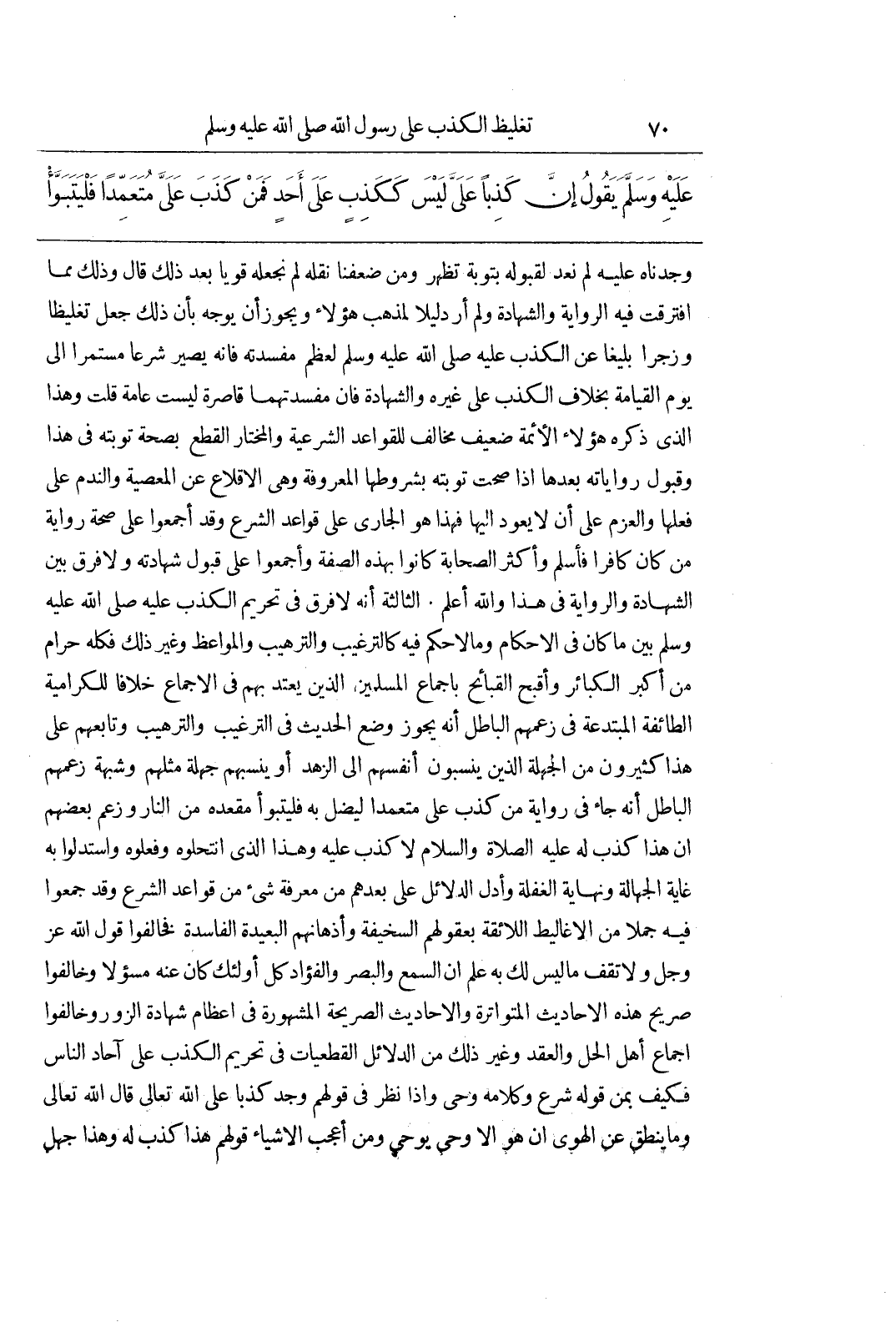 وَجَدْنَاهُ عَلَيْهِ لَمْ نَعُدْ لِقَبُولِهِ بِتَوْبَةٍ تَظْهَرُ وَمَنْ ضَعَّفْنَا نَقْلَهُ لَمْ نَجْعَلْهُ قَوِيًّا بَعْدَ ذَلِكَ قَالَ وَذَلِكَ مِمَّا افْتَرَقَتْ فِيهِ الرِّوَايَةُ وَالشَّهَادَةُ وَلَمْ أَرَ دَلِيلًا لِمَذْهَبِ هَؤُلَاءِ وَيَجُوزُ أَنْ يُوَجَّهَ بِأَنَّ ذَلِكَ جُعِلَ تَغْلِيظًا وَزَجْرًا بَلِيغًا عَنِ الْكَذِبِ عَلَيْهِ صَلَّى اللَّهُ عَلَيْهِ وَسَلَّمَ لِعِظَمِ مَفْسَدَتِهِ فَإِنَّهُ يَصِيرُ شَرْعًا مُسْتَمِرًّا إِلَى يَوْمِ الْقِيَامَةِ بِخِلَافِ الْكَذِبِ عَلَى غَيْرِهِ وَالشَّهَادَةِ فَإِنَّ مَفْسَدَتَهُمَا قَاصِرَةٌ لَيْسَتْ عَامَّةٌ قُلْتُ وَهَذَا الَّذِي ذَكَرَهُ هَؤُلَاءِ الْأَئِمَّةُ ضَعِيفٌ مُخَالِفٌ لِلْقَوَاعِدِ الشَّرْعِيَّةِ وَالْمُخْتَارُ الْقَطْعُ بِصِحَّةِ تَوْبَتِهِ فِي هَذَا وَقَبُولِ رِوَايَاتِهِ بَعْدَهَا إِذَا صَحَّتْ تَوْبَتُهُ بِشُرُوطِهَا الْمَعْرُوفَةِ وَهِيَ الْإِقْلَاعُ عَنِ الْمَعْصِيَةِ وَالنَّدَمِ على فعلها والعزم على أن لايعود إِلَيْهَا فَهَذَا هُوَ الْجَارِي عَلَى قَوَاعِدِ الشَّرْعِ وَقَدْ أَجْمَعُوا عَلَى صِحَّةِ رِوَايَةِ مَنْ كَانَ كَافِرًا فَأَسْلَمَ وَأَكْثَرُ الصَّحَابَةِ كَانُوا بِهَذِهِ الصِّفَةِ وَأَجْمَعُوا عَلَى قَبُولِ شَهَادَتِهِ وَلَا فَرْقَ بَيْنَ الشَّهَادَةِ وَالرِّوَايَةِ فِي هَذَا وَاللَّهُ أَعْلَمُ الثَّالِثَةُ أنه لافرق فِي تَحْرِيمِ الْكَذِبِ عَلَيْهِ صَلَّى اللَّهُ عَلَيْهِ وَسَلَّمَ بَيْنَ مَا كَانَ فِي الْأَحْكَامِ وَمَا لَا حُكْمَ فِيهِ كَالتَّرْغِيبِ وَالتَّرْهِيبِ وَالْمَوَاعِظِ وَغَيْرِ ذَلِكَ فَكُلُّهُ حَرَامٌ مِنْ أَكْبَرِ الْكَبَائِرِ وَأَقْبَحِ الْقَبَائِحِ بِإِجْمَاعِ الْمُسْلِمِينَ الَّذِينَ يُعْتَدُّ بِهِمْ فِي الْإِجْمَاعِ خِلَافًا لِلْكَرَّامِيَّةِ الطَّائِفَةِ الْمُبْتَدِعَةِ فِي زَعْمِهِمُ الْبَاطِلِ أَنَّهُ يَجُوزُ وَضْعُ الْحَدِيثِ فِي التَّرْغِيبِ وَالتَّرْهِيبِ وَتَابَعَهُمْ عَلَى هَذَا كَثِيرُونَ مِنَ الْجَهَلَةِ الَّذِينَ يَنْسُبُونَ أَنْفُسَهُمْ إِلَى الزُّهْدِ أَوْ يَنْسُبهُمْ جَهَلَةٌ مِثْلُهمْ وَشُبْهَةُ زَعْمِهِمُ الْبَاطِلِ أَنَّهُ جَاءَ فِي رِوَايَةٍ مَنْ كَذَبَ عَلَيَّ مُتَعَمِّدًا لِيُضِلَّ بِهِ فَلْيَتَبَوَّأْ مَقْعَدَهُ مِنَ النَّارِ وَزَعَمَ بَعْضُهُمْ أَنَّ هَذَا كَذِبٌ لَهُ عَلَيْهِ الصَّلَاةُ وَالسَّلَامُ لَا كَذِبٌ عَلَيْهِ وَهَذَا الَّذِي انْتَحَلُوهُ وَفَعَلُوهُ وَاسْتَدَلُّوا بِهِ غَايَةَ الْجَهَالَةِ وَنِهَايَةِ الْغَفْلَةِ وَأَدَلُّ الدَّلَائِلِ عَلَى بُعْدِهِمْ مِنْ مَعْرِفَةِ شَيْءٍ مِنْ قَوَاعِدِ الشَّرْعِ وَقَدْ جَمَعُوا فِيهِ جُمَلًا مِنَ الْأَغَالِيطِ اللَّائِقَةِ بِعُقُولِهِمُ السَّخِيفَةِ وَأَذْهَانِهِمُ الْبَعِيدَةِ الْفَاسِدَةِ فَخَالَفُوا قَوْلَ اللَّهِ عَزَّ وَجَلَّ وَلَا تَقْفُ مَا لَيْسَ لَكَ بِهِ عِلْمٌ إِنَّ السَّمْعَ والبصر والفؤاد كل أولئك كان عنه مسؤلا وَخَالَفُوا صَرِيحَ هَذِهِ الْأَحَادِيثِ الْمُتَوَاتِرَةِ وَالْأَحَادِيثَ الصَّرِيحَةَ الْمَشْهُورَةَ فِي إِعْظَامِ شَهَادَةِ الزُّورِ وَخَالَفُوا إِجْمَاعَ أَهْلِ الْحَلِّ وَالْعَقْدِ وَغَيْرَ ذَلِكَ مِنَ الدَّلَائِلِ الْقَطْعِيَّاتِ فِي تَحْرِيمِ الْكَذِبِ عَلَى آحَادِ النَّاسِ فَكَيْفَ بِمَنْ قَوْلُهُ شَرْعٌ وَكَلَامُهُ وَحْيٌ وَإِذَا نَظَرَ فِي قَوْلِهِمْ وَجَدَ كَذِبًا عَلَى اللَّهِ تَعَالَى قَالَ اللَّهُ تَعَالَى وَمَا يَنْطِقُ عَنِ الْهَوَى إِنْ هُوَ إِلَّا وَحْيٌ يوحى وَمِنْ أَعْجَبِ الْأَشْيَاءِ قَوْلُهُمْ هَذَا كَذِبٌ لَهُ وهذا جهل