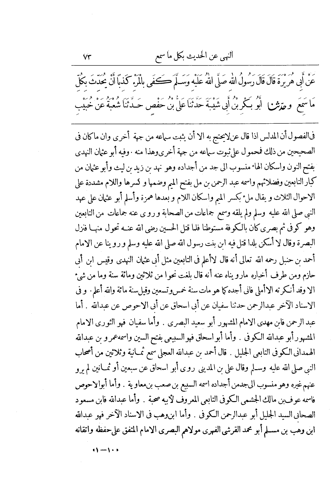 فِي الْفُصُولِ أَنَّ الْمُدَلِّسَ إِذَا قَالَ عَنْ لَا يُحْتَجُّ به إلا أن يثبت سماعه مِنْ جِهَةٍ أُخْرَى وَأَنَّ مَا كَانَ فِي الصَّحِيحَيْنِ مِنْ ذَلِكَ فَمَحْمُولٌ عَلَى ثُبُوتِ سَمَاعِهِ مِنْ جِهَةٍ أُخْرَى وَهَذَا مِنْهُ وَفِيهِ أَبُو عُثْمَانَ النَّهْدِيُّ بِفَتْحِ النُّونِ وَإِسْكَانِ الْهَاءِ مَنْسُوبٌ إِلَى جَدٍّ مِنْ أَجْدَادِهِ وَهُوَ نَهْدُ بْنُ زَيْدِ بْنِ لَيْثٍ وَأَبُو عُثْمَانَ مِنْ كِبَارِ التَّابِعِينَ وَفُضَلَائِهِمْ وَاسْمُهُ عَبْدُ الرَّحْمَنِ بْنُ مَلٍّ بِفَتْحِ الْمِيمِ وَضَمِّهَا وَكَسْرِهَا وَاللَّامُ مُشَدَّدَةٌ عَلَى الْأَحْوَالِ الثَّلَاثِ وَيُقَالُ مِلْءٍ بِكَسْرِ الْمِيمِ وَإِسْكَانِ اللَّامِ وَبَعْدَهَا هَمْزَةٌ وَأَسْلَمَ أَبُو عُثْمَانَ عَلَى عَهْدِ النَّبِيِّ صَلَّى اللَّهُ عَلَيْهِ وَسَلَّمَ وَلَمْ يَلْقَهُ وَسَمِعَ جَمَاعَاتٍ مِنَ الصَّحَابَةِ وَرَوَى عَنْهُ جَمَاعَاتٌ مِنَ التَّابِعِينَ وَهُوَ كُوفِيٌّ ثُمَّ بَصْرِيٌّ كَانَ بِالْكُوفَةِ مُسْتَوْطِنًا فَلَمَّا قُتِلَ الْحُسَيْنُ رَضِيَ اللَّهُ عَنْهُ تَحَوَّلَ مِنْهَا فَنَزَلَ الْبَصْرَةَ وَقَالَ لا أسكن بلدا قتل فيه بن بِنْتِ رَسُولِ اللَّهِ صَلَّى اللَّهُ عَلَيْهِ وَسَلَّمَ وَرُوِّينَا عَنِ الْإِمَامِ أَحْمَدَ بْنِ حَنْبَلٍ رَحِمَهُ الله تعالى أنه قال لاأعلم فِي التَّابِعِينَ مِثْلَ أَبِي عُثْمَانَ النَّهْدِيِّ وَقَيْسِ بْنِ أَبِي حَازِمٍ وَمِنْ طُرَفِ أَخْبَارِهِ مَا رُوِّينَاهُ عَنْهُ أَنَّهُ قَالَ بَلَغْتُ نَحْوًا مِنْ ثَلَاثِينَ وَمِائَةِ سَنَةٍ وَمَا مِنْ شَيْءٍ إِلَّا وَقَدْ أَنْكَرْتُهُ إِلَّا أَمَلِي فَإِنِّي أَجِدهُ كَمَا هُوَ مَاتَ سَنَةَ خَمْسٍ وَتِسْعِينَ وَقِيلَ سَنَةَ مِائَةٍ وَاللَّهُ أَعْلَمُ وَفِي الْإِسْنَادِ الْآخَرِ عَبْدُ الرَّحْمَنِ حَدَّثَنَا سُفْيَانُ عَنْ أَبِي إِسْحَاقَ عَنْ أَبِي الْأَحْوَصِ عَنْ عَبْدِ اللَّهِ أَمَّا عَبْدُ الرَّحْمَنِ فَابْنُ مَهْدِيٍّ الْإِمَامُ الْمَشْهُورُ أَبُو سَعِيدٍ الْبَصْرِيُّ وَأَمَّا سُفْيَانُ فَهُوَ الثَّوْرِيُّ الْإِمَامُ الْمَشْهُورُ أَبُو عَبْدِ اللَّهِ الْكُوفِيُّ وَأَمَّا أَبُو إِسْحَاقَ فَهُوَ السَّبِيعِيُّ بِفَتْحِ السِّينِ وَاسْمُهُ عَمْرُو بْنُ عَبْدِ اللَّهِ الْهَمْدَانِيُّ الْكُوفِيُّ التَّابِعِيُّ الْجَلِيلُ قَالَ أَحْمَدُ بْنُ عَبْدِ اللَّهِ الْعِجْلِيُّ سَمِعَ ثَمَانِيَةً وَثَلَاثِينَ مِنْ أَصْحَابِ النَّبِيِّ صَلَّى اللَّهُ عَلَيْهِ وَسَلَّمَ وَقَالَ عَلِيُّ بْنُ الْمَدِينِيِّ رَوَى أَبُو إِسْحَاقَ عَنْ سَبْعِينَ أَوْ ثَمَانِينَ لَمْ يَرْوِ عَنْهُمْ غَيْرُهُ وَهُوَ مَنْسُوبٌ إِلَى جَدٍّ مِنْ أَجْدَادِهِ اسْمُهُ السَّبِيعُ بْنُ صَعْبِ بْنِ مُعَاوِيَةَ وَأَمَّا أَبُو الْأَحْوَصِ فَاسْمُهُ عَوْفُ بْنُ مَالِكٍ الْجُشَمِيُّ الْكُوفِيُّ التَّابِعِيُّ الْمَعْرُوفُ لِأَبِيهِ صُحْبَةٌ وَأَمَّا عَبْدُ اللَّهِ فَابْنُ مَسْعُودٍ الصَّحَابِيُّ السَّيِّدُ الْجَلِيلُ أبو عبد الرحمن الكوفى وأما بن وَهْبٍ فِي الْإِسْنَادِ الْآخَرِ فَهُوَ عَبْدُ اللَّهِ بْنُ وَهْبِ بْنِ مُسْلِمٍ أَبُو مُحَمَّدٍ الْقُرَشِيُّ الْفِهْرِيُّ مَوْلَاهُمُ الْبَصْرِيُّ الْإِمَامُ الْمُتَّفَقُ عَلَى حِفْظِهِ واتقانه