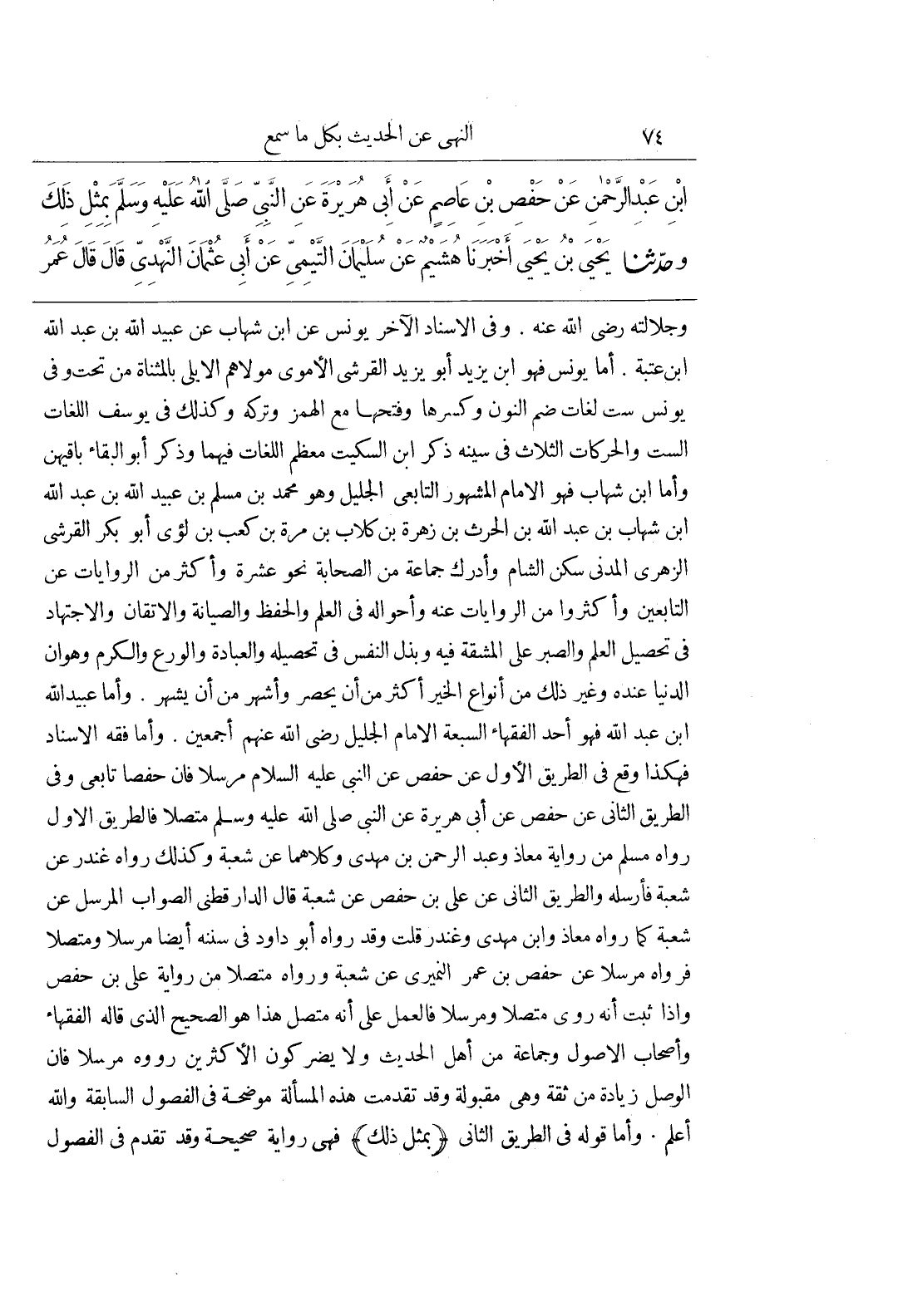 وَجَلَالَتِهِ رَضِيَ اللَّهُ عَنْهُ وَفِي الْإِسْنَادِ الْآخَرِ يونس عن بن شِهَابٍ عَنْ عُبَيْدِ اللَّهِ بْنِ عَبْدِ اللَّهِ بْنِ عتبة أما يونس فهو بن يزيد أبو يزيد القرشى الأموى مولاهم الايلى بِالْمُثَنَّاةِ مِنْ تَحْتُ وَفِي يُونُسَ سِتُّ لُغَاتٍ ضم النون وكسرها وفتحها مع الهمز وتركه وَكَذَلِكَ فِي يُوسُفَ اللُّغَاتُ السِّتُّ وَالْحَرَكَاتُ الثَّلَاثُ فى سينه ذكر بن السِّكِّيتِ مُعْظَمَ اللُّغَاتِ فِيهِمَا وَذَكَرَ أَبُو الْبَقَاءِ باقيهن وأما بن شِهَابٍ فَهُوَ الْإِمَامُ الْمَشْهُورُ التَّابِعِيُّ الْجَلِيلُ وَهُوَ مُحَمَّدُ بْنُ مُسْلِمِ بْنِ عُبَيْدِ اللَّهِ بْنِ عَبْدِ اللَّهِ بْنِ شِهَابِ بْنِ عَبْدِ اللَّهِ بْنِ الْحَرْثِ بْنِ زُهْرَةَ بْنِ كِلَابِ بْنِ مُرَّةَ بْنِ كَعْبِ بْنِ لُؤَيٍّ أَبُو بَكْرٍ الْقُرَشِيُّ الزُّهْرِيُّ الْمَدَنِيُّ سَكَنَ الشَّامَ وَأَدْرَكَ جَمَاعَةً مِنَ الصَّحَابَةِ نَحْوَ عَشَرَةٍ وَأَكْثَرَ مِنَ الرِّوَايَاتِ عَنِ التَّابِعِينَ وَأَكْثَرُوا مِنَ الرِّوَايَاتِ عَنْهُ وَأَحْوَالُهُ فِي الْعِلْمِ وَالْحِفْظِ وَالصِّيَانَةِ وَالْإِتْقَانِ وَالِاجْتِهَادِ فِي تَحْصِيلِ الْعِلْمِ وَالصَّبْرِ عَلَى الْمَشَقَّةِ فِيهِ وَبَذْلِ النَّفْسِ فِي تَحْصِيلِهِ وَالْعِبَادَةِ وَالْوَرَعِ وَالْكَرَمِ وَهَوَانِ الدُّنْيَا عِنْدَهُ وَغَيْرِ ذَلِكَ مِنْ أَنْوَاعِ الْخَيْرِ أَكْثَرُ مِنْ أَنْ يُحْصَرَ وَأَشْهَرُ مِنْ أَنْ يُشْهَرَ وَأَمَّا عُبَيْدُ اللَّهِ بْنُ عَبْدِ اللَّهِ فَهُوَ أَحَدُ الْفُقَهَاءِ السَّبْعَةِ الْإِمَامُ الْجَلِيلُ رَضِيَ اللَّهُ عَنْهُمْ أَجْمَعِينَ وَأَمَّا فِقْهُ الْإِسْنَادِ فَهَكَذَا وَقَعَ فِي الطَّرِيقِ الْأَوَّلِ عَنْ حَفْصٍ عَنِ النَّبِيِّ عَلَيْهِ السَّلَامُ مُرْسَلًا فَإِنَّ حَفْصًا تَابِعِيٌّ وَفِي الطَّرِيقِ الثَّانِي عَنْ حَفْصٍ عَنْ أَبِي هُرَيْرَةَ عَنِ النَّبِيِّ صَلَّى اللَّهُ عَلَيْهِ وَسَلَّمَ مُتَّصِلًا فَالطَّرِيقُ الْأَوَّلُ رَوَاهُ مُسْلِمٌ مِنْ رِوَايَةِ مُعَاذٍ وَعَبْدِ الرَّحْمَنِ بْنِ مَهْدِيٍّ وَكِلَاهُمَا عَنْ شُعْبَةَ وَكَذَلِكَ رَوَاهُ غُنْدَرٌ عَنْ شُعْبَةَ فَأَرْسَلَهُ وَالطَّرِيقُ الثَّانِي عَنْ عَلِيِّ بْنِ حَفْصٍ عَنْ شُعْبَةَ قَالَ الدَّارَقُطْنِيُّ الصَّوَابُ الْمُرْسَلُ عَنْ شُعْبَةَ كما رواه معاذ وبن مَهْدِيٍّ وَغُنْدَرٌ قُلْتُ وَقَدْ رَوَاهُ أَبُو دَاوُدَ فِي سُنَنِهِ أَيْضًا مُرْسَلًا وَمُتَّصِلًا فَرَوَاهُ مُرْسَلًا عَنْ حَفْصِ بْنِ عُمَرَ النُّمَيْرِيِّ عَنْ شُعْبَةَ وَرَوَاهُ مُتَّصِلًا مِنْ رِوَايَةِ عَلِيِّ بْنِ حَفْصٍ وَإِذَا ثَبَتَ أَنَّهُ رُوِيَ مُتَّصِلًا وَمُرْسَلًا فَالْعَمَلُ عَلَى أَنَّهُ مُتَّصِلٌ هَذَا هُوَ الصَّحِيحُ الَّذِي قَالَهُ الْفُقَهَاءُ وَأَصْحَابُ الْأُصُولِ وَجَمَاعَةٌ مِنْ أَهْلِ الْحَدِيثِ وَلَا يَضُرُّ كَوْنُ الْأَكْثَرِينَ رَوَوْهُ مُرْسَلًا فَإِنَّ الْوَصْلَ زِيَادَةٌ مِنْ ثِقَةٍ وَهِيَ مَقْبُولَةٌ وَقَدْ تَقَدَّمَتْ هَذِهِ الْمَسْأَلَةُ مُوَضَّحَةً فِي الْفُصُولِ السَّابِقَةِ وَاللَّهُ أَعْلَمُ وَأَمَّا قَوْلُهُ فِي الطَّرِيقِ الثَّانِي (بِمِثْلِ ذَلِكَ) فَهِيَ رِوَايَةٌ صَحِيحَةٌ وَقَدْ تَقَدَّمَ فِي الْفُصُولِ