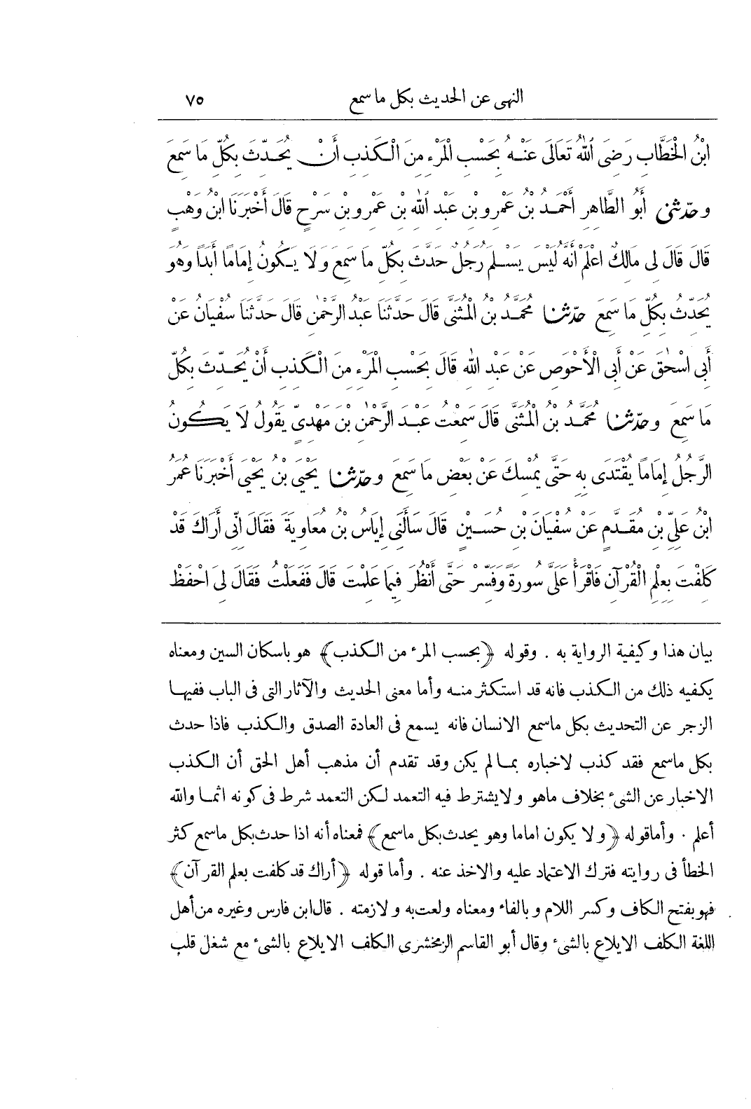بَيَانُ هَذَا وَكَيْفِيَّةُ الرِّوَايَةِ بِهِ وَقَوْلُهُ (بِحَسْبِ الْمَرْءِ مِنَ الْكَذِبِ) هُوَ بِإِسْكَانِ السِّينِ وَمَعْنَاهُ يَكْفِيهِ ذَلِكَ مِنَ الْكَذِبِ فَإِنَّهُ قَدِ اسْتَكْثَرَ مِنْهُ وَأَمَّا مَعْنَى الْحَدِيثِ وَالْآثَارِ الَّتِي فِي الْبَابِ فَفِيهَا الزَّجْرُ عَنِ التَّحْدِيثِ بِكُلِّ مَا سَمِعَ الْإِنْسَانُ فَإِنَّهُ يَسْمَعُ فِي الْعَادَةِ الصِّدْقَ وَالْكَذِبَ فَإِذَا حَدَّثَ بِكُلِّ مَا سَمِعَ فَقَدْ كَذَبَ لِإِخْبَارِهِ بِمَا لَمْ يَكُنْ وَقَدْ تَقَدَّمَ أَنَّ مَذْهَبَ أَهْلِ الْحَقِّ أَنَّ الْكَذِبَ الْإِخْبَارُ عن الشيء بخلاف ماهو وَلَا يُشْتَرَطُ فِيهِ التَّعَمُّدُ لَكِنَّ التَّعَمُّدُ شَرْطٌ فِي كَوْنِهِ إِثْمًا وَاللَّهُ أَعْلَمُ وَأَمَّا قَوْلُهُ (وَلَا يَكُونُ إِمَامًا وَهُوَ يُحَدِّثُ بِكُلِّ مَا سمع) فمعناه أنه حَدَّثَ بِكُلِّ مَا سَمِعَ كَثُرَ الْخَطَأُ فِي رِوَايَتِهِ فَتُرِكَ الِاعْتِمَادُ عَلَيْهِ وَالْأَخْذُ عَنْهُ وَأَمَّا قَوْلُهُ (أَرَاكَ قَدْ كَلِفْتَ بِعِلْمِ الْقُرْآنِ) فَهُوَ بفتح الكاف وكسر اللام وبالفاء ومعناه ولعت به ولازمته قال بن فَارِسٍ وَغَيْرُهُ مِنْ أَهْلِ اللُّغَةِ الْكَلَفُ الْإِيلَاعُ بِالشَّيْءِ وَقَالَ أَبُو الْقَاسِمِ الزَّمَخْشَرِيُّ الْكَلَفُ الْإِيلَاعُ بِالشَّيْءِ مَعَ شَغْلِ قَلْبٍ