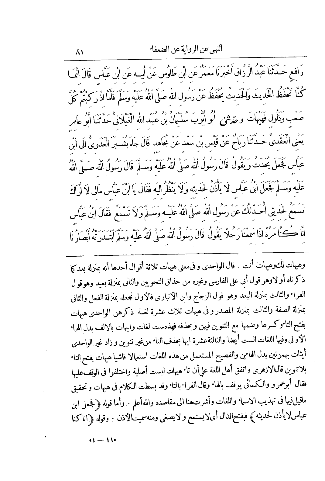 وَهَيْهَاتَ لَكَ وَهَيْهَاتَ أَنْتَ قَالَ الْوَاحِدِيُّ وَفِي مَعْنَى هَيْهَاتَ ثَلَاثَةُ أَقْوَالٍ أَحَدُهَا أَنَّهُ بِمَنْزِلَةِ بَعُدَ كَمَا ذَكَرْنَاهُ أَوَّلًا وَهُوَ قَوْلُ أَبِي عَلِيٍّ الْفَارِسِيِّ وَغَيْرِهِ مِنْ حُذَّاقِ النَّحْوِيِّينَ وَالثَّانِي بِمَنْزِلَةِ بَعِيدٍ وَهُوَ قَوْلُ الْفَرَّاءِ وَالثَّالِثُ بِمَنْزِلَةِ البعد وهو قول الزجاج وبن الْأَنْبَارِيِّ فَالْأَوَّلُ نَجْعَلُهُ بِمَنْزِلَةِ الْفِعْلِ وَالثَّانِي بِمَنْزِلَةِ الصِّفَةِ وَالثَّالِثُ بِمَنْزِلَةِ الْمَصْدَرِ وَفِي هَيْهَاتَ ثَلَاثَ عَشْرَةَ لُغَةً ذَكَرَهُنَّ الْوَاحِدِيُّ هَيْهَاتَ بِفَتْحِ التَّاءِ وَكَسْرِهَا وَضَمِّهَا مَعَ التَّنْوِينِ فِيهِنَّ وَبِحَذْفِهِ فَهَذِهِ سِتُّ لُغَاتٍ وَأَيْهَاتَ بِالْأَلِفِ بَدَلَ الْهَاءِ الْأُولَى وَفِيهَا اللُّغَاتُ السِّتُّ أَيْضًا وَالثَّالِثَةَ عَشْرَةَ أَيْهَا بِحَذْفِ التَّاءِ مِنْ غَيْرِ تَنْوِينٍ وَزَادَ غَيْرُ الواحدى أيئات بِهَمْزَتَيْنِ بَدَلَ الْهَاءَيْنِ وَالْفَصِيحُ الْمُسْتَعْمَلُ مِنْ هَذِهِ اللُّغَاتِ اسْتِعْمَالًا فَاشِيًا هَيْهَاتَ بِفَتْحِ التَّاءِ بِلَا تَنْوِينٍ قَالَ الْأَزْهَرِيُّ وَاتَّفَقَ أَهْلُ اللُّغَةِ عَلَى أَنَّ تَاءَ هَيْهَاتَ لَيْسَتْ أَصْلِيَّةً وَاخْتَلَفُوا فِي الْوَقْفِ عَلَيْهَا فَقَالَ أَبُو عَمْرٍو وَالْكِسَائِيُّ يُوقَفُ بِالْهَاءِ وَقَالَ الْفَرَّاءُ بِالتَّاءِ وَقَدْ بَسَطْتُ الْكَلَامَ فِي هَيْهَاتَ وَتَحْقِيقُ مَا قِيلَ فِيهَا فِي تَهْذِيبِ الْأَسْمَاءِ وَاللُّغَاتِ وَأَشَرْتُ هُنَا إِلَى مَقَاصِدِهِ والله اعلم وأما قوله (فجعل بن عَبَّاسٍ لَا يَأْذَنُ لِحَدِيثِهِ) فَبِفَتْحِ الذَّالِ أَيْ لا يستمع ولا يضغى وَمِنْهُ سُمِّيَتِ الْأُذُنُ وَقَوْلُهُ (إِنَّا كُنَّا