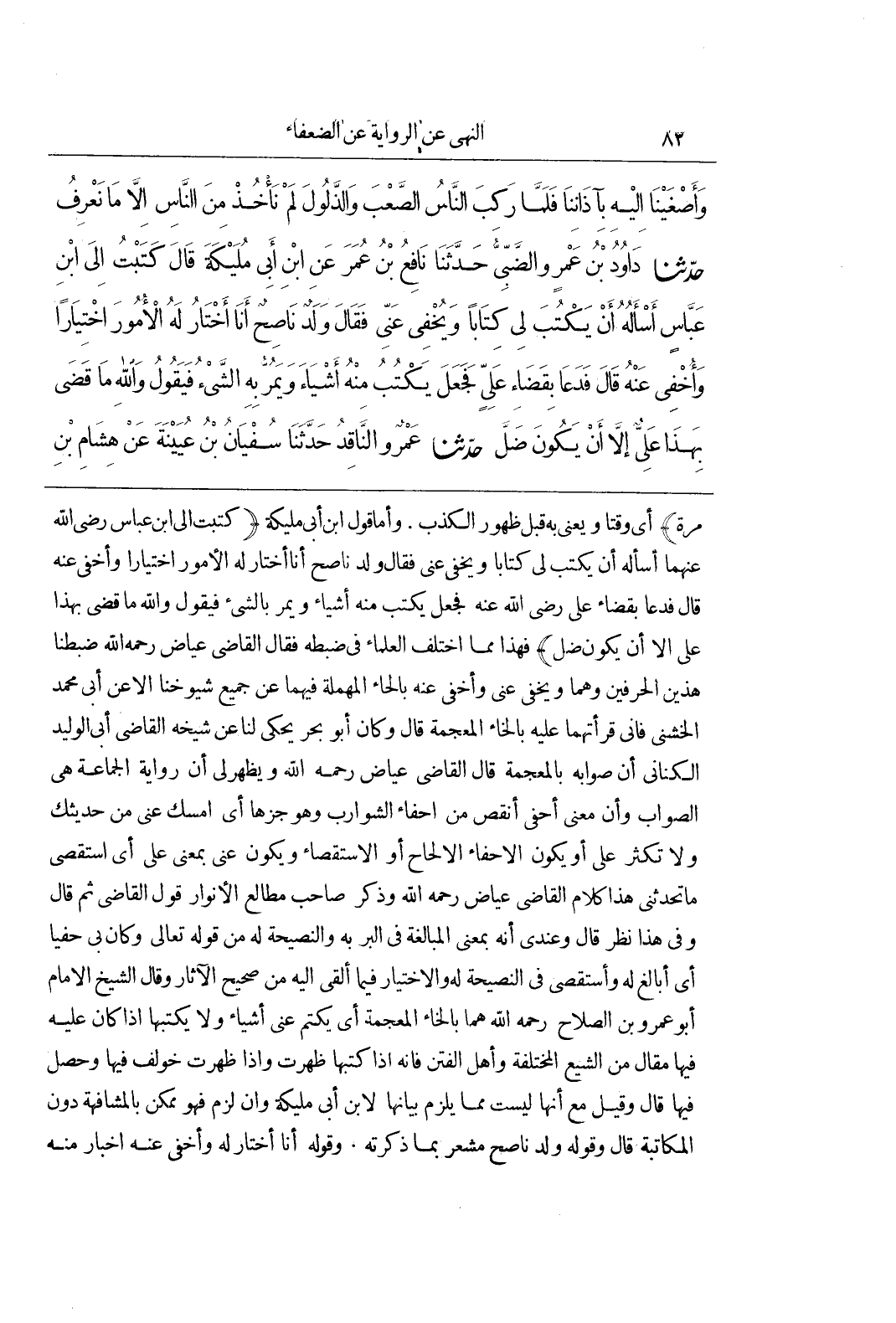 مَرَّةً) أَيْ وَقْتًا وَيَعْنِي بِهِ قَبْلَ ظُهُورِ الكذب وأما قول بن أبى مليكة (كتبت إلى بن عَبَّاسٍ رَضِيَ اللَّهُ عَنْهُمَا أَسْأَلُهُ أَنْ يَكْتُبَ لِي كِتَابًا وَيُخْفِي عَنِّي فَقَالَ وَلَدٌ نَاصِحٌ أَنَا أَخْتَارُ لَهُ الْأُمُورَ اخْتِيَارًا وَأُخْفِي عَنْهُ قَالَ فَدَعَا بِقَضَاءِ عَلِيٍّ رَضِيَ اللَّهُ عَنْهُ فَجَعَلَ يَكْتُبُ مِنْهُ أَشْيَاءَ وَيَمُرُّ بِالشَّيْءِ فَيَقُولُ وَاللَّهِ مَا قَضَى بِهَذَا عَلِيٌّ إِلَّا أَنْ يَكُونَ ضَلَّ) فَهَذَا مِمَّا اخْتَلَفَ الْعُلَمَاءُ فِي ضَبْطِهِ فَقَالَ الْقَاضِي عِيَاضٌ رَحِمَهُ اللَّهُ ضَبَطْنَا هَذَيْنِ الْحَرْفَيْنِ وَهُمَا وَيُخْفِي عَنِّي وَأُخْفِي عَنْهُ بِالْحَاءِ الْمُهْمَلَةِ فِيهِمَا عَنْ جَمِيعِ شُيُوخنَا إِلَّا عَنْ أَبِي مُحَمَّدٍ الْخُشَنِيِّ فَإِنِّي قَرَأْتُهُمَا عَلَيْهِ بِالْخَاءِ الْمُعْجَمَةِ قَالَ وَكَانَ أَبُو بَحْرٍ يَحْكِي لَنَا عَنْ شَيْخِهِ الْقَاضِي أَبِي الْوَلِيدِ الْكِنَانِيِّ أَنَّ صَوَابَهُ بِالْمُعْجَمَةِ قَالَ الْقَاضِي عِيَاضٌ رَحِمَهُ اللَّهُ وَيَظْهَرُ لِي أَنَّ رِوَايَةَ الْجَمَاعَةِ هِيَ الصَّوَابُ وَأَنَّ مَعْنَى أُحْفِي أَنْقُصُ مِنْ إِحْفَاءِ الشَّوَارِبِ وَهُوَ جَزُّهَا أَيْ أَمْسِكْ عَنِّي مِنْ حَدِيثِكَ وَلَا تُكْثِرْ عَلَيَّ أَوْ يَكُونُ الْإِحْفَاءُ الْإِلْحَاحَ أَوْ الِاسْتِقْصَاءَ وَيَكُونُ عَنِّي بِمَعْنَى عَلَيَّ اي استقصى مَا تُحَدِّثُنِي هَذَا كَلَامُ الْقَاضِي عِيَاضٌ رَحِمَهُ اللَّهُ وَذَكَرَ صَاحِبُ مَطَالِعِ الْأَنْوَارِ قَوْلَ الْقَاضِي ثُمَّ قَالَ وَفِي هَذَا نَظَرٌ قَالَ وَعِنْدِي أَنَّهُ بِمَعْنَى الْمُبَالَغَةِ فِي الْبِرِّ بِهِ وَالنَّصِيحَةِ له من قوله تعالى وكان بِي حَفِيًّا أَيْ أُبَالِغُ لَهُ وَأَسْتَقْصِي فِي النَّصِيحَةِ لَهُ وَالِاخْتِيَارِ فِيمَا أُلْقِي إِلَيْهِ مِنْ صَحِيحِ الْآثَارِ وَقَالَ الشَّيْخُ الْإِمَامُ أَبُو عَمْرِو بْنُ الصَّلَاحِ رَحِمَهُ اللَّهُ هُمَا بِالْخَاءِ الْمُعْجَمَةِ أَيْ يَكْتُمُ عَنِّي أَشْيَاءَ وَلَا يَكْتُبُهَا إِذَا كَانَ عَلَيْهِ فِيهَا مَقَالٌ مِنَ الشِّيَعِ الْمُخْتَلِفَةِ وَأَهْلِ الْفِتَنِ فَإِنَّهُ إِذَا كَتَبَهَا ظَهَرَتْ وَإِذَا ظَهَرَتْ خُولِفَ فِيهَا وَحَصَلَ فِيهَا قَالٌ وَقِيلٌ مَعَ أَنَّهَا لَيْسَتْ مِمَّا يَلْزَمُ بَيَانُهَا لِابْنِ أَبِي مُلَيْكَةَ وَإِنْ لَزِمَ فَهُوَ مُمْكِنٌ بِالْمُشَافَهَةِ دُونَ الْمُكَاتَبَةِ قَالَ وَقَوْلُهُ وَلَدٌ نَاصِحٌ مُشْعِرٌ بِمَا ذَكَرْتُهُ وَقَوْلُهُ أَنَا أَخْتَارُ لَهُ وَأُخْفِي عَنْهُ إِخْبَارٌ مِنْهُ