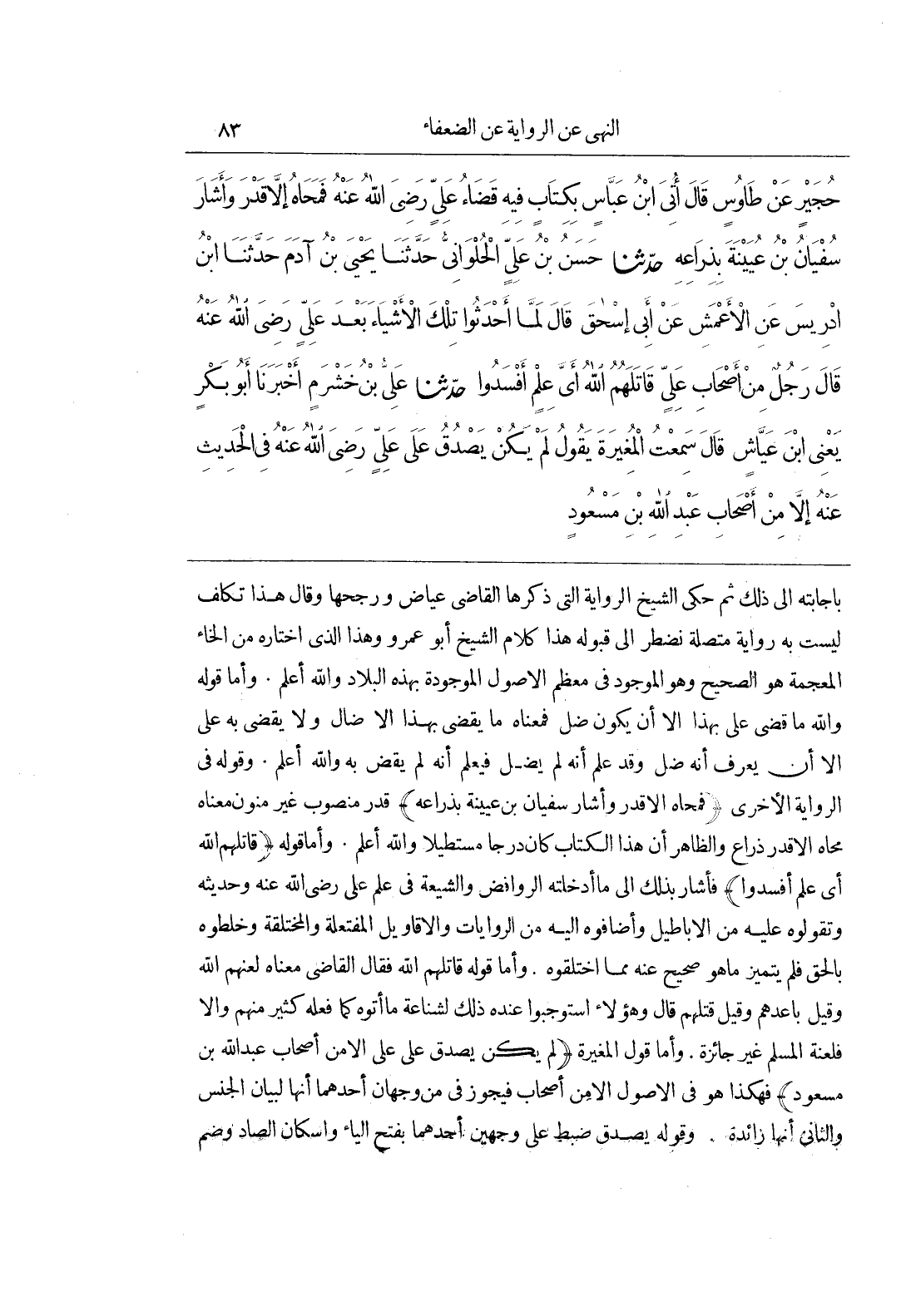 بِإِجَابَتِهِ إِلَى ذَلِكَ ثُمَّ حَكَى الشَّيْخُ الرِّوَايَةَ الَّتِي ذَكَرَهَا الْقَاضِي عِيَاضٌ وَرَجَّحَهَا وَقَالَ هَذَا تَكَلُّفٌ لَيْسَتْ بِهِ رِوَايَةٌ مُتَّصِلَةٌ نُضْطَرُّ إِلَى قبوله هذا كلام الشيخ أبو عَمْرٍو وَهَذَا الَّذِي أَخْتَارُهُ مِنَ الْخَاءِ الْمُعْجَمَةِ هُوَ الصَّحِيحُ وَهُوَ الْمَوْجُودُ فِي مُعْظَمِ الْأُصُولِ الْمَوْجُودَةِ بِهَذِهِ الْبِلَادِ وَاللَّهُ أَعْلَمُ وَأَمَّا قَوْلُهُ وَاللَّهِ مَا قَضَى عَلِيٌّ بِهَذَا إِلَّا أَنْ يَكُونَ ضَلَّ فَمَعْنَاهُ مَا يَقْضِي بِهَذَا إِلَّا ضال ولا يقضي به على أن لا يُعْرَفَ أَنَّهُ ضَلَّ وَقَدْ عُلِمَ أَنَّهُ لَمْ يضل فيعمل أَنَّهُ لَمْ يَقْضِ بِهِ وَاللَّهُ أَعْلَمُ وَقَوْلُهُ في الرواية الأخرى (فمحاه الاقدر وأشار سفيان بن عيينة بذراعه) قدر منصور غير منون معناه محاه الاقدر ذِرَاعٍ وَالظَّاهِرُ أَنَّ هَذَا الْكِتَابَ كَانَ دَرْجًا مُسْتَطِيلًا وَاللَّهُ أَعْلَمُ وَأَمَّا قَوْلُهُ (قَاتَلَهُمُ اللَّهُ أَيَّ عِلْمٍ أَفْسَدُوا) فَأَشَارَ بِذَلِكَ إِلَى مَا أَدْخَلَتْهُ الرَّوَافِضُ وَالشِّيعَةُ فِي عِلْمِ عَلِيٍّ رَضِيَ اللَّهُ عَنْهُ وَحَدِيثِهِ وَتَقَوَّلُوهُ عَلَيْهِ مِنَ الْأَبَاطِيلَ وأضافوه إليه من الروايات والاقاويل المفتعلة والمختلقة وَخَلَطُوهُ بِالْحَقِّ فَلَمْ يَتَمَيَّزْ مَا هُوَ صَحِيحٌ عَنْهُ مِمَّا اخْتَلَقُوهُ وَأَمَّا قَوْلُهُ قَاتَلَهُمُ اللَّهُ فَقَالَ الْقَاضِي مَعْنَاهُ لَعَنَهُمُ اللَّهُ وَقِيلَ بَاعَدَهُمْ وَقِيلَ قَتَلَهُمْ قَالَ وَهَؤُلَاءِ اسْتَوْجَبُوا عِنْدَهُ ذَلِكَ لِشَنَاعَةِ مَا أَتَوْهُ كَمَا فَعَلَهُ كَثِيرٌ مِنْهُمْ وَإِلَّا فَلَعْنَةُ الْمُسْلِمِ غَيْرُ جَائِزَةٍ وَأَمَّا قَوْلُ المغيرة (لم يكن بصدق عَلَى عَلِيٍّ إِلَّا مِنْ أَصْحَابِ عَبْدِ اللَّهِ بْنِ مَسْعُودٍ) فَهَكَذَا هُوَ فِي الْأُصُولِ إِلَّا مِنْ أَصْحَابِ فَيَجُوزُ فِي مِنْ وَجْهَانِ أَحَدُهُمَا أَنَّهَا لِبَيَانِ الْجِنْسِ وَالثَّانِي أَنَّهَا زَائِدَةٌ وَقَوْلُهُ يَصْدُقُ ضُبِطَ عَلَى وَجْهَيْنِ أَحَدُهُمَا بِفَتْحِ الْيَاءِ وَإِسْكَانِ الصَّادِ وَضَمِّ