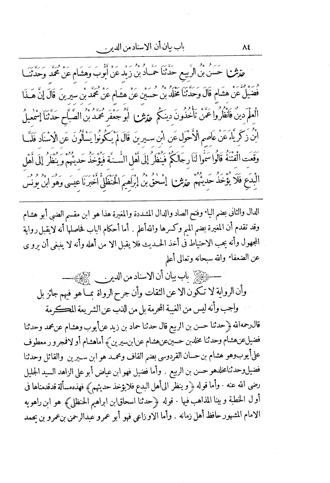 وَأَنَّ جَرْحَ الرُّوَاةِ بِمَا هُوَ فِيهِمْ جَائِزٌ بَلْ وَاجِبٌ وَأَنَّهُ لَيْسَ مِنَ الْغِيبَةِ الْمُحَرَّمَةِ بَلْ مِنَ الذَّبِّ عَنِ الشَّرِيعَةِ الْمُكَرَّمَةِ قَالَ رَحِمَهُ اللَّهُ (حَدَّثَنَا حَسَنُ بْنُ الرَّبِيعِ قَالَ حَدَّثَنَا حَمَّادُ بْنُ زَيْدٍ عَنْ أَيُّوبَ وَهِشَامٍ عَنْ مُحَمَّدٍ وَحَدَّثَنَا فُضَيْلٌ عَنْ هِشَامٍ وَحَدَّثَنَا مَخْلَدُ بْنُ حُسَيْنٍ عَنْ هِشَامٍ عَنِ بن سِيرِينَ) أَمَّا هِشَامٌ أَوَّلًا فَمَجْرُورٌ مَعْطُوفٌ عَلَى أَيُّوبَ وَهُوَ هِشَامُ بْنُ حَسَّانٍ الْقُرْدُوسِيُّ بِضَمِّ القاف ومحمد هو بن سِيرِينَ وَالْقَائِلُ وَحَدَّثَنَا فُضَيْلٌ وَحَدَّثَنَا مَخْلَدٌ هُوَ حسن بن الربيع وأما فضيل فهو بن عِيَاضٍ أَبُو عَلِيٍّ الزَّاهِدُ السَّيِّدُ الْجَلِيلُ رَضِيَ اللَّهُ عَنْهُ وَأَمَّا قَوْلُهُ (وَيُنْظَرُ إِلَى أَهْلِ البدع فلا يؤخذ حديثهم) فهذه مسألة قد قَدَّمْنَاهَا فِي أَوَّلِ الْخُطْبَةِ وَبَيَّنَّا الْمَذَاهِبَ فِيهَا قوله (حدثنا إسحاق بن ابراهيم الحنظلى) هوابن رَاهَوَيْهِ الْإِمَامُ الْمَشْهُورُ حَافِظُ أَهْلِ زَمَانِهِ وَأَمَّا الْأَوْزَاعِيُّ فَهُوَ أَبُو عَمْرٍو عَبْدُ الرَّحْمَنِ بْنُ عَمْرِو بْنِ يُحْمِدَ