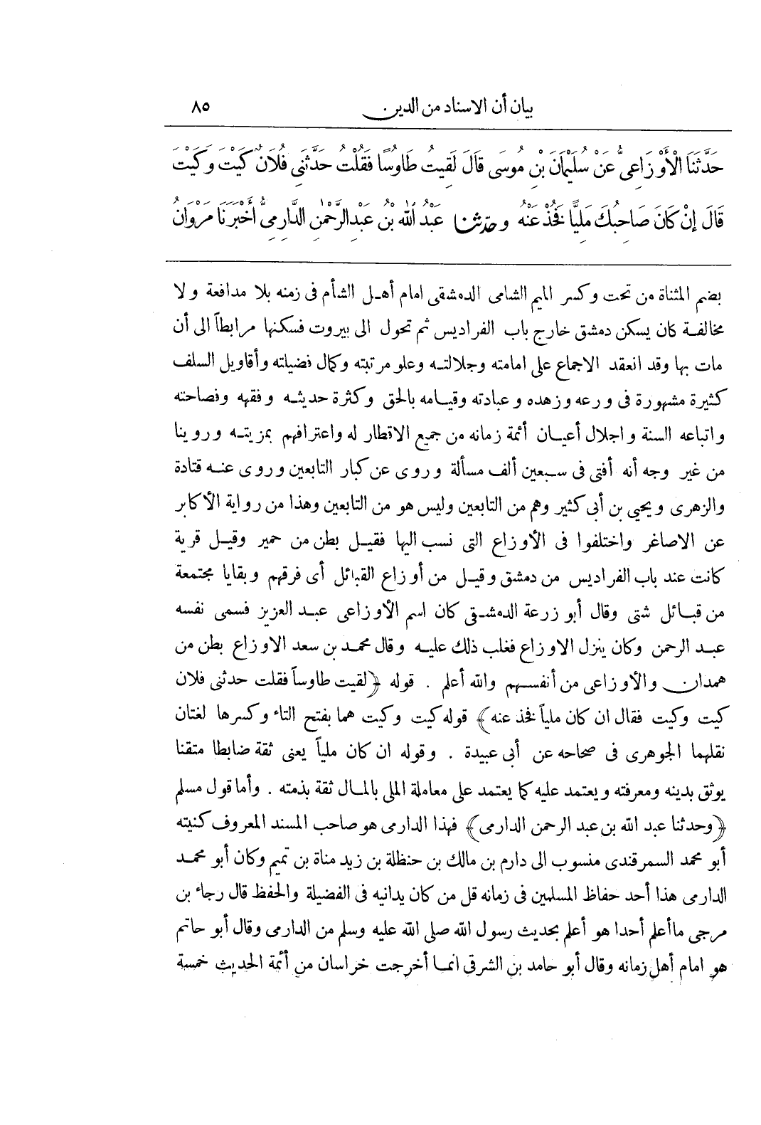بِضَمِّ الْمُثَنَّاةِ مِنْ تَحْتُ وَكَسْرِ الْمِيمِ الشَّامِيُّ الدِّمَشْقِيُّ إِمَامُ أَهْلِ الشَّامِ فِي زَمَنِهِ بِلَا مُدَافَعَةٍ وَلَا مُخَالَفَةٍ كَانَ يَسْكُنُ دِمَشْقَ خَارِجَ بَابِ الْفَرَادِيسِ ثُمَّ تَحَوَّلَ إِلَى بَيْرُوتَ فَسَكَنَهَا مُرَابِطًا إِلَى أَنْ مَاتَ بِهَا وَقَدِ انْعَقَدَ الْإِجْمَاعُ عَلَى إِمَامَتِهِ وَجَلَالَتِهِ وَعُلُوِّ مَرْتَبَتِهِ وَكَمَالِ فَضِيلَتِهِ وَأَقَاوِيلُ السَّلَفِ كَثِيرَةٌ مَشْهُورَةٌ فِي وَرَعِهِ وزهده وعيادته وَقِيَامِهِ بِالْحَقِّ وَكَثْرَةِ حَدِيثِهِ وَفِقْهِهِ وَفَصَاحَتِهِ وَاتِّبَاعِهِ السُّنَّةَ وَإِجْلَالِ أَعْيَانِ أَئِمَّةِ زَمَانِهِ مِنْ جَمِيعِ الْأَقْطَارِ لَهُ وَاعْتِرَافِهِمْ بِمَزِيَّتِهِ وَرُوِّينَا مِنْ غَيْرِ وَجْهٍ أَنَّهُ أَفْتَى فِي سَبْعِينَ أَلْفَ مَسْأَلَةٍ وَرَوَى عَنْ كِبَارِ التَّابِعِينَ وَرَوَى عَنْهُ قَتَادَةُ وَالزُّهْرِيُّ وَيَحْيَى بْنُ أَبِي كَثِيرٍ وَهُمْ مِنَ التَّابِعِينَ وَلَيْسَ هُوَ مِنَ التَّابِعِينَ وَهَذَا مِنْ رِوَايَةِ الْأَكَابِرِ عَنِ الْأَصَاغِرِ وَاخْتَلَفُوا فِي الْأَوْزَاعِ الَّتِي نُسِبَ إِلَيْهَا فَقِيلَ بَطْنٌ مِنْ حِمْيَرَ وَقِيلَ قَرْيَةٌ كَانَتْ عِنْدَ بَابِ الْفَرَادِيسِ مِنْ دِمَشْقَ وَقِيلَ مِنْ أَوْزَاعِ الْقَبَائِلِ أَيْ فِرَقِهِمْ وَبَقَايَا مُجْتَمَعَةٍ مِنْ قَبَائِلَ شَتَّى وَقَالَ أَبُو زُرْعَةَ الدِّمَشْقِيُّ كَانَ اسْمُ الْأَوْزَاعِيِّ عَبْدَ الْعَزِيزِ فَسَمَّى نَفْسَهُ عَبْدَ الرَّحْمَنِ وَكَانَ يَنْزِلُ الْأَوْزَاعَ فَغَلَبَ ذَلِكَ عَلَيْهِ وَقَالَ مُحَمَّدُ بْنُ سَعْدٍ الْأَوْزَاعُ بَطْنٌ مِنْ هَمْدَانَ وَالْأَوْزَاعِيُّ مِنْ أَنْفَسِهِمْ وَاللَّهُ أَعْلَمُ قَوْلُهُ (لَقِيتُ طَاوُسًا فَقُلْتُ حَدَّثَنِي فُلَانٌ كَيْتَ وَكَيْتَ فَقَالَ إِنْ كَانَ مَلِيًّا فَخُذْ عَنْهُ) قَوْلُهُ كَيْتَ وَكَيْتَ هُمَا بِفَتْحِ التَّاءِ وَكَسْرِهَا لُغَتَانِ نَقَلَهُمَا الْجَوْهَرِيُّ فِي صِحَاحِهِ عَنْ أَبِي عُبَيْدَةَ وَقَوْلُهُ إِنْ كَانَ مَلِيًّا يَعْنِي ثِقَةً ضَابِطًا مُتْقِنًا يُوثَقُ بِدِينِهِ وَمَعْرِفَتِهِ وَيُعْتَمَدُ عَلَيْهِ كَمَا يُعْتَمَدُ عَلَى مُعَامَلَةِ الْمَلِيِّ بِالْمَالِ ثِقَةً بِذِمَّتِهِ وَأَمَّا قَوْلُ مُسْلِمٍ (وَحَدَّثَنَا عَبْدُ اللَّهِ بْنُ عَبْدِ الرَّحْمَنِ الدَّارِمِيُّ) فَهَذَا الدَّارِمِيُّ هُوَ صَاحِبُ الْمُسْنَدِ الْمَعْرُوفِ كُنْيَتُهُ أَبُو مُحَمَّدٍ السَّمَرْقَنْدِيُّ مَنْسُوبٌ إِلَى دَارِمِ بْنِ مَالِكِ بْنِ حَنْظَلَةَ بْنِ زَيْدِ مَنَاةَ بْنِ تَمِيمٍ وَكَانَ أَبُو مُحَمَّدٍ الدَّارِمِيُّ هَذَا أَحَدَ حُفَّاظِ الْمُسْلِمِينَ فِي زَمَانِهِ قَلَّ مَنْ كَانَ يُدَانِيهِ فِي الْفَضِيلَةِ وَالْحِفْظِ قَالَ رَجَاءُ بْنُ مُرَجَّى مَا أَعْلَمُ أَحَدًا هُوَ أَعْلَمُ بِحَدِيثِ رَسُولِ اللَّهِ صَلَّى اللَّهُ عَلَيْهِ وَسَلَّمَ مِنَ الدَّارِمِيِّ وَقَالَ أَبُو حَاتِمٍ هُوَ إِمَامُ أَهْلِ زَمَانِهِ وَقَالَ أَبُو حَامِدِ بْنِ الشَّرْقِيِّ إِنَّمَا أَخْرَجَتْ خُرَاسَانُ مِنْ أَئِمَّةِ الْحَدِيثِ خَمْسَةَ