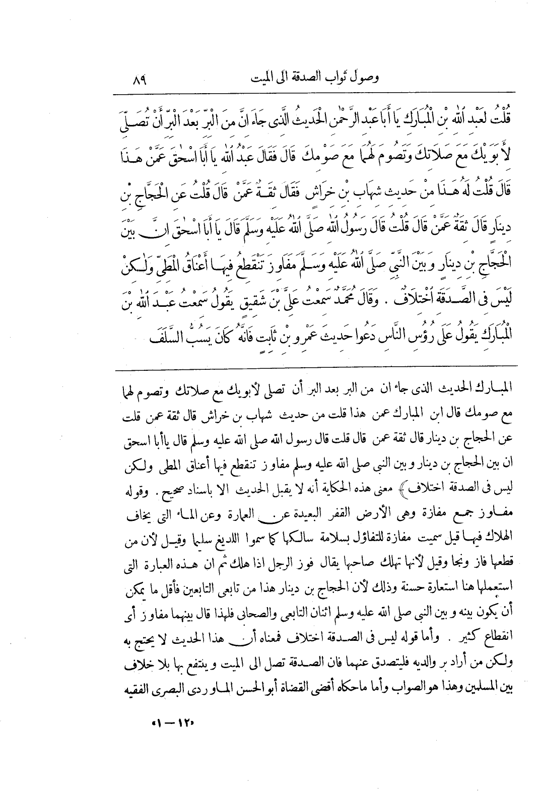 الْمُبَارَكِ الْحَدِيثُ الَّذِي جَاءَ إِنَّ مِنَ الْبِرِّ بَعْدَ الْبِرِّ أَنْ تُصَلِّيَ لِأَبَوَيْكَ مَعَ صَلَاتِكَ وتصوم لهما مع صومك قال بن الْمُبَارَكِ عَمَّنْ هَذَا قُلْتُ مِنْ حَدِيثِ شِهَابِ بْنِ خِرَاشٍ قَالَ ثِقَةٌ عَمَّنْ قُلْتُ عَنِ الْحَجَّاجِ بْنِ دِينَارٍ قَالَ ثِقَةٌ عَمَّنْ قَالَ قُلْتُ قَالَ رَسُولُ اللَّهِ صَلَّى اللَّهُ عَلَيْهِ وَسَلَّمَ قال يا أبا إسحاق إِنَّ بَيْنَ الْحَجَّاجِ بْنِ دِينَارٍ وَبَيْنَ النَّبِيِّ صَلَّى اللَّهُ عَلَيْهِ وَسَلَّمَ مَفَاوِزَ تَنْقَطِعُ فِيهَا أَعْنَاقُ الْمَطِيِّ وَلَكِنْ لَيْسَ فِي الصَّدَقَةِ اخْتِلَافٌ) مَعْنَى هَذِهِ الْحِكَايَةِ أَنَّهُ لَا يُقْبَلُ الْحَدِيثُ إِلَّا بِإِسْنَادٍ صَحِيحٍ وَقَوْلُهُ مَفَاوِزَ جَمْعُ مَفَازَةٍ وَهِيَ الْأَرْضُ الْقَفْرُ الْبَعِيدَةُ عَنِ الْعِمَارَةِ وَعَنِ الْمَاءِ الَّتِي يُخَافُ الْهَلَاكُ فِيهَا قِيلَ سُمِّيَتْ مَفَازَةً لِلتَّفَاؤُلِ بِسَلَامَةِ سَالِكِهَا كَمَا سَمَّوْا اللَّدِيغَ سَلِيمًا وَقِيلَ لِأَنَّ مَنْ قَطَعَهَا فَازَ وَنَجَا وَقِيلَ لِأَنَّهَا تُهْلِكُ صَاحِبَهَا يُقَالُ فَوَّزَ الرَّجُلُ إِذَا هَلَكَ ثُمَّ إِنَّ هَذِهِ الْعِبَارَةَ الَّتِي اسْتَعْمَلَهَا هُنَا اسْتِعَارَةٌ حَسَنَةٌ وَذَلِكَ لِأَنَّ الْحَجَّاجَ بْنَ دِينَارٍ هَذَا مِنْ تَابِعِي التَّابِعِينَ فَأَقَلُّ مَا يُمْكِنُ أَنْ يَكُونَ بَيْنَهُ وَبَيْنَ النَّبِيَّ صَلَّى اللَّهُ عَلَيْهِ وَسَلَّمَ اثْنَانِ التَّابِعِيُّ وَالصَّحَابِيُّ فَلِهَذَا قَالَ بَيْنَهُمَا مَفَاوِزُ أَيْ انْقِطَاعٌ كَثِيرٌ وَأَمَّا قَوْلُهُ لَيْسَ فِي الصَّدَقَةِ اخْتِلَافٌ فَمَعْنَاهُ أَنَّ هَذَا الْحَدِيثَ لَا يُحْتَجُّ بِهِ وَلَكِنْ مَنْ أَرَادَ بِرَّ وَالِدَيْهِ فَلْيَتَصَدَّقْ عَنْهُمَا فَإِنَّ الصَّدَقَةَ تَصِلُ إِلَى الْمَيِّتِ وَيَنْتَفِعُ بِهَا بِلَا خِلَافٍ بَيْنَ الْمُسْلِمِينَ وَهَذَا هُوَ الصَّوَابُ وَأَمَّا مَا حَكَاهُ أَقْضَى الْقُضَاةِ أَبُو الْحَسَنِ الْمَاوَرْدِيُّ البصرى الفقيه