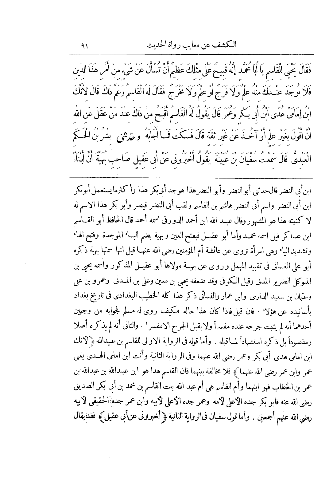 بْنِ أَبِي النَّضْرِ قَالَ حَدَّثَنِي أَبُو النَّضْرِ وأبو النضر هذا هو جَدُّ أَبِي بَكْرٍ هَذَا وَأَكْثَرُ مَا يَسْتَعْمِلُ أَبُو بَكْرِ بْنِ أَبِي النَّضْرِ وَاسْمُ أَبِي النَّضْرِ هَاشِمُ بْنُ الْقَاسِمِ وَلَقَبُ أَبِي النَّضْرِ قَيْصَرُ وَأَبُو بَكْرٍ هَذَا الِاسْمُ لَهُ لَا كُنْيَتُهُ هَذَا هُوَ الْمَشْهُورُ وَقَالَ عَبْدُ اللَّهِ بْنُ أَحْمَدَ الدَّوْرَقِيُّ اسْمُهُ أَحْمَدُ قَالَ الْحَافِظُ أَبُو الْقَاسِمِ بْنُ عَسَاكِرَ قِيلَ اسْمُهُ مُحَمَّدٌ وأما أبو عقيل فبفتح العين وبهية بِضَمِّ الْبَاءِ الْمُوَحَّدَةِ وَفَتْحِ الْهَاءِ وَتَشْدِيدِ الْيَاءِ وَهِيَ امْرَأَةٌ تَرْوِي عَنْ عَائِشَةَ أُمِّ الْمُؤْمِنِينَ رَضِيَ اللَّهُ عَنْهَا قِيلَ إِنَّهَا سَمَّتْهَا بُهَيَّةَ ذَكَرَهُ أَبُو عَلِيٍّ الْغَسَّانِيُّ فِي تَقْيِيدِ الْمُهْمَلِ وَرَوَى عَنْ بُهَيَّةَ مَوْلَاهَا أَبُو عَقِيلٍ الْمَذْكُورُ وَاسْمُهُ يَحْيَى بْنُ الْمُتَوَكِّلِ الضَّرِيرُ الْمَدَنِيُّ وَقِيلَ الْكُوفِيُّ وَقَدْ ضَعَّفَهُ يَحْيَى بْنُ مَعِينٍ وَعَلِيُّ بن المدنى وَعَمْرُو بْنُ عَلِيٍّ وَعُثْمَانُ بْنُ سَعِيدٍ الدَّارِمِيُّ وبن عَمَّارٍ وَالنَّسَائِيُّ ذَكَرَ هَذَا كُلَّهُ الْخَطِيبُ الْبَغْدَادِيُّ فِي تَارِيخِ بَغْدَادَ بِأَسَانِيدِهِ عَنْ هَؤُلَاءِ فَإِنْ قِيلَ فَإِذَا كَانَ هَذَا حَالُهُ فَكَيْفَ رَوَى لَهُ مُسْلِمٌ فَجَوَابُهُ مِنْ وَجْهَيْنِ أَحَدُهُمَا أَنَّهُ لَمْ يَثْبُتُ جَرْحُهُ عِنْدَهُ مُفَسَّرًا وَلَا يُقْبَلُ الْجَرْحُ إِلَّا مُفَسَّرًا وَالثَّانِي أَنَّهُ لَمْ يَذْكُرْهُ أَصْلًا وَمَقْصُودًا بَلْ ذَكَرَهُ اسْتِشْهَادًا لِمَا قَبْلَهُ وَأَمَّا قَوْلُهُ فِي الرِّوَايَةِ الْأُولَى لِلْقَاسِمِ بْنِ عبيد الله (لأنك بن إِمَامَيْ هُدًى أَبِي بَكْرٍ وَعُمَرَ رَضِيَ اللَّهُ عنهما وفى الرواية الثانية وأنت بن امامى الهدى يعنى عمر وبن عُمَرَ رَضِيَ اللَّهُ عَنْهُمَا) فَلَا مُخَالَفَةَ بَيْنَهُمَا فان القاسم هذا هو بْنِ عُبَيْدِ اللَّهِ بْنِ عَبْدِ اللَّهِ بْنِ عُمَرَ بْنِ الْخَطَّابِ فَهُوَ ابْنُهُمَا وَأُمُّ الْقَاسِمِ هِيَ أُمُّ عَبْدِ اللَّهِ بِنْتُ الْقَاسِمِ بْنِ مُحَمَّدِ بْنِ أَبِي بَكْرٍ الصِّدِّيقِ رَضِيَ اللَّهُ عَنْهُ فَأَبُو بَكْرٍ جَدُّهُ الْأَعْلَى لِأُمِّهِ وَعُمَرُ جده الأعلى لأبيه وبن عُمَرَ جَدُّهُ الْحَقِيقِيُّ لِأَبِيهِ رَضِيَ اللَّهُ عَنْهُمْ أَجْمَعِينَ وَأَمَّا قَوْلُ سُفْيَانَ فِي الرِّوَايَةِ الثَّانِيَةِ (أَخْبَرُونِي عَنْ أَبِي عَقِيلٍ) فَقَدْ يُقَالُ