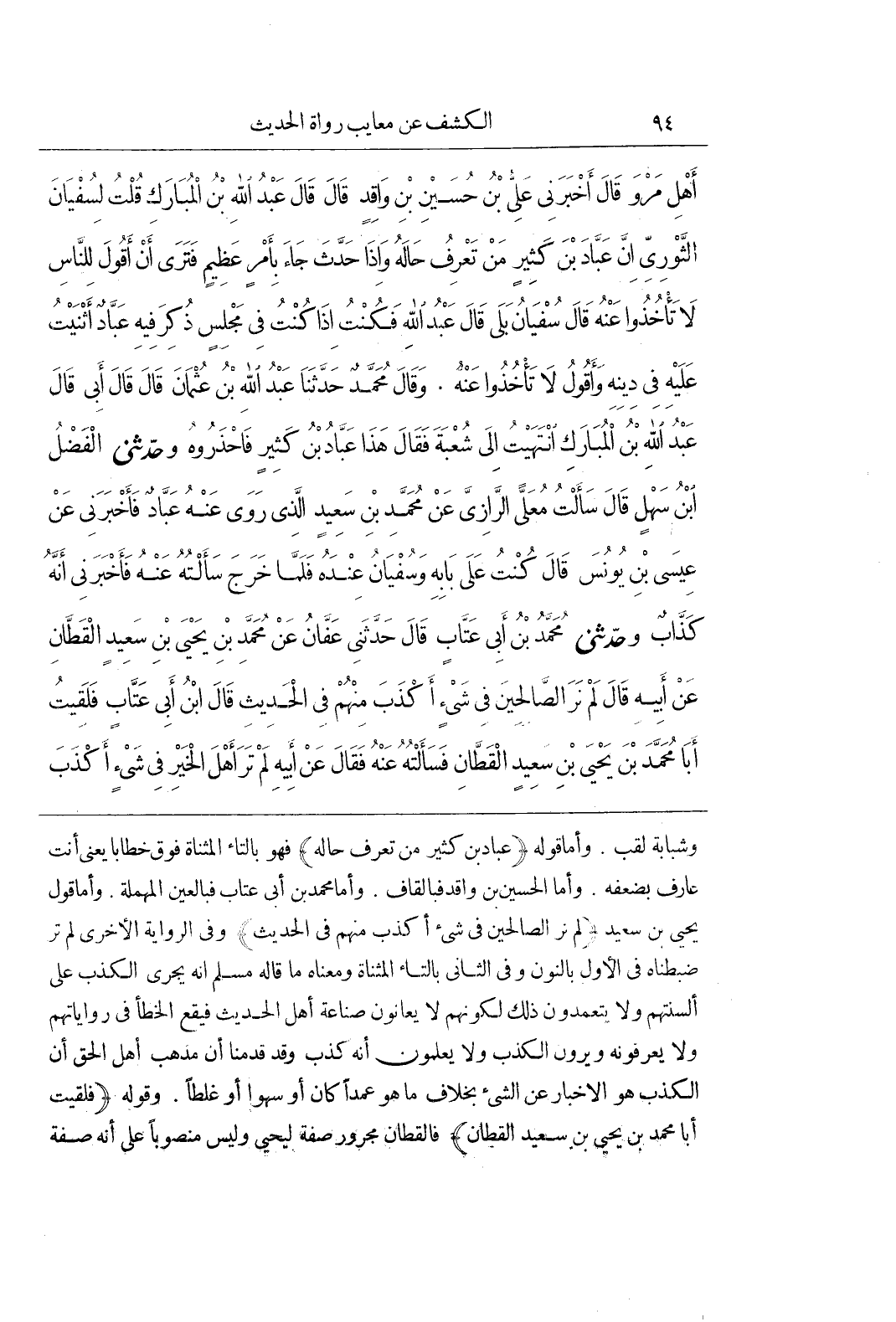 وَشَبَابَةُ لَقَبٌ وَأَمَّا قَوْلُهُ (عَبَّادُ بْنُ كَثِيرٍ مَنْ تَعْرِفُ حَالَهُ) فَهُوَ بِالتَّاءِ الْمُثَنَّاةِ فَوْقُ خِطَابًا يَعْنِي أَنْتَ عَارِفٌ بِضَعْفِهِ وَأَمَّا الْحُسَيْنُ بْنُ وَاقِدٍ فَبِالْقَافِ وَأَمَّا مُحَمَّدُ بْنُ أَبِي عَتَّابٍ فَبِالْعَيْنِ الْمُهْمَلَةِ وَأَمَّا قَوْلُ يَحْيَى بْنِ سَعِيدٍ (لَمْ نَرَ الصَّالِحِينَ فِي شَيْءٍ أَكْذَبَ مِنْهُمْ فِي الْحَدِيثِ) وَفِي الرِّوَايَةِ الْأُخْرَى لَمْ تَرَ ضَبَطْنَاهُ فِي الْأَوَّلِ بِالنُّونِ وَفِي الثَّانِي بِالتَّاءِ الْمُثَنَّاةِ وَمَعْنَاهُ مَا قَالَهُ مُسْلِمٌ أَنَّهُ يَجْرِي الْكَذِبُ عَلَى أَلْسِنَتِهِمْ وَلَا يَتَعَمَّدُونَ ذَلِكَ لِكَوْنِهِمْ لَا يُعَانُونَ صِنَاعَةَ أَهْلِ الْحَدِيثِ فَيَقَعُ الخطأ فى رواياتهم ولا يعرفونه ويرون الْكَذِبَ وَلَا يَعْلَمُونَ أَنَّهُ كَذِبٌ وَقَدْ قَدَّمْنَا أَنَّ مَذْهَبَ أَهْلِ الْحَقِّ أَنَّ الْكَذِبَ هُوَ الْإِخْبَارُ عَنِ الشَّيْءِ بِخِلَافِ مَا هُوَ عَمْدًا كَانَ أَوْ سَهْوًا أَوْ غَلَطًا وَقَوْلُهُ (فَلَقِيتُ أبا مُحَمَّدَ بْنَ يَحْيَى بْنَ سَعِيدٍ الْقَطَّانِ) فَالْقَطَّانُ مَجْرُورٌ صِفَةٌ لِيَحْيَى وَلَيْسَ مَنْصُوبًا عَلَى أَنَّهُ صفة