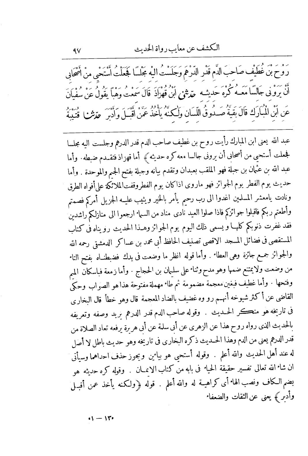 عبد الله يعنى بن مبارك رَأَيْتُ رَوْحَ بْنَ غُطَيْفٍ صَاحِبَ الدَّمُ قَدْرُ الدرهم وجلست إليه مجلسا فجعلت أستحيى مِنْ أَصْحَابِي أَنْ يَرَوْنِي جَالِسًا مَعَهُ كُرْهَ حَدِيثِهِ) أَمَّا قُهْزَاذُ فَتَقَدَّمَ ضَبْطُهُ وَأَمَّا عَبْدُ اللَّهِ بْنُ عُثْمَانَ بْنِ جَبَلَةَ فَهُوَ الْمُلَقَّبُ بعبدان وتقدم بيانه وجبلة بفتح الجيم الموحدة وَأَمَّا حَدِيثُ يَوْمُ الْفِطْرِ يَوْمُ الْجَوَائِزِ فَهُوَ مَا رُوِيَ إِذَا كَانَ يَوْمُ الْفِطْرِ وَقَفَتِ الْمَلَائِكَةُ عَلَى أَفْوَاهِ الطُّرُقِ وَنَادَتْ يَا مَعْشَرَ الْمُسْلِمِينَ اغْدُوا إِلَى رَبٍّ رَحِيمٍ يَأْمُرُ بِالْخَيْرِ وَيُثِيبُ عَلَيْهِ الْجَزِيلَ أَمَرَكُمْ فَصُمْتُمْ وَأَطَعْتُمْ رَبَّكُمْ فَاقْبَلُوا جَوَائِزَكُمْ فَإِذَا صَلَّوْا الْعِيدَ نَادَى مُنَادٍ مِنَ السَّمَاءِ ارْجِعُوا إِلَى مَنَازِلِكُمْ رَاشِدِينَ فَقَدْ غُفِرَتْ ذُنُوبُكُمْ كُلُّهَا وَيُسَمَّى ذَلِكَ الْيَوْمُ يَوْمَ الْجَوَائِزِ وَهَذَا الْحَدِيثُ رُوِّينَاهُ فِي كِتَابِ الْمُسْتَقْصَى فِي فَضَائِلِ الْمَسْجِدِ الْأَقْصَى تَصْنِيفُ الْحَافِظِ أَبِي مُحَمَّدِ بْنِ عَسَاكِرَ الدِّمَشْقِيِّ رَحِمَهُ اللَّهُ وَالْجَوَائِزُ جَمْعُ جَائِزَةٍ وَهِيَ الْعَطَاءُ وَأَمَّا قَوْلُهُ انْظُرْ ما وضعت فى يدك فضبطناه بِفَتْحِ التَّاءِ مِنْ وَضَعْتَ وَلَا يَمْتَنِعُ ضَمُّهَا وَهُوَ مَدْحٌ وَثَنَاءٌ عَلَى سُلَيْمَانَ بْنِ الْحَجَّاجِ وَأَمَّا زَمْعَةَ فَبِإِسْكَانِ الْمِيمِ وَفَتْحِهَا وَأَمَّا غُطَيْفٌ فَبِغَيْنٍ مُعْجَمَةٍ مَضْمُومَةٍ ثُمَّ طَاءٍ مُهْمَلَةٍ مَفْتُوحَةٍ هَذَا هُوَ الصَّوَابُ وَحَكَى الْقَاضِي عَنْ أَكْثَرِ شُيُوخِهِ أَنَّهُمْ رَوَوْهُ غُضَيْفٌ بِالضَّادِ الْمُعْجَمَةِ قَالَ وَهُوَ خَطَأٌ قَالَ الْبُخَارِيُّ فِي تَارِيخِهِ هُوَ مُنْكَرُ الْحَدِيثِ وَقَوْلُهُ صَاحِبُ الدَّمُ قَدْرُ الدِّرْهَمِ يُرِيدُ وَصْفَهُ وَتَعْرِيفَهُ بِالْحَدِيثِ الَّذِي رَوَاهُ رَوْحٌ هَذَا عَنِ الزُّهْرِيِّ عَنْ أَبِي سَلَمَةَ عَنْ أَبِي هُرَيْرَةَ يَرْفَعُهُ تُعَادُ الصَّلَاةُ مِنْ قَدْرِ الدرهم يعنى من الدم وهذ الْحَدِيثُ ذَكَرَهُ الْبُخَارِيُّ فِي تَارِيخِهِ وَهُوَ حَدِيثٌ بَاطِلٌ لَا أَصْلَ لَهُ عِنْدَ أَهْلِ الْحَدِيثِ والله أعلم وقوله أستحي هُوَ بِيَاءَيْنِ وَيَجُوزُ حَذْفُ إِحْدَاهُمَا وَسَيَأْتِي إِنْ شَاءَ اللَّهُ تَعَالَى تَفْسِيرُ حَقِيقَةِ الْحَيَاءِ فِي بَابِهِ مِنْ كِتَابِ الْإِيمَانِ وَقَوْلُهُ كُرْهَ حَدِيثِهِ هُوَ بِضَمِّ الْكَافِ وَنَصْبِ الْهَاءِ أَيْ كَرَاهِيَةً لَهُ وَاللَّهُ أَعْلَمُ قَوْلُهُ (وَلَكِنَّهُ يَأْخُذُ عَمَّنْ أقبل وأدبر) يعنى عن الثقات والضعفاء