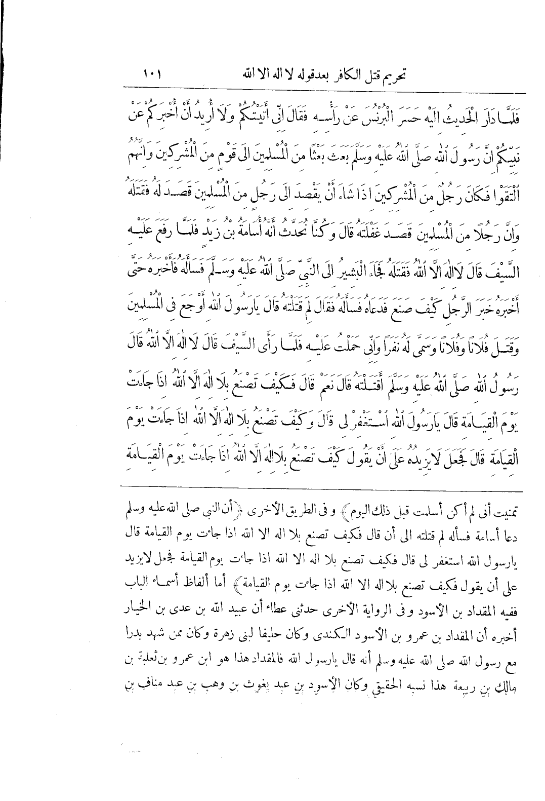 تَمَنَّيْتُ أَنِّي لَمْ أَكُنْ أَسْلَمْتُ قَبْلَ ذَلِكَ الْيَوْمِ) وَفِي الطَّرِيقِ الْأُخْرَى (أَنَّ النَّبِيَّ صَلَّى اللَّهُ عَلَيْهِ وَسَلَّمَ دَعَا أُسَامَةُ فَسَأَلَهُ لِمَ قَتَلْتَهُ إِلَى أَنْ قَالَ فَكَيْفَ تَصْنَعُ بِلَا إِلَهَ إِلَّا اللَّهُ إِذَا جَاءَتْ يَوْمَ الْقِيَامَةِ قَالَ يَا رَسُولَ اللَّهِ اسْتَغْفِرْ لِي قَالَ فكيف بِلَا إِلَهَ إِلَّا اللَّهُ إِذَا جَاءَتْ يَوْمَ الْقِيَامَةِ فَجَعَلَ لَا يَزِيدُ عَلَى أَنْ يَقُولَ فَكَيْفَ تَصْنَعُ بِلَا إِلَهَ إِلَّا اللَّهُ إِذَا جَاءَتْ يَوْمَ الْقِيَامَةِ) أَمَّا أَلْفَاظُ أَسْمَاءِ الْبَابِ فَفِيهِ الْمِقْدَادُ بْنُ الْأَسْوَدِ وَفِي الرِّوَايَةِ الْأُخْرَى حَدَّثَنِي عَطَاءٌ أَنَّ عُبَيْدَ اللَّهِ بْنَ عَدِيِّ بْنِ الْخِيَارِ أَخْبَرَهُ أَنَّ الْمِقْدَادَ بْنَ عَمْرٍو بن الْأَسْوَدِ الْكِنْدِيَّ وَكَانَ حَلِيفًا لِبَنِي زُهْرَةَ وَكَانَ مِمَّنْ شَهِدَ بَدْرًا مَعَ رَسُولِ اللَّهِ صَلَّى اللَّهُ عَلَيْهِ وَسَلَّمَ أَنَّهُ قَالَ يَا رَسُولَ الله فالمقداد هذا هو بن عَمْرِو بْنِ ثَعْلَبَةَ بْنِ مَالِكِ بْنِ رَبِيعَةَ هَذَا نَسَبُهُ الْحَقِيقِيُّ وَكَانَ الْأَسْوَدُ بْنُ عَبْدِ يَغُوثَ بْنِ وَهْبِ بْنِ عَبْدِ مَنَافِ بْنِ