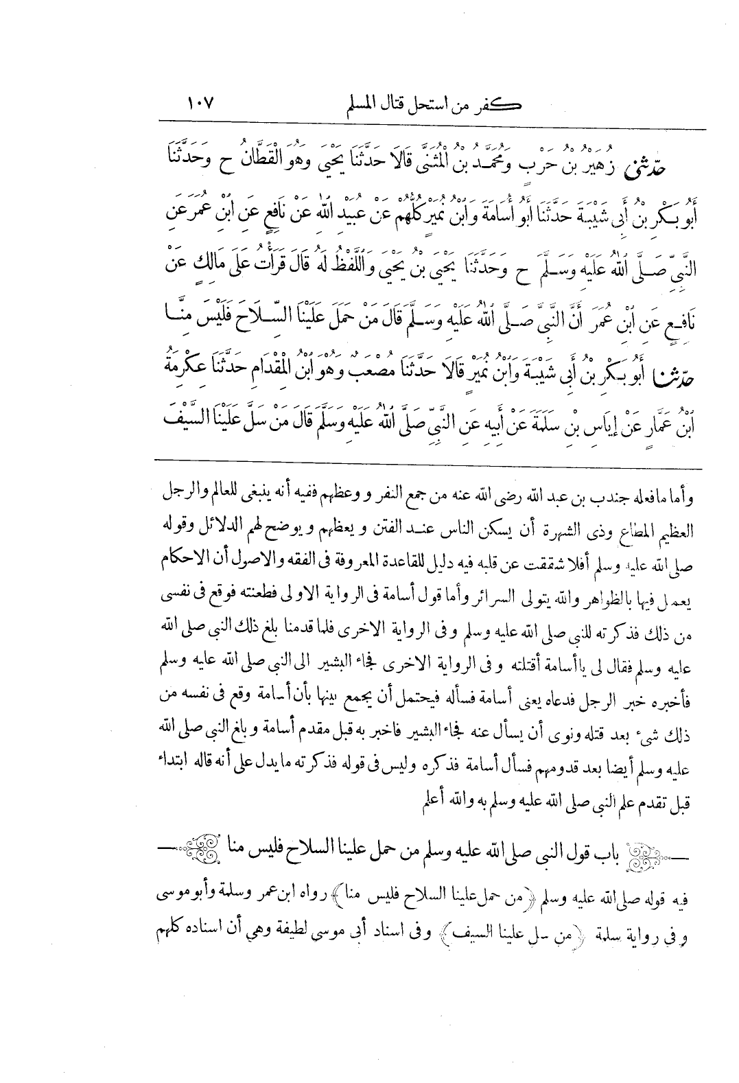 [98] فِيهِ قَوْلُهُ صَلَّى اللَّهُ عَلَيْهِ وَسَلَّمَ (مَنْ حَمَلَ عَلَيْنَا السلاح فليس منا) رواه بن عُمَرَ