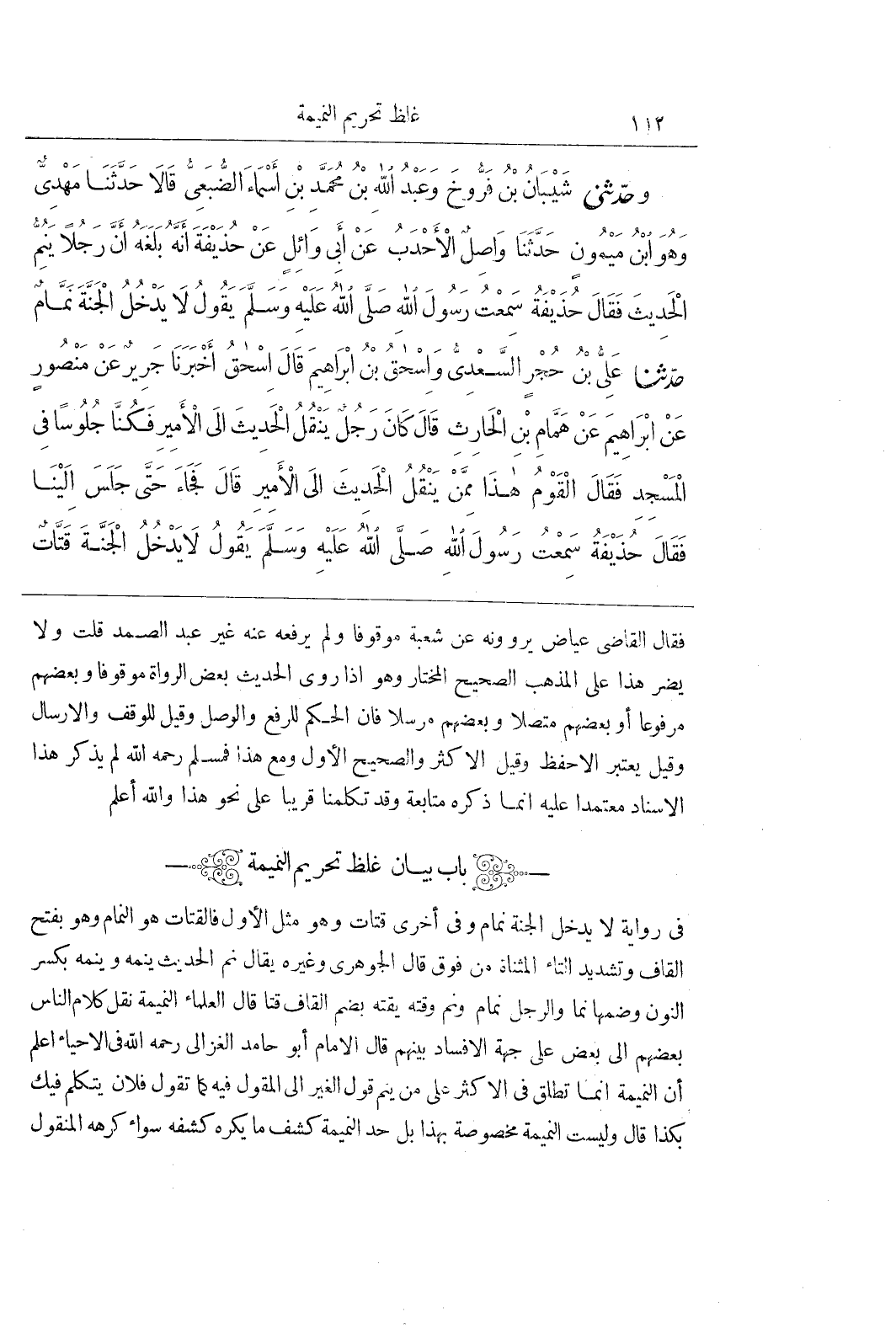 [105] فِي رِوَايَةٍ لَا يَدْخُلُ الْجَنَّةَ نَمَّامٌ وَفِي أُخْرَى قَتَّاتٌ وَهُوَ مِثْلُ الْأَوَّلِ فَالْقَتَّاتُ هُوَ النَّمَامُ وَهُوَ بِفَتْحِ الْقَافِ وَتَشْدِيدِ التَّاءِ الْمُثَنَّاةِ مِنْ فوق قال الْجَوْهَرِيُّ وَغَيْرُهُ يُقَالُ نَمَّ الْحَدِيثَ يَنُمِّهُ وَيَنِمُّهُ بِكَسْرِ النُّونِ وَضَمِّهَا نَمًّا وَالرَّجُلُ نَمَّامٌ وَنَمٌّ وَقَتَّهُ يَقُتُّهُ بِضَمِّ الْقَافِ قَتًّا قَالَ الْعُلَمَاءُ النَّمِيمَةُ نَقْلُ كَلَامِ النَّاسِ بَعْضِهِمْ إِلَى بَعْضٍ عَلَى جِهَةِ الْإِفْسَادِ بَيْنَهُمْ قَالَ الْإِمَامُ أَبُو حَامِدٍ الْغَزَالِيُّ رَحِمَهُ اللَّهُ فِي الْإِحْيَاءِ اعْلَمْ أَنَّ النَّمِيمَةَ إِنَّمَا تُطْلَقُ فِي الْأَكْثَرِ عَلَى مَنْ يَنِمَّ قَوْلَ الْغَيْرِ إِلَى الْمَقُولِ فِيهِ كَمَا تَقُولُ فُلَانٌ يَتَكَلَّمُ فِيكَ بِكَذَا قَالَ وَلَيْسَتِ النَّمِيمَةُ مَخْصُوصَةٌ بِهَذَا بَلْ حَدُّ النَّمِيمَةِ كَشْفُ مَا يُكْرَهُ كَشْفُهُ سَوَاءٌ كَرِهَهُ الْمَنْقُولُ)