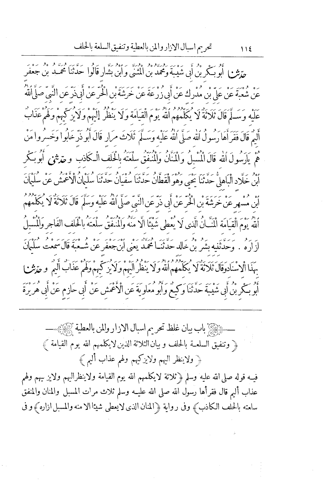 [106] فِيهِ قَوْلُهُ صَلَّى اللَّهُ عَلَيْهِ وَسَلَّمَ (ثَلَاثَةٌ لَا يُكَلِّمُهُمُ اللَّهُ يوم القيامة ولا ينظر إليهم ولا يزكيهم وَلَهُمْ عَذَابٌ أَلِيمٌ قَالَ فَقَرَأَهَا رَسُولُ اللَّهِ صَلَّى اللَّهُ عَلَيْهِ وَسَلَّمَ ثَلَاثَ مَرَّاتٍ الْمُسْبِلُ وَالْمَنَّانُ وَالْمُنْفِقُ سِلْعَتَهُ بِالْحَلِفِ الْكَاذِبِ) وَفِي رِوَايَةٍ (الْمَنَّانُ الَّذِي لَا يُعْطِي شَيْئًا إِلَّا مَنَّهُ وَالْمُسْبِلُ إِزَارَهُ) وَفِي