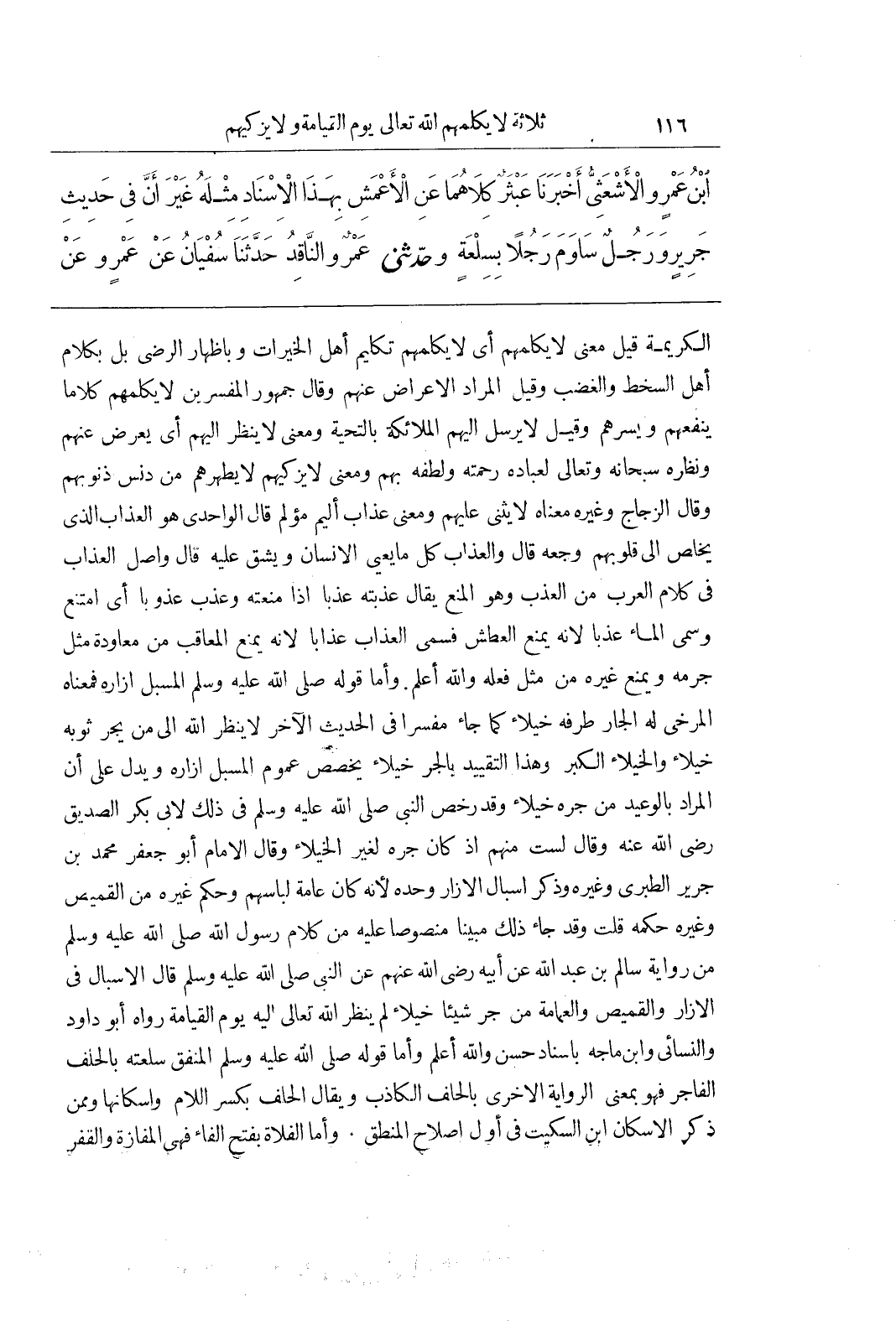الْكَرِيمَةِ قِيلَ مَعْنَى لَا يُكَلِّمُهُمْ أَيْ لَا يكلمهم تكليم أهل الخيرات وباظهار الرضى بَلْ بِكَلَامِ أَهْلِ السُّخْطِ وَالْغَضَبِ وَقِيلَ الْمُرَادُ الْإِعْرَاضُ عَنْهُمْ وَقَالَ جُمْهُورُ الْمُفَسِّرِينَ لَا يُكَلِّمُهُمْ كَلَامًا يَنْفَعُهُمْ وَيَسُرُّهُمْ وَقِيلَ لَا يُرْسِلُ إِلَيْهِمُ الْمَلَائِكَةَ بِالتَّحِيَّةِ وَمَعْنَى لَا يَنْظُرُ إِلَيْهِمْ أَيْ يُعْرِضْ عَنْهُمْ وَنَظَرُهُ سُبْحَانَهُ وَتَعَالَى لِعِبَادِهِ رَحْمَتُهُ وَلُطْفُهُ بِهِمْ وَمَعْنَى لَا يُزَكِّيهِمْ لَا يُطَهِّرُهُمْ مِنْ دَنَسِ ذُنُوبِهِمْ وَقَالَ الزَّجَّاجُ وَغَيْرُهُ مَعْنَاهُ لَا يُثْنِي عَلَيْهِمْ وَمَعْنَى عَذَابٌ أَلِيمٌ مُؤْلِمٌ قَالَ الْوَاحِدِيُّ هُوَ الْعَذَابُ الَّذِي يَخْلُصُ إِلَى قُلُوبِهِمْ وَجَعُهُ قَالَ وَالْعَذَابُ كُلُّ مَا يُعْيِي الْإِنْسَانَ وَيَشُقُّ عَلَيْهِ قَالَ وَأَصْلُ الْعَذَابِ فِي كَلَامِ الْعَرَبِ مِنَ الْعَذْبِ وَهُوَ الْمَنْعُ يُقَالُ عَذَبْتُهُ عَذْبًا إِذَا مَنَعْتُهُ وَعَذُبَ عُذُوبًا أَيِ امْتَنَعَ وَسُمِّيَ الْمَاءُ عَذْبًا لِأَنَّهُ يَمْنَعُ الْعَطَشَ فَسُمِّيَ الْعَذَابُ عَذَابًا لِأَنَّهُ يَمْنَعُ الْمُعَاقَبَ مِنْ مُعَاوَدَةِ مِثْلِ جُرْمِهِ وَيَمْنَعُ غَيْرَهُ مِنْ مِثْلِ فِعْلِهِ وَاللَّهُ أَعْلَمُ وَأَمَّا قَوْلُهُ صَلَّى اللَّهُ عَلَيْهِ وَسَلَّمَ الْمُسْبِلُ إِزَارَهُ فَمَعْنَاهُ الْمُرْخِي لَهُ الْجَارُّ طَرَفَهُ خُيَلَاءً كَمَا جَاءَ مُفَسَّرًا فِي الْحَدِيثِ الْآخَرِ لَا يَنْظُرُ اللَّهُ إِلَى مَنْ يَجُرُّ ثَوْبَهُ خُيَلَاءَ وَالْخُيَلَاءُ الْكِبْرُ وَهَذَا التَّقْيِيدُ بِالْجَرِّ خُيَلَاءَ يُخَصِّصُ عُمُومَ الْمُسْبِلِ إِزَارَهُ وَيَدُلُّ عَلَى أَنَّ الْمُرَادَ بِالْوَعِيدِ مَنْ جَرَّهُ خُيَلَاءَ وَقَدْ رَخَّصَ النَّبِيُّ صَلَّى اللَّهُ عَلَيْهِ وَسَلَّمَ فِي ذَلِكَ لِأَبِي بَكْرٍ الصِّدِّيقِ رَضِيَ اللَّهُ عَنْهُ وَقَالَ لَسْتَ مِنْهُمْ إِذْ كَانَ جَرُّهُ لِغَيْرِ الْخُيَلَاءِ وَقَالَ الْإِمَامُ أَبُو جَعْفَرٍ مُحَمَّدُ بْنُ جَرِيرٍ الطَّبَرِيُّ وَغَيْرُهُ وَذَكَرَ إِسْبَالَ الْإِزَارِ وَحْدَهُ لِأَنَّهُ كَانَ عَامَّةَ لِبَاسِهِمْ وَحُكْمُ غَيْرِهِ مِنْ الْقَمِيصِ وَغَيْرِهِ حُكْمُهُ قُلْتُ وَقَدْ جَاءَ ذَلِكَ مُبَيَّنًا مَنْصُوصًا عَلَيْهِ مِنْ كَلَامِ رَسُولِ اللَّهِ صَلَّى اللَّهُ عَلَيْهِ وَسَلَّمَ مِنْ رِوَايَةِ سَالِمِ بْنِ عَبْدِ اللَّهِ عَنْ أَبِيهِ رَضِيَ اللَّهُ عَنْهُمْ عَنِ النَّبِيِّ صَلَّى اللَّهُ عَلَيْهِ وَسَلَّمَ قَالَ الْإِسْبَالُ فِي الْإِزَارِ وَالْقَمِيصِ وَالْعِمَامَةِ مَنْ جَرَّ شَيْئًا خُيَلَاءَ لَمْ يَنْظُرِ اللَّهُ تَعَالَى إِلَيْهِ يَوْمَ الْقِيَامَةِ رَوَاهُ أَبُو دَاوُدَ والنسائى وبن ماجه باسناد حسن وَاللَّهُ أَعْلَمُ وَأَمَّا قَوْلُهُ صَلَّى اللَّهُ عَلَيْهِ وَسَلَّمَ الْمُنْفِقُ سِلْعَتَهُ بِالْحَلِفِ الْفَاجِرِ فَهُوَ بِمَعْنَى الرِّوَايَةِ الْأُخْرَى بِالْحَلِفِ الْكَاذِبِ وَيُقَالُ الْحَلِفُ بِكَسْرِ اللام واسكانها وممن ذكر الاسكان بن السِّكِّيتِ فِي أَوَّلِ إِصْلَاحِ الْمَنْطِقِ وَأَمَّا الْفَلَاةُ بِفَتْحِ الْفَاءِ فَهِيَ الْمَفَازَةُ وَالْقَفْرُ