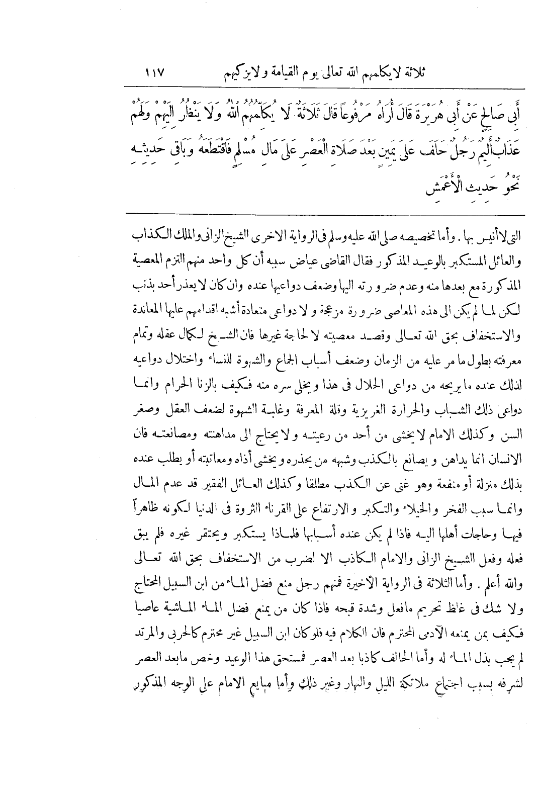 الَّتِي لَا أَنِيسَ بِهَا وَأَمَّا تَخْصِيصُهُ صَلَّى اللَّهُ عَلَيْهِ وَسَلَّمَ فِي الرِّوَايَةِ الْأُخْرَى الشَّيْخَ الزَّانِي وَالْمَلِكَ الْكَذَّابَ وَالْعَائِلَ الْمُسْتَكْبِرَ بِالْوَعِيدِ الْمَذْكُورِ فَقَالَ الْقَاضِي عِيَاضٌ سَبَبُهُ أَنَّ كُلَّ وَاحِدٍ مِنْهُمُ الْتَزَمَ الْمَعْصِيَةَ الْمَذْكُورَةَ مَعَ بُعْدِهَا مِنْهُ وَعَدَمِ ضَرُورَتِهِ إِلَيْهَا وَضَعْفِ دَوَاعِيهَا عِنْدَهُ وَإِنْ كَانَ لَا يُعْذَرُ أَحَدٌ بِذَنْبٍ لَكِنْ لَمَّا لَمْ يَكُنْ إِلَى هَذِهِ الْمَعَاصِي ضَرُورَةٌ مُزْعِجَةٌ ولا دواعى متعادة أَشْبَهَ إِقْدَامُهُمْ عَلَيْهَا الْمُعَانَدَةَ وَالِاسْتِخْفَافَ بِحَقِّ اللَّهِ تَعَالَى وَقَصْدَ مَعْصِيَتِهِ لَا لِحَاجَةٍ غَيْرِهَا فَإِنَّ الشَّيْخَ لِكَمَالِ عَقْلِهِ وَتَمَامِ مَعْرِفَتِهِ بِطُولِ مَا مَرَّ عَلَيْهِ مِنَ الزَّمَانِ وَضَعْفِ أَسْبَابِ الْجِمَاعِ وَالشَّهْوَةِ لِلنِّسَاءِ وَاخْتِلَالِ دَوَاعِيهِ لِذَلِكَ عِنْدَهُ مَا يُرِيحُهُ مِنْ دَوَاعِي الْحَلَالِ فِي هَذَا وَيُخَلِّي سره منه فكيف بالزنى الْحَرَامِ وَإِنَّمَا دَوَاعِي ذَلِكَ الشَّبَابُ وَالْحَرَارَةُ الْغَرِيزِيَّةُ وَقِلَّةُ الْمَعْرِفَةِ وَغَلَبَةُ الشَّهْوَةِ لِضَعْفِ الْعَقْلِ وَصِغَرِ السِّنِّ وَكَذَلِكَ الْإِمَامُ لَا يَخْشَى مِنْ أَحَدٍ مِنْ رَعِيَّتِهِ وَلَا يَحْتَاجُ إِلَى مُدَاهَنَتِهِ وَمُصَانَعَتِهِ فَإِنَّ الْإِنْسَانَ إِنَّمَا يُدَاهِنُ وَيُصَانِعُ بِالْكَذِبِ وَشِبْهِهِ مَنْ يَحْذَرُهُ وَيَخْشَى أَذَاهُ وَمُعَاتَبَتَهُ أَوْ يَطْلُبُ عِنْدَهُ بِذَلِكَ مَنْزِلَةً أَوْ مَنْفَعَةً وَهُوَ غَنِيٌّ عَنِ الْكَذِبِ مُطْلَقًا وَكَذَلِكَ الْعَائِلُ الْفَقِيرُ قَدْ عَدِمَ الْمَالَ وَإِنَّمَا سَبَبُ الْفَخْرِ وَالْخُيَلَاءِ وَالتَّكَبُّرِ وَالِارْتِفَاعِ عَلَى الْقُرَنَاءِ الثَّرْوَةُ فِي الدُّنْيَا لِكَوْنِهِ ظَاهِرًا فِيهَا وَحَاجَاتُ أَهْلِهَا إِلَيْهِ فَإِذَا لَمْ يَكُنْ عِنْدَهُ أَسْبَابُهَا فَلِمَاذَا يَسْتَكْبِرُ وَيَحْتَقِرُ غَيْرَهُ فَلَمْ يَبْقَ فِعْلُهُ وَفِعْلُ الشَّيْخِ الزَّانِي وَالْإِمَامُ الْكَاذِبُ إِلَّا لِضَرْبٍ مِنَ الِاسْتِخْفَافِ بِحَقِّ اللَّهِ تَعَالَى وَاللَّهُ أَعْلَمُ وَأَمَّا الثَّلَاثَةُ فِي الرِّوَايَةِ الْأَخِيرَةِ فَمِنْهُمْ رَجُلٌ مَنَعَ فَضْلَ الْمَاءِ مِنَ بن السَّبِيلِ الْمُحْتَاجِ وَلَا شَكَّ فِي غِلَظِ تَحْرِيمِ مَا فَعَلَ وَشِدَّةِ قُبْحِهِ فَإِذَا كَانَ مَنْ يَمْنَعُ فَضْلَ الْمَاءِ الْمَاشِيَةَ عَاصِيًا فَكَيْفَ بِمَنْ يَمْنَعُهُ الْآدَمِيَّ الْمُحْتَرَمَ فَإِنَّ الْكَلَامَ فِيهِ فَلَوْ كان بن السَّبِيلِ غَيْرَ مُحْتَرَمٍ كَالْحَرْبِيِّ وَالْمُرْتَدِّ لَمْ يَجِبْ بَذْلُ الْمَاءِ لَهُ وَأَمَّا الْحَالِفُ كَاذِبًا بَعْدَ الْعَصْرِ فَمُسْتَحِقٌّ هَذَا الْوَعِيدَ وَخَصَّ مَا بَعْدَ الْعَصْرِ لِشَرَفِهِ بِسَبَبِ اجْتِمَاعِ مَلَائِكَةِ اللَّيْلِ وَالنَّهَارِ وَغَيْرِ ذَلِكَ وَأَمَّا مُبَايِعُ الْإِمَامِ عَلَى الْوَجْهِ المذكور